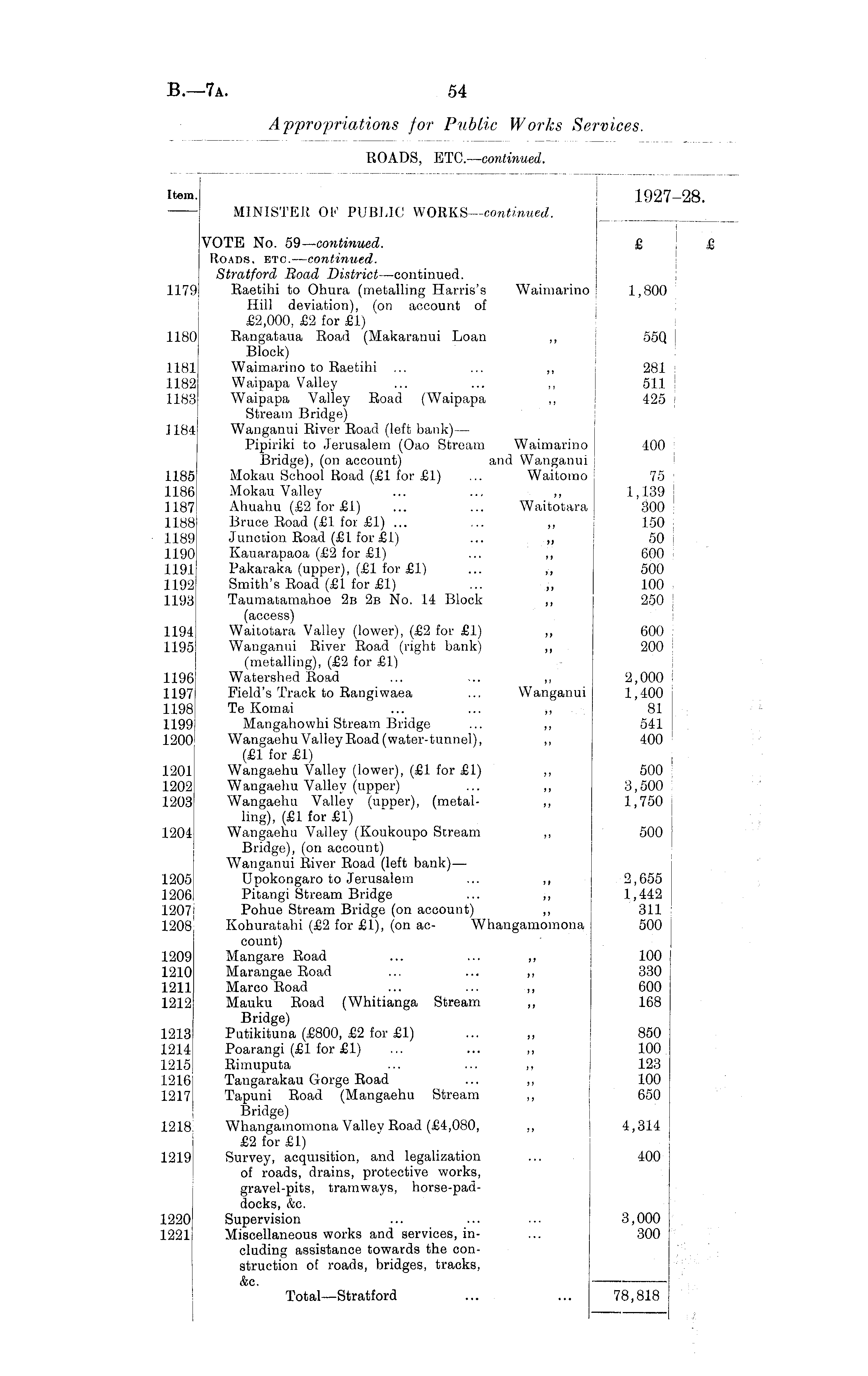 it*™- 1927-28. MINISTER Ol' 1 PUBLIC WORKS—continued. _ I VOTE No. 59 —continued. £ ! £ Roads, etc. —continued. Stratford Road District—continued. 1179 Raetihi to Ohura (metalling Harris's Waimarino 1,800 Hill deviation), (on account of £2,000, £2 for £1) 1180 Rangataua Road (Makaranui Loan ,, ; 55Q Block) 1181 Waimarino to Raetihi ... ... ,, 281 1182 Waipapa Valley ... ... ,, 511 1183 Waipapa Valley Road (Waipapa „ 425 Stream Bridge) 1184 Wanganui River Road (left bank) — Pipiriki to Jerusalem (Oao Stream Waimarino 400 Bridge), (on account) and Wanganui 1185 Mokau School Road (£1 for £1) ... Waitomo 75 1186 Mokau Valley ... ... ,, 1,139 1187 Ahuahu (£2 for £1) ... ... Waitotara 300 1188 Bruce Road (£1 for £1) ... ... „ 150 1189 Junction Road (£1 for £1) ... ,, 50 1190 Kauarapaoa (£2 for £1) ... ,, 600 1191 Pakaraka (upper), (£1 for £1) ... 500 1192 Smith's Road (£1 for £1) ... ,, 100 1193 Taumatamahoe 2b 2b No. 14 Block ,, 250 (access) 1194 Waitotara Valley (lower), (£2 for £1) ,, 600 1195 Wanganui River Road (right bank) ,, 200 (metalling), (£2 for £1) 1196 Watershed Road ... ... ,, 2,000 1197 Field's Track to Rangiwaea ... Wanganui 1,400 1198 Te Komai ... ... ,, 81 1199 Mangahowhi Stream Bridge ... ,, 541 1200 WangaehuValleyRoad(water-tunnel), „ 400 (£1 for £1) j 1201 Wangaehu Valley (lower), (£1 for £1) ,, 500 1202 Wangaehu Valley (upper) ... ,, 3,500 1203 Wangaehu Valley (upper), (metal- „ 1,750 ling), (£1 for £1) 1204 Wangaehu Valley (Koukoupo Stream ,, 500 ; Bridge), (on account) Wanganui River Road (left bank) — 1205 Dpokongaro to Jerusalem ... ,, 2,655 1206 Pitangi Stream Bridge ... ,, 1,442 1207i Pohue Stream Bridge (on account) ,, 311 1208 Kohuratahi (£2 for £1), (on ac- Whangamomona 500 count) 1209 Mangare Road ... ... ,, 100 1210 Marangae Road ... ... ,, 330 1211 Marco Road ... ... ,, 600 1212 Mauku Road (Whitianga Stream „ 168 Bridge) 1213 Putikituna (£800, £2 for £1) ... „ 850 1214 Poarangi (£1 for £1) ... ... ,, 100 1215 Rimuputa ... ... ,, 123 1216 Tangarakau Gorge Road ... ,, 100 1217 Tapuni Road (Mangaehu Stream ,, 650 Bridge) 1218 Whangamomona Vallev Road (£4,080, ,, 4,314 £2 for £1) 1219 Survey, acquisition, and legalization ... 400 of roads, drains, protective works, gravel-pits, tramways, horse-pad-docks, &c. 1220 Supervision ... ... ... 3,000 1221 Miscellaneous works and services, in- ... 300 eluding assistance towards the construction of roads, bridges, tracks, • Total—Stratford ... ... 78,818