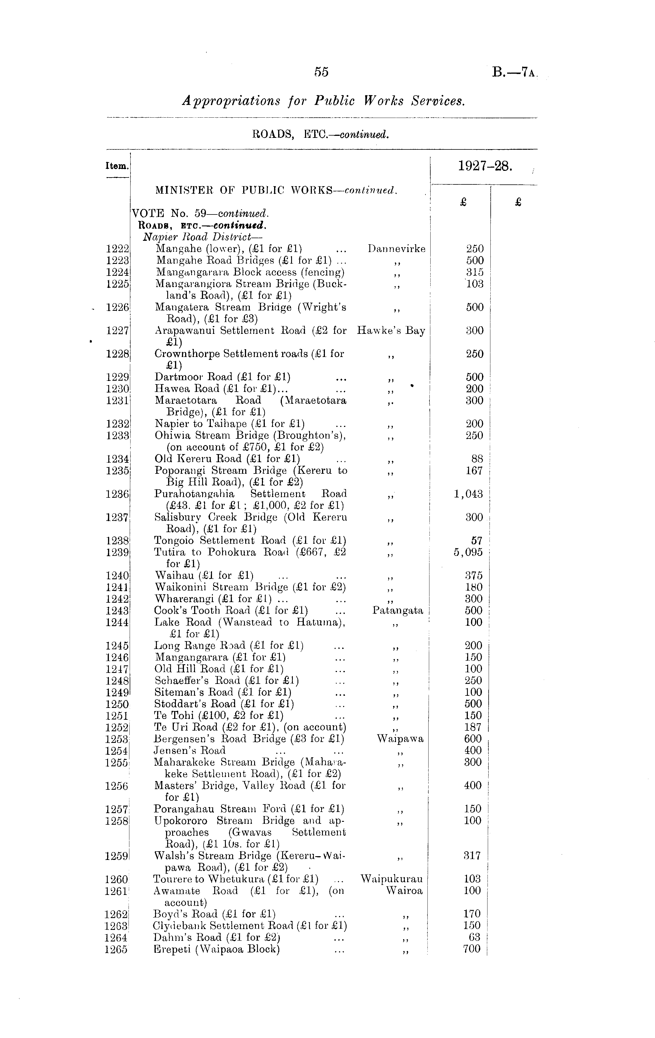 Item. 1927-28. MINISTER OF PUBLIC WORKS —continued. £ £ VOTE No. 59 —continued. Roads, etc. —continued. Napier Road District — 1222 Mangahe (lower), (£1 for £1) ... Dannevirke 250 1223 Mangahe Road Bridges (£1 for £1) ... ,, 500 1224 Mangangarara Block access (fencing) ,, 315 1225 Mangarangiora Stream Bridge (Buck- ,, 103 land's Road), (£1 for £1) 1226 Mangatera Scream Bridge (Wright's ,, 500 Road), (£1 for £3) 1227 Arapawanui Settlement Road (£2 for Hawke's Bay 300 £i) 1228 Crownthorpe Settlement roads (£1 for ,, 250 £1) 1229 Dartmoor Road (£1 for £1) ... ,, 500 1230 Hawea Road (£1 for £1)... ... ,, * 200 1231 Maraetotara Road (Maraetotara ,. 300 Bridge), (£1 for £1) 1232 Napier to Taihape (£1 for £1) ... ,, 200 1233 Ohiwia Stream Bridge (Broughton's), ,, 250 (on account of £750, £1 for £2) 1234 Old Kereru Road (£1 for £1) ... ,, 88 1235 Poporangi Stream Bridge (Kereru to ,, i 167 Big Hill Road), (£1 for £2) 1236 Purahotangahia Settlement) Road ,, 1,043 (£43. £1 for £1; £1,000, £2 for £1) 1237 Salisbury Creek Bridge (Old Kereru ,, 300 Road), (£1 for £1) 1238 Tongoio Settlement Road (£1 for £1) ,, 57 1239 Tutira to Pohokura Road (£667, £2 ,, 5,095 for £1) 1240 Waihau (£1 for £1) ... ... ,, 375 1241 Waikonini Stream Bridge (£1 for £2) ,, 180 1242 Wharerangi (£1 for £1) ... ... ,, 300 1243 Cook's Tooth Road (£1 for £1) ... Patangata 500 j 1244 Lake Road (Wanstead to Hatuma), ,, 100 £1 for £1) 1245 Long Range Road (£1 for £1) ... ,, 200 1246 Mangangarara (£1 for £1) ... ,, 150 1247 Old Hill Road (£1 for £1) ... ,, 100 1248 Schaeffer's Road (£1 for £1) ... ,, 250 1249 Siteman's Road (£1 for £1) ... ,, 100 1250 Stoddart's Road (£1 for £1) ... ,, 500 1251 Te Tohi (£100, £2 for £1) ... „ 150 1252 Te Qri Road (£2 for £1), (on account) ,, 187 1253 Bergensen's Road Bridge (£3 for £1) Waipawa 600 1254 Jensen's Road ... ... ,, 400 1255 Maharakeke Stream Bridge (Mahara- ,, 300 keke Settlement Road), (£1 for £2) 1256 Masters' Bridge, Valley Road (£1 for ,, 400 for £1) 1257 Porangahau Stream Ford (£1 for £1) ,, 150 1258 Upokororo Stream Bridge and ap- ,, 100 proaches (Gwavas Settlement Road), (£1 10s. for £1) 1259 Walsh's Stream Bridge (Kereru-Wai- ,, 317 pawa Road), (£1 for £2) 1260 Tourere to Whetukura (£1 for £1) ... Waipukurau 103 1261 Awamate Road (£1 for £1), (on Wairoa 100 account) 1262 Boyd's Road (£1 for £1) ... ,, 170 1263 Clydebank Settlement Road (£1 for £1) ,, 150 1264 Dahm's Road (£1 for £2j ... ,, 63 1265 Brepeti (Waipaoa Block) ... ,, 700