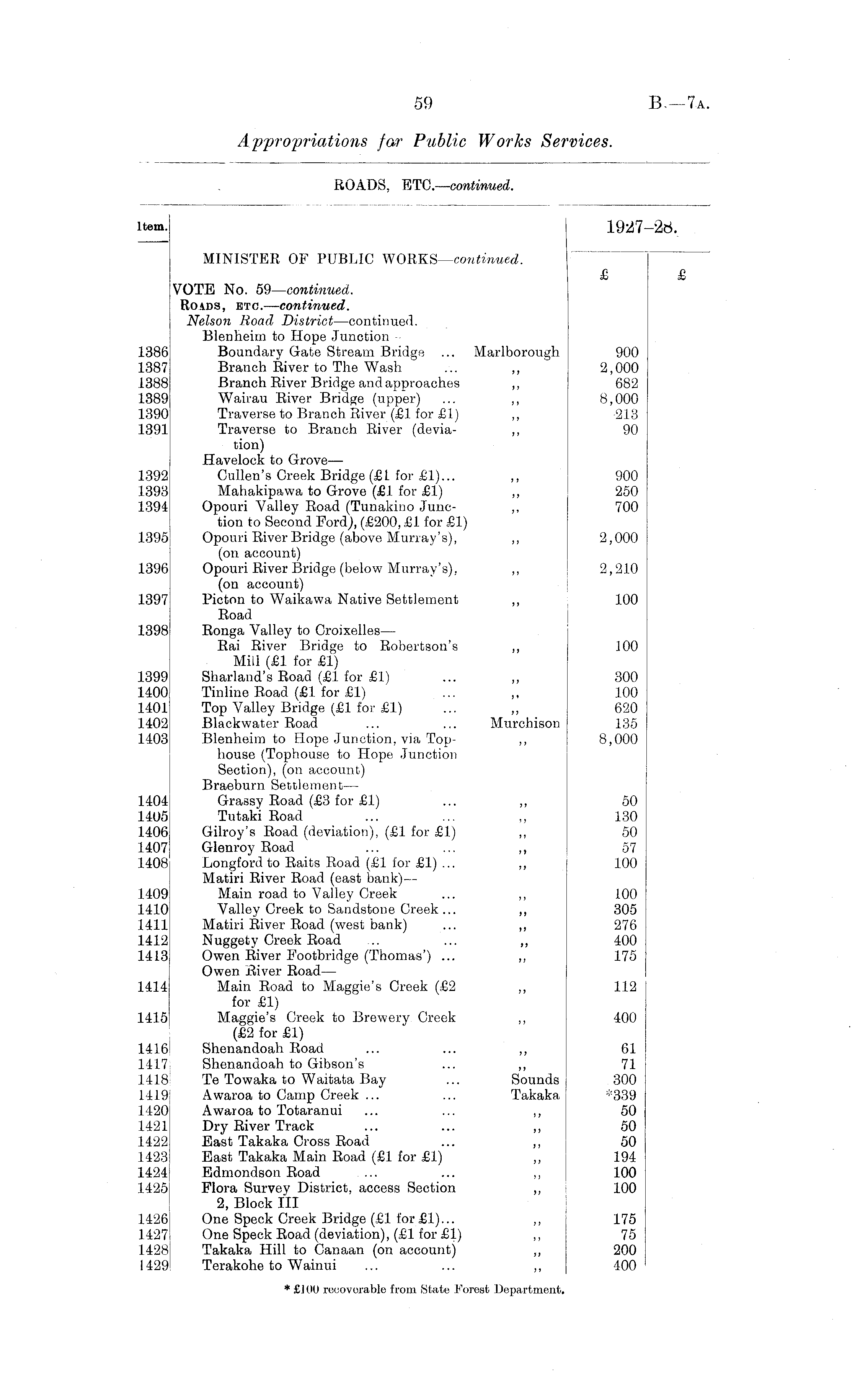 Item. 1927-28. MINISTER OF PUBLIC WORKS—continued. £ £ VOTE No. 59—continued. Roids, etc. —continued. Nelson Road District—continued. Blenheim to Hope Junction 1386 Boundary Gate Stream Bridge ... Marlborough 900 1387 Branch River to The Wash ... ,, 2,000 .1388 Branch River Bridge and approaches ,, 682 1389 Wairau River Bridge (upper) ... ,, 8,000 1390 Traverse to Branch River (£1 for £1) ,, 213 1391 Traverse to Branch River (devia- ,, 90 tion) JBavelock to Grove— 1392 Cullen's Creek Bridge (£L for £1)... ,, 900 1393 Mahakipawa to Grove (£1 for £1) ,, 250 1394 Opouri Valley Road (Tunakino June- ,, 700 tion to Second Ford), (£200, £1 for £1) 1395 Opouri River Bridge (above Murray's), ,, 2,000 (on account) 1396 Opouri River Bridge (below Murray's), ,, 2,210 (on account) 1397 Picton to Waikawa Native Settlement ,, 100 Road 1398 Ronga Valley to Croixelles— Rai River Bridge to Robertson's ,, 100 Mill (£1 for £1) 1399 Sharland's Road (£1 for £1) ... ,, 300 1400 Tinline Road (£1 for £1) ... ,, 100 1401 Top Valley Bridge (£1 for £1) ... ,, 620 1402 Blackwater Road ... ... Murchison 135 1403 Blenheim to Hope Junction, via Top- ,, 8,000 house (Tophouse to Hope .Junction Section), (on account) Braeburn Settlement — 1404 Grassy Road (£3 for £1) ... ,, 50 1405 Tutaki Road ... ... ,, 130 1406 Gilroy's Road (deviation), (£1 for £1) ,, 50 1407 Glenroy Road ... ... ,, 57 1408 Longford to Raits Road (£1 for £1) ... ,, 100 Matiri River Road (east bank) — 1409 Main road to Valley Creek ... ,, 100 1410 Valley Creek to Sandstone Creek... ,, 305 1411 Matiri River Road (west bank) ... ,, 276 1412 Nuggety Creek Road ... ... ,, 400 1413 Owen River Footbridge (Thomas') ... ,, 175 Owen River Road— 1414 Main Road to Maggie's Creek (£2 ,, 112 for £1) 1415 Maggie's Creek to Brewery Creek ,, 400 (£2 for £1) 1416 Shenandoah Road ... ... ,, 61 1417 Shenandoah to Gibson's ... ,, 71 1418 Te Towaka to Waitata Bay ... Sounds 300 1419 Awaroa to Camp Creek ... ... Takaka *339 1420 Awaroa to Totaranui ... ... ,, 50 1421 Dry River Track ... ... ,, 50 1422 Bast Takaka Cross Road ... ,, 50 1423 East Takaka Main Road (£1 for £1) ,, 194 1424 Edmondson Road ... ... ,, 100 1425 Flora Survey District, access Section ,, 100 2, Block III 1426 One Speck Creek Bridge (£1 for £1)... ,, 175 1427 One Speck Road (deviation), (£1 for £1) ,, 75 1428 Takaka Hill to Canaan (on account) ,, 200 1429 Terakohe to Wainui ... ... ,, 400 * £] 00 recoverable from State Forest Department.