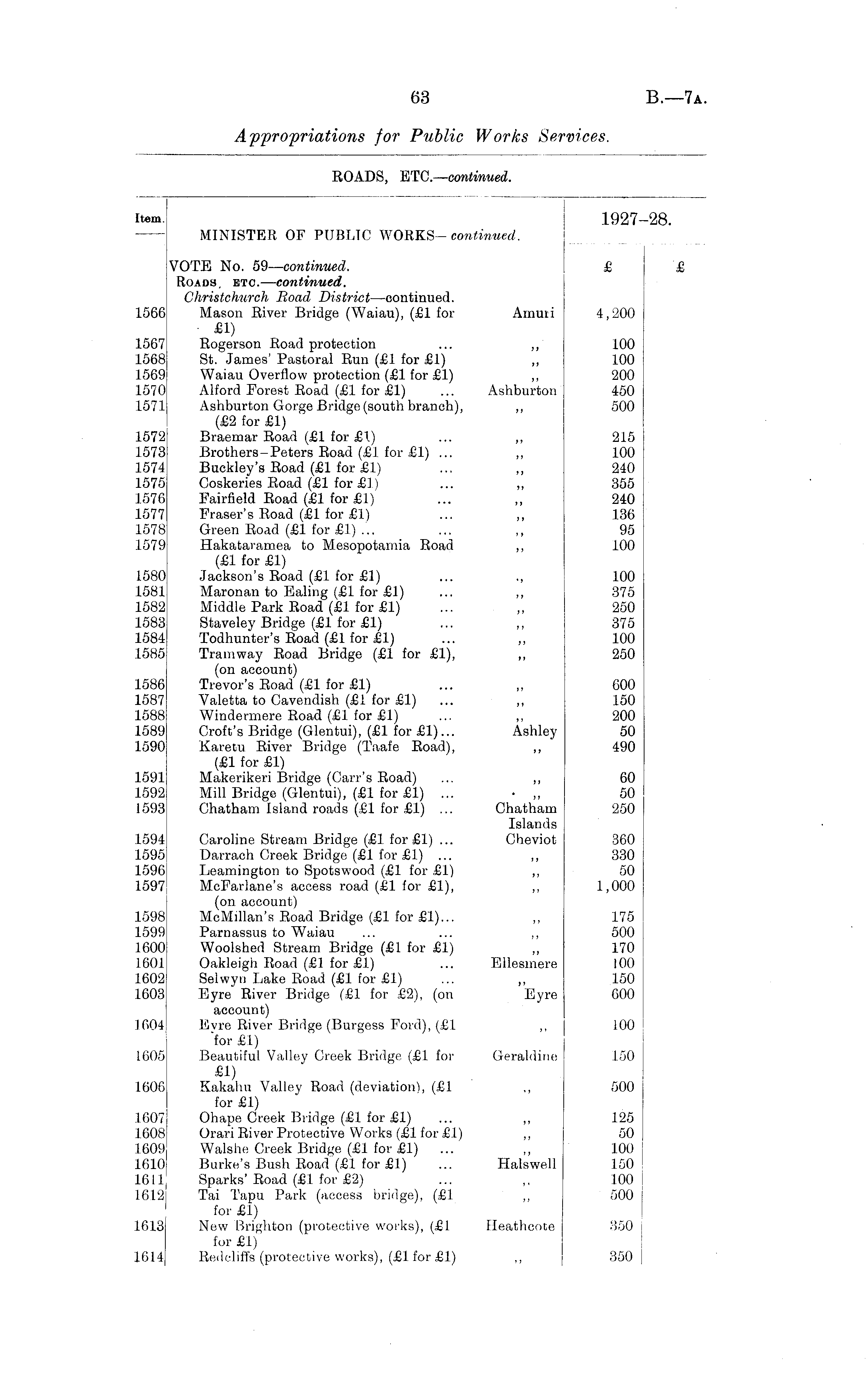 Item. 1927-28. MINISTER OF PUBLIC WORKS— continued. VOTE No. 59—continued. £ £ Roads, etc. —continued. Christchurch Road District—continued. 1566 Mason River Bridge (Waiau), (£1 for Amuri 4,200 ■ £i) 1567 Rogerson Road protection ... „ 100 1568 St. James' Pastoral Run (£1 for £1) ,, 100 1569 Waiau Overflow protection (£1 for £1) ,, 200 1570 Alford Forest Road (£1 for £1) ... Ashburton 450 1571 Ashburton Gorge Bridge (south branch), ,, 500 (£2 for £1) 1572 Braemar Road (£1 for £1) ... ,, 215 1573 Brothers-Peters Road (£1 for £1) ... ,, 100 1574 Buckley's Road (£1 for £1) ... ,, 240 1575 Coskeries Road (£1 for £1) ... ,, 355 1576 Fairfield Road (£1 for £1) ... ,, 240 1577 Fraser's Road (£1 for £1) ... ,, 136 1578 Green Road (£1 for £1) ... ... ,, 95 1579 Hakataramea to Mesopotamia Road ,, 100 (£1 for £1) 1580 Jackson's Road (£1 for £1) ... ., 100 1581 Maronan to Ealing (£1 for £1) ... ,, 375 1582 Middle Park Road (£1 for £1) ... ,, 250 1583 Staveley Bridge (£1 for £1) ... ,, 375 1584 Todhunter's Road (£1 for £1) ... ,, 100 1585 Tramway Road Bridge (£1 for £1), ,, 250 (on account) 1586 Trevor's Road (£1 for £1) ... ,, 600 1587 Yaletta to Cavendish (£1 for £1) ... ,, 150 1588 Windermere Road (£1 for £1) ... ,, 200 1589 Croft's Bridge (Glentui), (£1 for £1)... Ashley 50 1590 Karecu River Bridge (Taafe Road), ,, 490 (£1 for £1) 1591 Makerikeri Bridge (Carr's Road) ... ,, 60 1592 Mill Bridge (Glentui), (£1 for £1) ... ,, 50 1593 Chatham Island roads (£1 for £1) ... Chatham 250 Islands 1594 Caroline Stream Bridge (£1 for £1) ... Cheviot 360 1595 Darrach Creek Bridge (£1 for £1) ... ,, 330 1596 Leamington to Spotswood (£1 for £1) ,, 50 1597 McFarlane's access road (£1 for £1), ,, 1,000 (on account) 1598 McMillan's Road Bridge (£1 for £1)... ,, 175 1599 Parnassus to Waiau ... ... ,, 500 1600 Woolshed Stream Bridge (£1 for £1) ,, 170 1601 Oakleigh Road (£1 for £1) ... Ellesmere 100 1602 Selwyn Lake Road (£1 for £1) ... ,, 150 1603 Eyre River Bridge (£1 for £2), (on Eyre GOO account) 1604 Byre River Bridge (Burgess Ford), (£1 ,, 100 for £1) 1605 Beautiful Valley Creek Bridge (£1 for Geraldine 150 £1) 1606 Kakahu Valley Road (deviation), (£1 ,, 500 for £1) .1607 Ohape Creek Bridge (£1 for £1) ... ,, 125 1608 Orari River Protective Works (£1 for £1) ,, 50 1609 Walshe Creek Bridge (£1 for £1) ... ,, 100 1610 Burke's Bush Road (£1 for £1) ... Halswell 150 1611, Sparks' Road (£1 for £2) ... ,, 100 16121 Tai Tapu Park (access bridge), (£1 ,, 500 for £1) 1613 New Brighton (protective works), (£1 Fleathcote 350 for £1) 1614 Redcliffs (protective works), (£1 for £1) ,, | 350