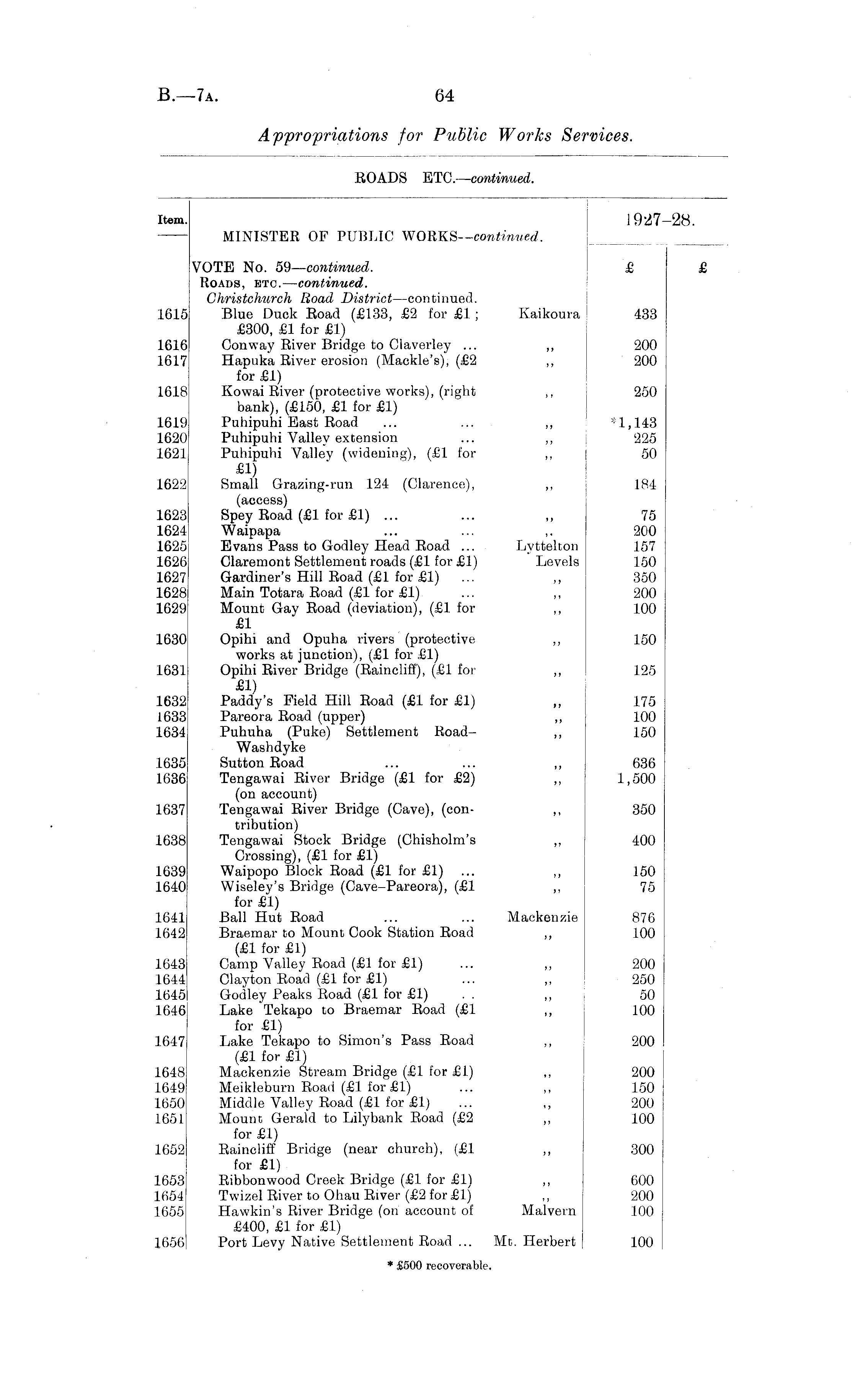 Item. 1927—28. MINISTER OF PUBLIC WORKS—continued. __ VOTE No. 59—continued. £ £ Roads, eto. —continued. Ghristchurch Road District —continued. 1615 Blue Duck Road (£133, £2 for £1 ; Kaikoura 433 £300, £1 for £1) 1616 Conway River Bridge to Ciaverley ... ,, 200 1617 Hapuka River erosion (Maekle's), (£2 ,, 200 for £1) 1618 Kowai River (protective works), (right ,, 250 bank), (£150, £1 for £1) 1619 Puhipuhi East Road ... ... ,, *1,143 1620 Puhipuhi Valley extension ... ,, 225 1621 Puhipuhi Valley (widening), (£1 for ,, 50 £1) 1622 Small Grazing-run 124 (Clarence), ,, 184 (access) 1623 Spey Road (£1 for £1) ... ... ,, 75 1624 Waipapa ... ... 200 1625 Evans Pass to Godley Head Road ... Lvttelton 157 1626 Claremont Settlement roads (£1 for £1) Levels 150 1627 Gardiner's Hill Road (£1 for £1) ... ,, 350 1628 Main Totara Road (£1 for £1) ... ,, 200 1629 Mount Gay Road (deviation), (£1 for ,, 100 £1 1630 Opihi and Opuha rivers (protective ,, 150 works at junction), (£1 for £1) 1631 Opihi River Bridge (Raincliff), (£1 for ,, 125 £1) 1632 Paddy's Field Hill Road (£1 for £1) ,, 175 1633 Pareora Road (upper) ,, 100 1634 Puhuha (Puke) Settlement Road- ,, 150 Washdyke 1635 Sutton Road ... ... ,, 636 1636 Tengawai River Bridge (£1 for £2) ,, 1,500 (on account) 1637 Tengawai River Bridge (Cave), (con- ,, 350 tribution) 1638 Tengawai Stock Bridge (Chisholm's ,, 400 Crossing), (£1 for £1) 1639 Waipopo Block Road (£1 for £1) ... ,, 150 1640 Wiseley's Bridge (Cave-Pareora), (£1 ,, 75 for £1) 1641 Ball Hut Road ... ... Mackenzie 876 1642 Braemar to Mount Cook Station Road ,, 100 (£1 for £1) 1643 Camp Valley Road (£1 for £1) ... ,, 200 1644 Clayton Road (£1 for £1) ... ,, 250 1645 Godley Peaks Road (£1 for £1) . . ,, 50 1646 Lake Tekapo to Braemar Road (£1 ,, 100 for £1) 1647 Lake Tekapo to Simon's Pass Road ,, 200 (£1 for £1) 1648 Mackenzie Stream Bridge (£1 for £1) ,, 200 1649 Meikleburn Road (£1 for £1) ... ,, 150 1650 Middle Valley Road (£1 for £1) ... ,, 200 1651 Mount Gerald to Lilybank Road (£2 „ 100 for £1) 1652 Raincliff Bridge (near church), (£1 ,, 300 for £1) 1653 Ribbonwood Creek Bridge (£1 for £1) ,, 600 1654 Twizel River to Ohau River (£2 for £1) ,, 200 1655 Hawkin's River Bridge (on account of Malvern 100 £400, £1 for £1) 1656 Port Levy Native Settlement Road ... Mt. Herbert 100 * £500 recoverable.