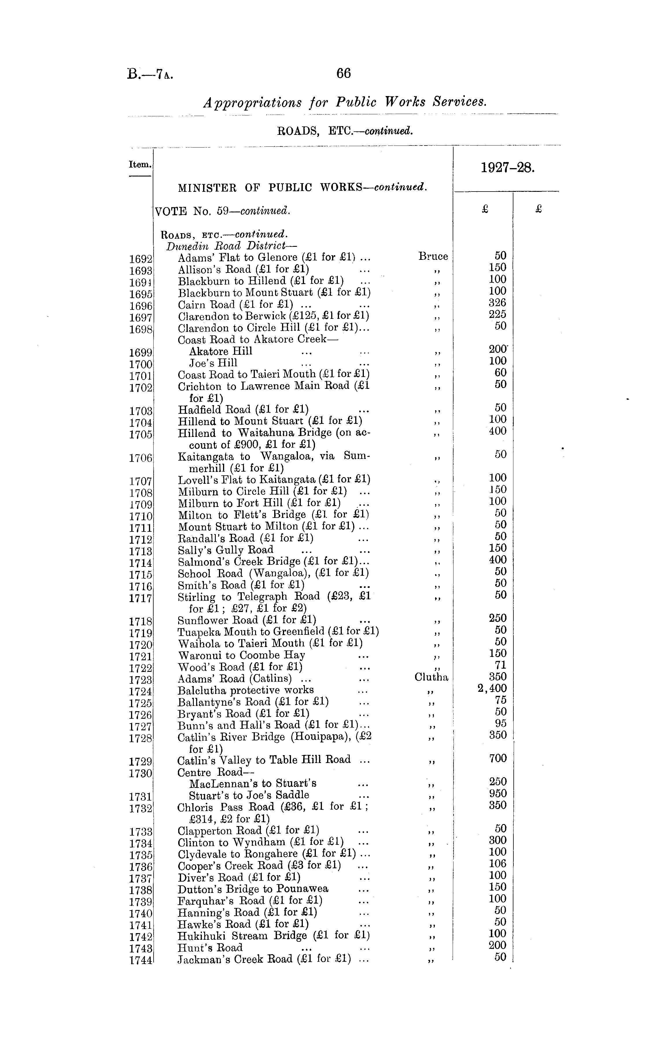 Item - 1927-28. MINISTER OF PUBLIC WORKS—continued. VOTE No. 59—continued. £ £ Roads, etc. —continued. Dunedin Road District — 1692 Adams' Flat to Glenore (£1 for £1") ... Bruce 50 1693 Allison's Road (£1 for £1) ... ,, 150 169! Blackburn to Hillend (£1 for £1) ... ,, 100 1695 Blackburn to Mount Stuart (£1 for £1) „ 100 1696 Cairn Road (£1 for £1) ... ... ,, 326 1697 Clarendon to Berwick (£125, £1 for £1) ,, 225 1698 Clarendon to Circle Hill (£1 for £1)... ,, 50 Coast Road to Akatore Creek— 1699 Akatore Hill ... ... ,, 200 1700 Joe's Hill ... ... 100 1701 Coast Road to Taieri Mouth (£1 for £1) ,, 60 1702 Crichton to Lawrence Main Road (£1 ,, 50 for £1) 1703 Hadfield Road (£1 for £1) ... „ 50 1704 Hillend to Mount Stuart (£1 for £1) ,, 100 1705 Hillend to Waitahuna Bridge (on ac- ,, 400 count of £900, £1 for £1) 1706 Kaitangata to Wangaloa, via Sum- ,, 50 merhill (£1 for £1) 1707 Lovell's Flat to Kaitangata (£1 for £1) ,, 100 1708 Milburn to Circle Hill (£1 for £1) ... ,, 150 1709 Milburn to Fort Hill (£1 for £1) ... ,, 100 1710 Milton to Flett's Bridge (£1 for £1) ,, 50 1711 Mount Stuart to Milton (£1 for £1) ... ,, 50 1712 Randall's Road (£1 for £1) ... ,, 50 1713 Sally's Gully Road ... ... ,, 150 1714 Salmond's Creek Bridge (£1 for £1)... ,, 400 1715 School Road (Wangaloa), (£1 for £1) 50 1716 Smith's Road (£1 for £1) ... ,, 50 1717 Stirling to Telegraph Road (£23, £1 ,, 50 for £1; £27, £1 for £2) 1718 Sunflower Road (£1 for £1) ... ,, 250 1719 Tuapeka Mouth to Greenfield (£1 for £1) ,, 50 1720 Waihola to Taieri Mouth (£1 for £1) ,, 50 1721 Waronui to Coombe Hay ... ,, 150 1722 Wood's Road (£1 for £1) ... „ 71 1723 Adams' Road (Catlins) ... ... Clutha 350 1724 Balclutha protective works ... ,, 2,400 1725 Ballantyne's Road (£1 for £1) ... ,, 75 1726 Bryant's Road (£1 for £1) ... ,, 50 1727 Bunn's and Hall's Road (£1 for £1)... ,, 95 1728 Catlin's River Bridge (Houipapa), (£2 ,, ; 350 for £1) 1729 Catlin's Valley to Table Hill Road ... ,, 700 1730 Centre Road— MacLennan's to Stuart's ... ,, 250 1731 Stuart's to Joe's Saddle ... ,, 950 1732 Chloris Pass Road (£36, £1 for £1; ,, 350 £314, £2 for £1) 1733 Clapperton Road (£1 for £1) ... ,, 50 1734 Clinton to Wyndham (£1 for £1) ... ,, 300 1735 Clydevale to Rongahere (£1 for £1) ... ,, 100 1736 Cooper's Creek Road (£3 for £1) ... ,, 106 1737 Diver's Road (£1 for £1) ... ,, 100 1738 Dutton's Bridge to Pounawea ... ,, 150 1739 Farquhar's Road (£1 for £1) ... ,, 100 1740 Hanning's Road (£1 for £1) ... ,, 50 1741 Hawke's Road (£1 for £1) ... ,, 50 1742 Hukihuki Stream Bridge (£1 for £1) „ 100 1743 Hunt's Road ... ... >> 200 1744 Jackman's Creek Road (£1 for £1) ... ,, 50