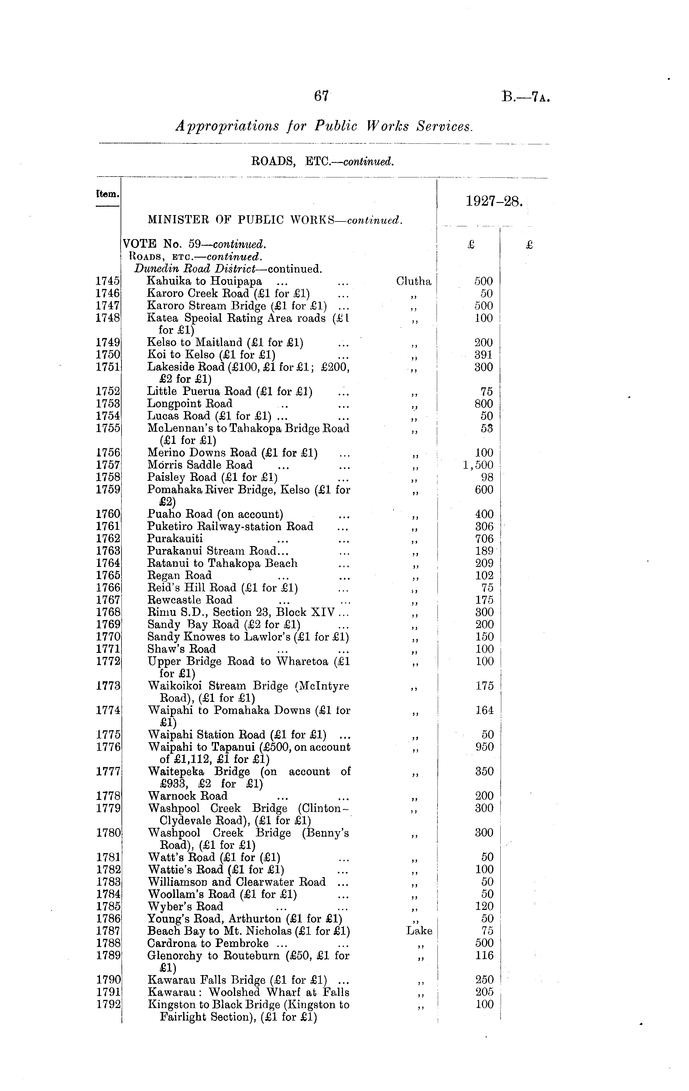 1927-28. MINISTER OF PUBLIC WORKS—continued. VOTE No. 59—continued. £ £ Roads, etc. —continued. Dunedin Boad District—continued. 1745 Kahuika to Houipapa ... ... Clutha 500 1746 Karoro Creek Road (£1 for £1) ... ,, 50 1747 Karoro Stream Bridge (£1 for £1) ... „ 500 1748 Katea Speoial Rating Area roads (£1 ,, 100 for £1) 1749 Kelso to Maitland (£1 for £1) ... ,, 200 1750 Koi to Kelso (£1 for £1) ... „ 391 1751 Lakeside Road (£100, £1 for £1; £200, „ 300 £2 for £1) 1752 Little Puerua Road (£1 for £1) ... ,, 75 1753 Longpoint Road .. ... ,, 800 1754 Lucas Road (£1 for £1) ... ... „ 50 1755 McLennan's to Tahakopa Bridge Road ,, 53 (£1 for £1) 1756 Merino Downs Road (£1 for £1) ... ,, 100 1757 Morris Saddle Road ... ... ,, 1,500 1758 Paisley Road (£1 for £1) ... ,, 98 1759 Pomahaka River Bridge, Kelso (£1 for ,, 600 £2) 1760 Puaho Road (on account) ... ,, 400 1761 Puketiro Railway-station Road ... ,, 306 1762 Purakauiti ... ... ,, 706 1763 Purakanui Stream Road... ... ,, 189 1764 Ratanui to Tahakopa Beach ... ,, 209 1765 Regan Road ... ... ,, 102 1766 Reid's Hill Road (£1 for £1) ... ,, 75 1767 Rewcastle Road ... ... ,, 175 1768 Rimu S.D., Section 23, Block XIV ... „ 300 1769 Sandy Bay Road (£2 for £1) ... ,, 200 1770 Sandy Knowes to Lawlor's (£1 for £1) ,, 150 1771 Shaw's Road ... ... ,, 100 1772 Upper Bridge Road to Wharetoa (£1 ,, 100 for £1) 1773 Waikoikoi Stream Bridge (Mclntyre ,, 175 Road), (£1 for £1) 1774 Waipahi to Pomahaka Downs (£1 for ,, 164 £i) 1775 Waipahi Station Road (£1 for £1) ... ,, 50 1776 Waipahi to Tapanui (£500, on account „ 950 of £1,112, £1 for £1) 1777 Waitepeka Bridge (on account of ,, 350 £933, £2 for £1) 1778 Warnock Road ... ... ,, 200 1779 Washpool Creek Bridge (Clinton- ,, 300 Clydevale Road), (£1 for £1) 1780 Washpool Creek Bridge (Benny's ,, 300 Road), (£1 for £1) 1781 Watt's Road (£1 for (£1) ... „ 50 1782 Wattie's Road (£1 for £1) ... ,, 100 1783 Williamson and Clearwater Road ... ,, 50 1784 Woollam's Road (£1 for £1) ... „ 50 1785 Wyber's Road ... ... ,, 120 1786 Young's Road, Arthurton (£1 for £1) ,, 50 1787 Beach Bay to Mt. Nicholas (£1 for £1) Lake 75 1788 Cardrona to Pembroke ... ... ,, 500 1789 Glenorchy to Routeburn (£50, £1 for ,, 116 £1) 1790 Kawarau Falls Bridge (£1 for £1) ... ,, 250 1791 Kawarau: Woolshed Wharf at Falls ,, 205 1792 Kingston to Black Bridge (Kingston to ,, 100 Fairlight Section), (£1 for £1)