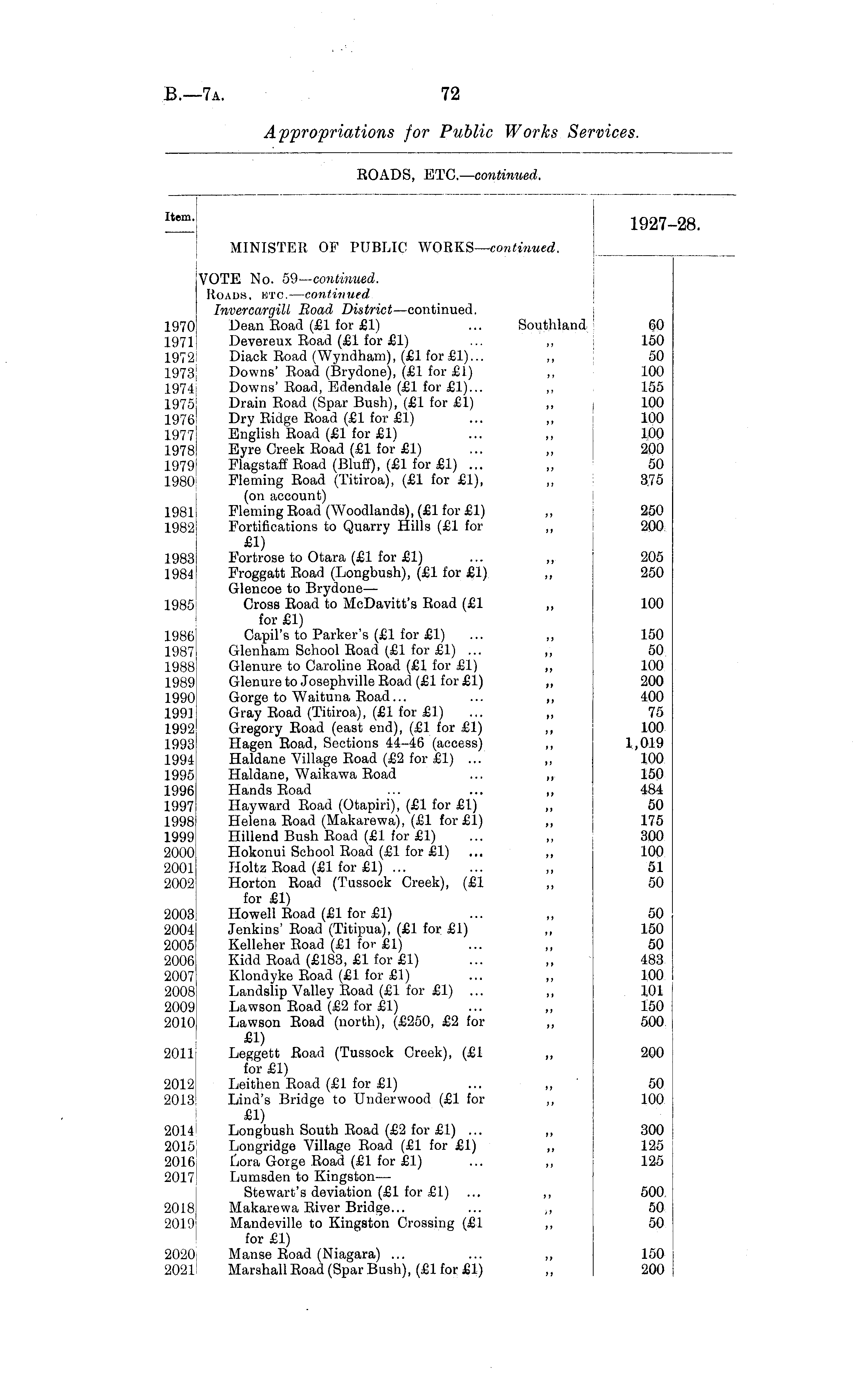 Item " 1927-28. MINISTER OF PUBLIC WORKS—continued. VOTE No. 59 —-continued. Roads, etc. —continued Invercargill Road District—continued. 1970 Dean Road (£1 for £1) ... Southland 50 1971 Devereux Road (£1 for £1) ... ,, 150 1972 Diack Road (Wyndham), (£1 for £1)... ,, 50 1973 Downs' Road (Brydone), (£1 for £1) „ 100 1974 Downs' Road, Bdendale (£1 for £1)... ,, 155 1975 Drain Road (Spar Bush), (£1 for £1) ,, 100 1976 Dry Ridge Road (£1 for £1) ... ,, 100 1977 English Road (£1 for £1) ... ,, 1,00 1978 Eyre Creek Road (£1 for £1) ... ,, 200 1979 Flagstaff Road (Bluff), (£1 for £1) ... ,, 50 1980 Fleming Road (Titiroa), (£1 for £1), ,, 3.75 (on account) 1981 Fleming Road (Woodlands), (£1 for £1) ,, 250 1982 Fortifications to Quarry Hills (£1 for „ 200 £1) 1983 Fortrose to Otara (£1 for £1) ... ,, 205 1984 Froggatt Road (Longbush), (£1 for £1) ,, 250 Glencoe to Brydone— 1985 Cross Road to McDavitt's Road (£1 ,, 100 for £1) 1986 Capil's to Parker's (£1 for £1) ... ,, 150 1987 Glenham School Road (£1 for £1) ... ,, 50 1988 Glenure to Caroline Road (£1 for £1) ,, 100 1989 Glenure to Josephville Road (£1 for £1) ,, 200 1990 Gorge to Waituna Road... ... ,, 400 199] Gray Road (Titiroa), (£1 for £1) ... „ 75 1992 Gregory Road (east end), (£1 for £1) ,, 100 1993 Hagen Road, Sections 44-46 (access) ,, 1,019 1994 Haldane Village Road (£2 for £1) ... ,, 100 1995 Haldane, Waikawa Road ... „ 150 1996 Hands Road ... ... ,, 484 1997 Hayward Road (Otapiri), (£1 for £1) ,, 50 1998 Helena Road (Makarewa), (£1 for £1) „ 175 1999 Hillend Bush Road (£1 for £1) ... ,, 300 2000 Hokonui School Road (£1 for £1) ... ,, 100 2001 Holtz Road (£1 for £1) ... ... ,, 51 2002 Horton Road (Tussock Creek), (£1 ,, 50 for £1) 2003 Howell Road (£1 for £1) ... ,, 50 2004 Jenkins' Road (Titipua), (£1 for £1) ,, 150 2005 Kelleher Road (£1 for £1) ... ,, 50 2006 Kidd Road (£183, £1 for £1) ... „ 483 2007 Klondyke Road (£1 for £1) ... ,, 100 2008 Landslip Valley Road (£1 for £1) ... ,, 101 2009 Lawson Road (£2 for £1) ... ,, 150 2010 Lawson Road (north), (£250, £2 for ,, 500 £1) 2011 Leggett Road (Tussock Creek), (£1 ,, 200 for £1) 2012 Leithen Road (£1 for £1) ... ,, 50 2013 Lind's Bridge to Underwood (£1 for ,, 100 £1) 2014 Longbush South Road (£2 for £1) ... ,, 300 2015 Longridge Village Road (£1 for £1) ,, 125 2016 llora Gorge Road (£1 for £1) ... ,, 125 2017 Lumsden to Kingston— Stewart's deviation (£1 for £1) ... ,, 500 2018 Makarewa River Bridge... ... 50 2019 Mandeville to Kingston Crossing (£1 ,, 50 for £1) 2020 Manse Road (Niagara) ... ... ,, 150 2021 Marshall Road (Spar Bush), (£1 for £1) ,, 200
