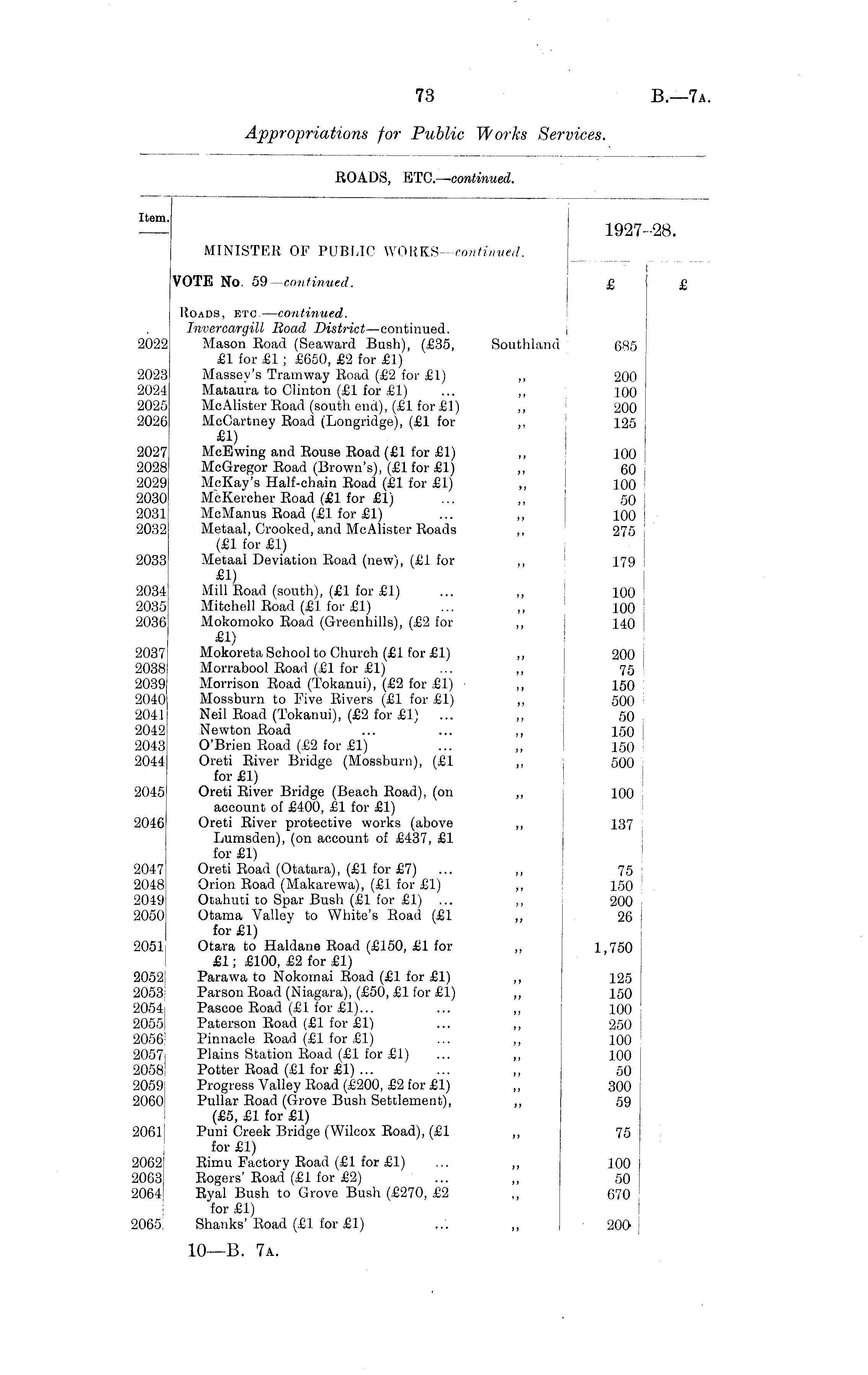 Item. 1927-28. MINISTER OF PUBLIC WOKKS—continued. VOTE No. 59 —continued. £ £ Roads, etc. —continued. Invercargill Road District—continued. 2022 Mason Road (Seaward Bush), (£35, Southland 685 £1 for £1 ; £650, £2 for £1) 2023 Massev's Tramway Road (£2 for £1) ,, 200 2024 Mataura to Clinton (£1 for £1) ... ,, 100 2025 McAlister Road (south end), (£1 for £1) ,, 200 2026 McCartney Road (Longridge), (£1 for ,, 125 £1) 2027 McEwing and Rouse Road (£1 for £1) ,, 100 2028 McGregor Road (Brown's), (£1 for £1) ,, 60 2029 McKay's Half-chain Road (£1 for £1) ,, 100 2030 McKercher Road (£1 for £1) ... „ 50 2031 McManus Road (£1 for £1) ... ,, 100 2032 Metaal, Crooked, and McAlister Roads ,, 275 (£1 for £1) 2033 Metaal Deviation Road (new), (£1 for ,, 179 £1) 2034 Mill Road (south), (£1 for £1) ... ,, 100 2035 Mitchell Road (£1 for £1) ... ,, 100 2036 Mokomoko Road (Greenhills), (£2 for ,, 140 £1) 2037 Mokoreta School to Church (£1 for £1) ,, 200 2038 Morrabool Road (£1 for £1) ... ,, 75 2039 Morrison Road (Tokanui), (£2 for £1) ,, 150 2040 Mossburn to Five Rivers (£1 for £1) ,, 500 2041 Neil Road (Tokanui), (£2 for £1) ... ,, 50 2042 Newton Road ... ... ,, 150 2043 O'Brien Road (£2 for £1) ... ,, 150 2044 Oreti River Bridge (Mossburn), (£1 ,, 500 for £1) 2045 Oreti River Bridge (Beach Road), (on ,, 100 account of £400, £1 for £1) 2046 Oreti River protective works (above „ 137 Lumsden), (on account of £437, £1 for £1) 2047 Oreti Road (Otatara), (£1 for £7) ... ,, 75 2048 Orion Road (Makarewa), (£1 for £1) ,, 150 2049 Otahuti to Spar Bush (£1 for £1) ... ,, 200 2050 Otama Valley to White's Road (£1 ,, 26 > for £1) 2051i Otara to Haldane Road (£150, £1 for ,, 1 750 £1; £100, £2 for £1) 2052j Parawa to Nokomai Road (£1 for £1) ,, 125 2053 Parson Road (Niagara), (£50, £1 for £1) „ 150 2054i Pascoe Road (£1 for £1)... ... ,, 100 2055| Paterson Road (£1 for £1) ... ,, 250 2056J Pinnacle Road (£1 for £1) ... ,, 100 | 2057] Plains Station Road (£1 for £1) ... ,, 100 2058i Potter Road (£1 for £1) ... ... ,, 50 2059! Progress Valley Road (£200, £2 for £1) ,, 300 2060' Pullar Road (Grove Bush Settlement), ,, 59 (£5, £1 for £1) 20611 Puni Creek Bridge (Wilcox Road), (£1 ,, 75 for £1) 2062 Rimu Factory Road (£1 for £1) ... ,, 100 2063 Rogers' Road (£1 for £2) ... ,, 50 2064 Ryal Bush to Grove Bush (£270, £2 ,, 670 for £1) 2065, Shanks' Road (£1 for £1) ... ,, 200