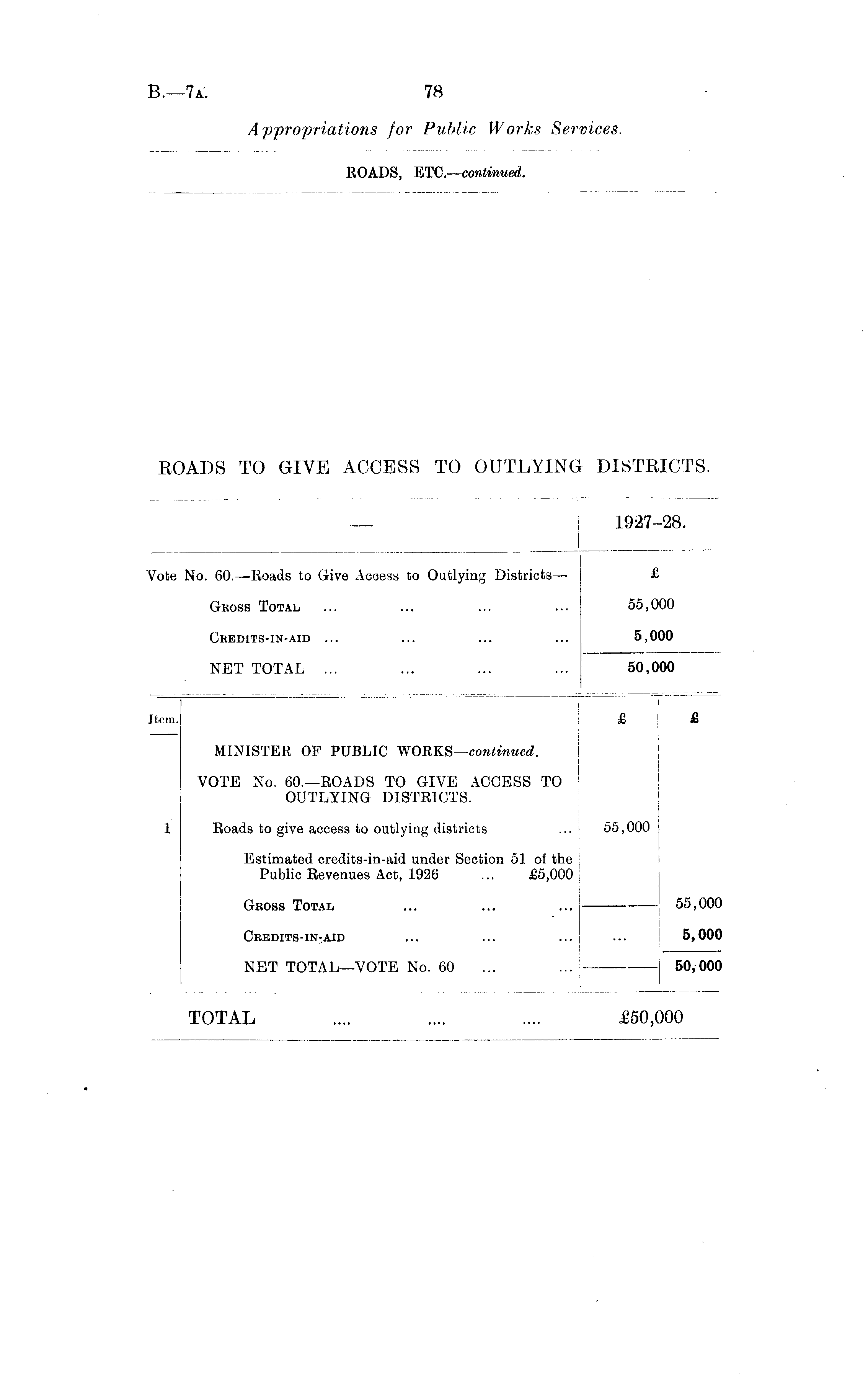 ROADS TO GIVE ACCESS TO OUTLYING DISTRICTS. — 1927-28. Vote No. 60,—Roads to Give Access to Outlying Districts — £ GROSS Total. ... ... ... ... 55,000 Ckedits-IN-AID ... ... ... ... 5,000 NET TOTAL ... ... ... ... 50,000 Item. £ £ MINISTER OF PUBLIC WORKS —continued. VOTE No. 60.—ROADS TO GIVE ACCESS TO OUTLYING DISTRICTS. 1 Roads to give access to outlying districts ... 55,000 Estimated credits-in-aid under Section 51 of the Public Revenues Act, 1926 ... £5,000 Gross Total ... ... ... 55,000 Credits-in-aid ... ... ... ... 5,000 NET TOTAL—VOTE No. 60 ... ... 50,000 I TOTAL .... .... .... £50,000