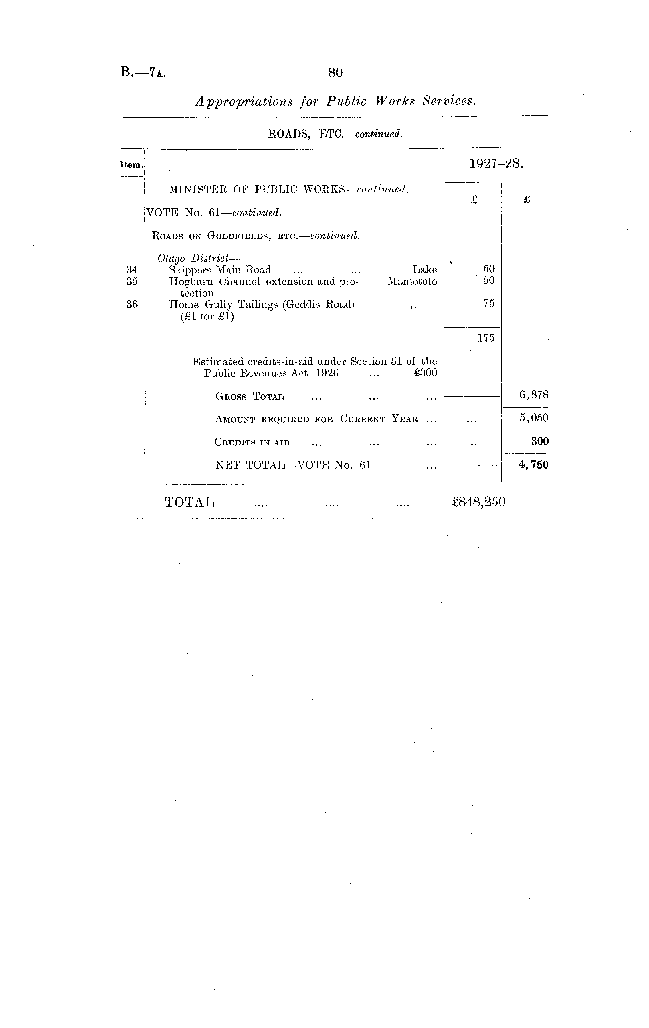 Item. 1927-28. MINISTER OF PUBLIC WORKS—continued. £ £ VOTE No. 61'—continued. Roads on Goldfields, etc. —continued. Otago District — 34 Skippers Main Road ... ... Lake 50 35 Hogburn Channel extension and pro- Maniototo 50 tection 36 Home Gully Tailings (Geddia Road) ,, 75 (£1 for £1) 175 Estimated credits-in-aid under Section 51 of the Public Revenues Act, 1926 ... £300 Gross Total ... ... ... 6,878 Amount required fob Current Year ... ... 5,050 Credits-in-aid ... ... ... ... 300 NET TOTAL—VOTE No. 61 ... 4,750 TOTAL .... .... .... £848,250