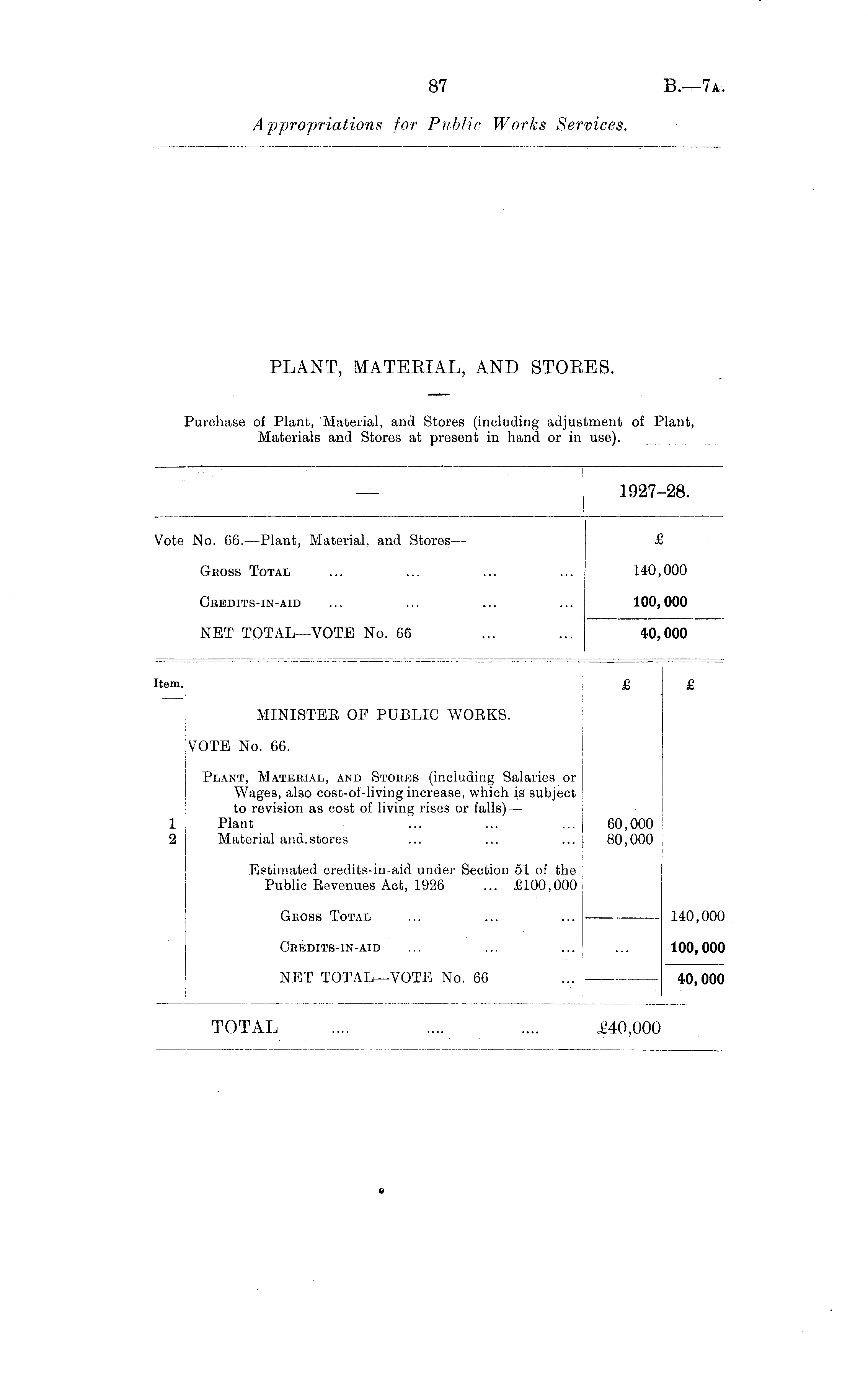 Purchase of Plant, Material, and Stores (including adjustment of Plant, Materials and Stores at present in hand or in use). — 1927-28. Vote ISIo. 66.—Plant, Material, and Stores— £ GROSS Total ... ... ... ... 140,000 Credits-in-aid ... ... ... ... 100,000 NET TOTAL—VOTE No. 66 ... ... 40,000 Item. £ £ MINISTER OF PUBLIC WORKS. VOTE No. 66. Plant, Material, and Stores (including Salaries or Wages, also cost-of-living increase, which is subject to revision as cost of living rises or falls) — 1 Plant ... ... ... 60,000 2 Material and.stores ... ... ... 80,000 Estimated credits-in-aid under Section 51 of the Public Revenues Act, 1926 ... £100,000 GROSS Total ... ... ... — 140,000 Credits-in-aid ... ... ... ... 100,000 NET TOTAL—VOTE No. 66 ... 40,000 TOTAL .... .... .... £40,000