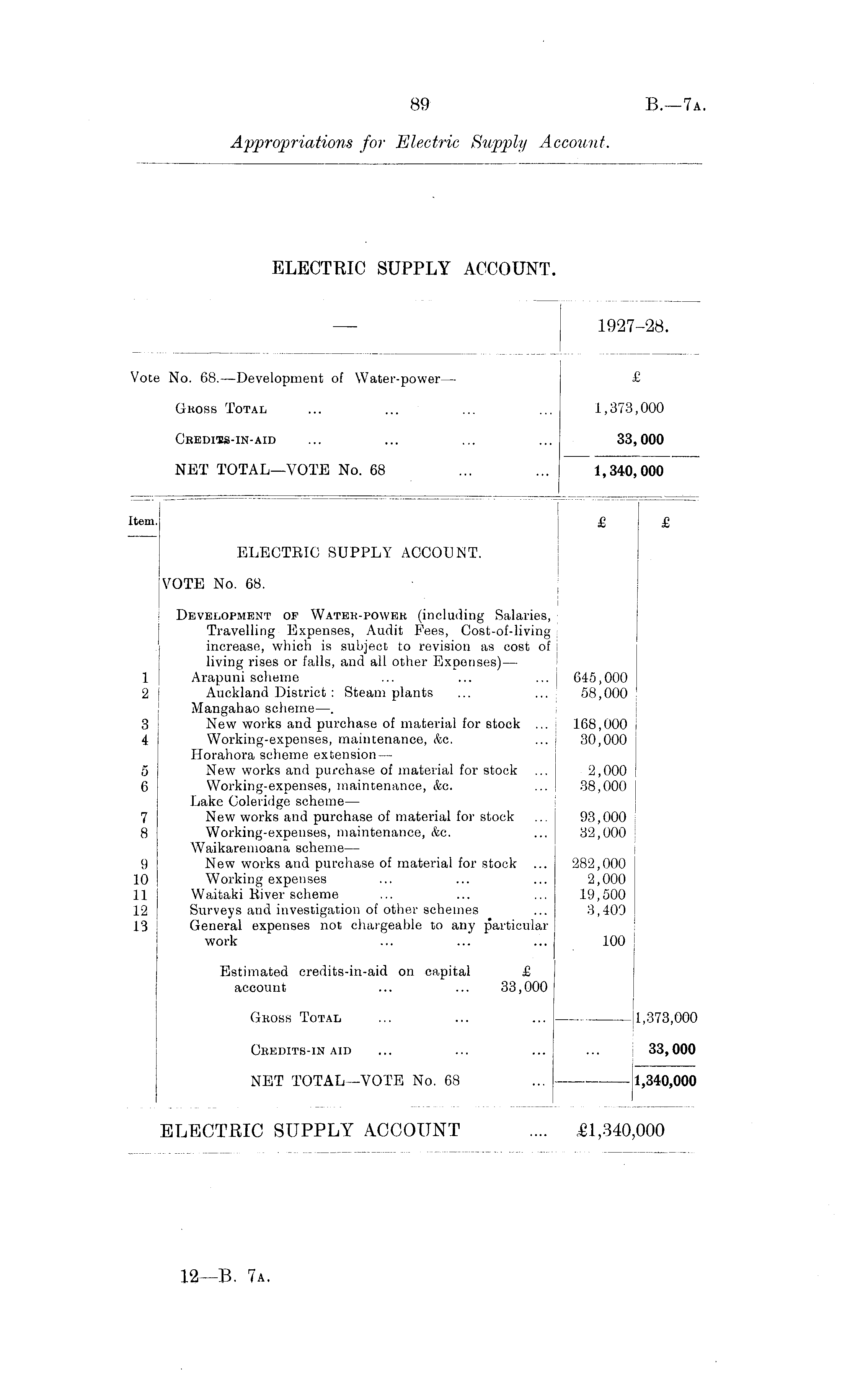 — 1927-28. Vote No. 68.—Development of Water-power— & GROSS Total ... ... ... ... 1,373,000 Credits-in-aid ... ... ... ... 33,000 NET TOTAL—VOTE No. 68 ... ... 1,340,000 Item. £ £ ELECTRIC SUPPLY ACCOUNT. |VOTE No. 68. Development of Water-power (including Salaries, Travelling Expenses, Audit Fees, Cost-of-living j increase, which is subject to revision as cost of living rises or falls, and all other Expenses)— 1 | Arapuni scheme ... ... ... | 645,000 2 [ Auckland District : Steam plants ... ... 58,000 Mangahao scheme —, 3 New works and purchase of material for stock ... 168,000 4 Working-expenses, maintenance, &c. ... 30,000 Horahora scheme extension — 5 New works and purchase of material for stock ... ■ 2,000 6 Working-expenses, maintenance, &c. ... 38,000 Lake Coleridge scheme— 7 New works and purchase of material for stock ... 93,000 8 Working-expenses, maintenance, &c. ... 32,000 Waikaremoana scheme— 9 New works and purchase of material for stock ... 282,000 10 Working expenses ... ... ... 2,000 11 Waitaki River scheme ... ... ... 19,500 12 Surveys and investigation of other schemes ... 3,400 13 General expenses not chargeable to any particular work ... ... ... 100 Estimated credits-in-aid on capital £ account ... ... 33,000 GROSS Total ... ... ... 1,373,000 CREDITS-IN aid ... ... ... ... 33,000 NET TOTAL—VOTE No. 68 ... jl,340,000 ELECTRIC SUPPLY ACCOUNT .... £1,340,000