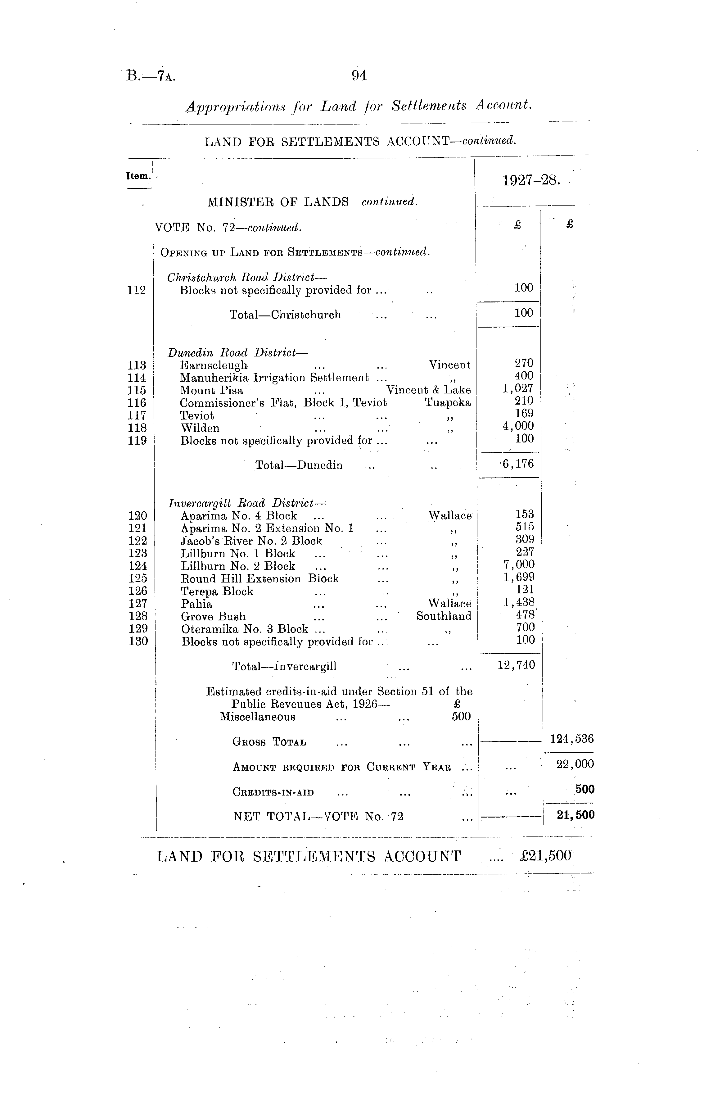 Item - 1927-28. MINISTER OF LANDS —continued. VOTE No. 72 —continued. £ Opening up Land fob Settlements —continued. Christchurch lioad District— 112 Blocks not specifically provided for ... .. 100 Total—ChrisCchurch ... ... 100 Dunedin Road District— 113 Earnscleugh ... ... Vincent 270 114 Manuherikia Irrigation Settlement ... ,, 400 115 Mount Pisa ... Vincent & Lake 1,027 116 Commissioner's Flat, Block I, Teviot Tuapeka 210 117 Teviot ... ... „ 169 118 Wilden ... ... „ 4,000 119 Blocks not specifically provided for ... ... 100 Total —Dunedin .. .. 6,176 Invercargilt Road District— 120 Aparima No. 4 Block ... ... Wallace 153 121 Aparima No. 2 Extension No. 1 ... ,, 515 122 Jacob's River No. 2 Block ... ,, 309 123 Lillburn No. 1 Block ... ... „ 227 124 Lillburn No. 2 Block ... ... ,, 7,000 125 Round Hill Extension Block ... ,, 1,699 126 Terepa Block ... ... ,, ; 121 127 Pahia ... ... Wallace 1,438 128 Grove Bush ... ... Southland 478 129 Oteramika No. 3 Block ... ... ,, 700 130 Blocks not specifically provided for .. ... 100 Total—lnvercargill ... ... 12,740 Estimated credits-in-aid under Section 51 of the Public Revenues Act, 1926— £ Miscellaneous ... ... 500 i Gross Total ... ... ... — 124,536 Amount required for Current Year ... ... 22,000 Credits-in-aid ... ... ... ... 500 NET TOTAL—VOTE No. 72 ... 21,500 LAND FOR SETTLEMENTS ACCOUNT .... £21,500