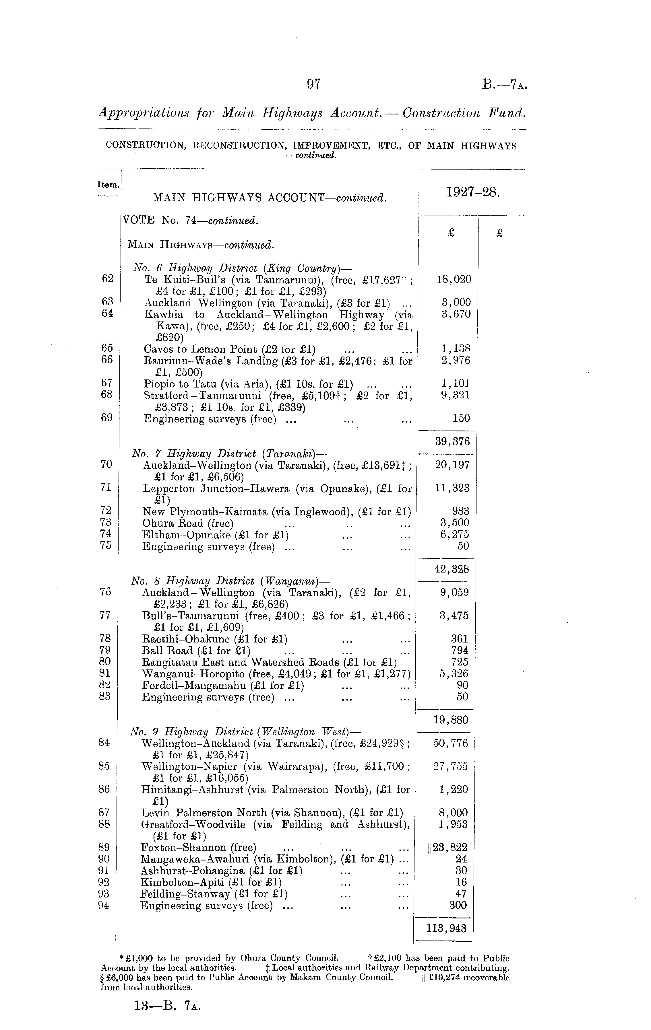 MAIN HIGHWAYS ACCOUNT—continued. 1927-28. VOTE No. 74 —continued. £ £ Main Highways—continued. No. 6 Highway District (King Country)— 62 Te Kuiti-Bull's (via Taumarunui), (free, £17,627* ; 18,020 £4 for £1, £100; £1 for £1, £293) 63 Auckland-Wellington (via Taranaki), (£3 for £1) ... 3,000 64 Kawhia to Auckland-Wellington Highway (via 3,670 Kawa), (free, £250; £4 for £1, £2,600 ; £2 for £1, £820) 65 Caves to Lemon Point (£2 for £1) ... ... 1,138 66 Eaurimu-Wade's Landing (£3 for £1, £2,476; £1 for 2,976 £1, £500) 67 Piopio to Tatu (via Aria), (£1 10s. for £1) ... ... 1,101 68 | Stratford - Taumarunui (free, £5,109+ ; £2 for £1, 9,321 £3,873 ; £1 10s. for £1, £339) 69 Engineering surveys (free) ... ... ... 150 39,376 No. 7 Highway District (Taranaki) — — 70 Auckland-Wellington (via Taranaki), (free, £13,691 {; 20,197 £1 for £1, £6,506) 71 Lepperton Junction-Hawera (via Opunake), (£1 for 11,323 £1) 72 New Plymouth-Kaimata (via Inglewood), (£1 for £1) 983 73 Ohura Eoad (free) ... .. ... 3,500 74 Eltham-Opunake (£1 for £1) ... ... 6,275 75 Engineering surveys (free) ... ... ... 50 42,328 No. 8 Highway District (Wanganui)— — 76 Auckland - Wellington (via Taranaki), (£2 for £1, 9,059 £2,233 ; £1 for £1, £6,826) 77 Bull's-Taumarunui (free, £400 ; £3 for £1, £1,466; 3,475 £1 for £1, £1,609) 78 Raetihi-Ohakune (£1 for £1) ... ... 361 79 Ball Eoad (£1 for £1) ... ... ... 794 80 Rangitatau East and Watershed Eoads (£1 for £1) 725 81 Wanganui-Horopito (free, £4,049; £1 for £1, £1,277) 5,326 82 Eordell-Mangamahu (£1 for £1) ... ... 90 83 Engineering surveys (free) ... ... ... 50 19,880 No. 9 Highway District (Wellington West) — 84 Wellington-Auckland (via Taranaki), (free, £24,929§ ; 50,776 £1 for £1, £25,847) 85 Wellington-Napier (via Wairarapa), (free, £11,700; 27,755 £1 for £1, £16,055) 86 Himitangi-Ashhurst (via Palmerston North), (£1 for 1,220 £1) 87 Levin-Palmerston North (via Shannon), (£1 for £1) 8,000 88 Greatford-Woodville (via Feilding and Ashhurst), 3,953 (£1 for £1) 89 Foxton-Shannon (free) ... ... ... ||23,822 90 Mangaweka-Awahuri (via Kimbolton), (£1 for £1) ... 24 91 Ashhurst-Pohangina (£1 for £1) ... ... 30 92 : Kimbolton-Apiti (£1 for £1) ... ... 16 93 Peilding-Stanway (£1 for £1) ... ... 47 94 Engineering surveys (free) ... ... ... 300 113,943 *£1,000 to be provided by Ohura County Council. t£2,100 h as been paid to Public Account by the local authorities. { Local authorities and Railway Department contributing. § £6,000 has been paid to Public Account by Makara County Council. || £10,274 recoverable from local authorities.