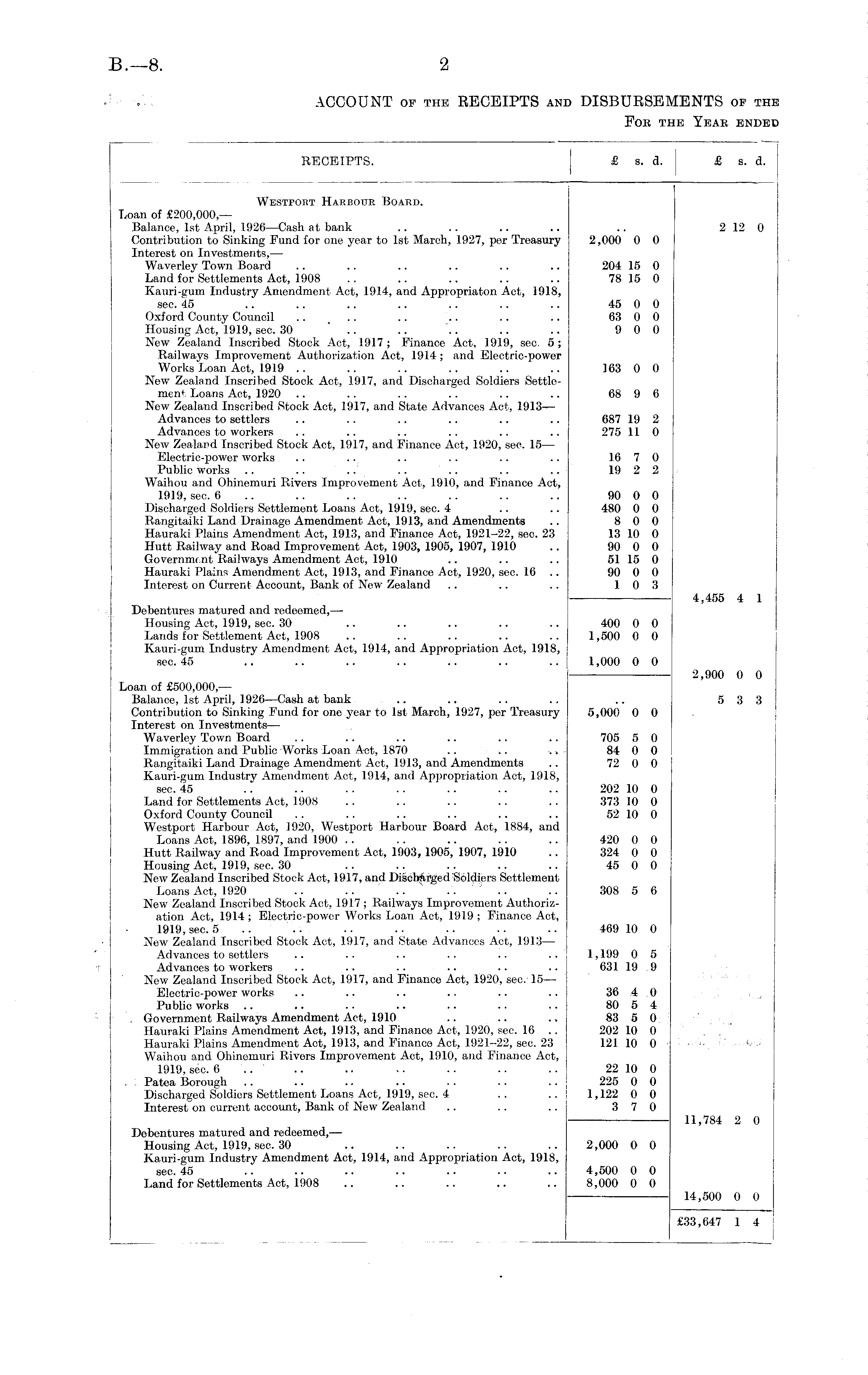 RECEIPTS. £ s. d. £ s. d. Westport Harbour Board. Loan of £200,000,— Balance, 1st April, 1926 —Cash at bank .. .. .. .. .. 2 12 0 Contribution to Sinking Fund for one year to 1st March, 1927, per Treasury 2,000 0 0 Interest on Investments, — Waverley Town Board .. .. .. .. .. .. 204 15 0 Land for Settlements Act, 1908 .. .. .. .. .. 78 15 0 Kauri-gum Industry Amendment- Act, 1914, and Appropriaton Act, 1918, sec. 45 .. .. .. .. .. .. .. 45 0 0 Oxford County Council .. _ .. .. .. .. .. 63 0 0 Housing Act, 1919, sec. 30 .. .. .. .. .. 9 0 0 New Zealand Inscribed Stock Act, 1917 ; Finance Act, 1919, sec. 5; Railways Improvement Authorization Act, 1914; and Electric-power Works Loan Act, 1919 .. .. .. .. .. .. 163 0 0 New Zealand Inscribed Stock Act, 1917, and Discharged Soldiers Settlement Loans Act, 1920 .. .. .. .. .. .. 68 9 6 New Zealand Inscribed Stock Act, 1917, and State Advances Act, 1913— Advances to settlers .. .. .. .. .. .. 687 19 2 Advances to workers .. .. .. .. .. .. 275 11 0 New Zealand Inscribed Stock Act, 1917, and Finance Act, 1920, sec. 15 — Electric-power works .. .. .. .. .. .. 16 7 0 Public works .. .. .. .. .. .. .. 19 2 2 Waihou and Ohinemuri Rivers Improvement Act, 1910, and Finance Act, 1919, see. 6 .. .. .. .. .. .. 90 0 0 Discharged Soldiers Settlement Loans Act, 1919, sec. 4 .. .. 480 0 0 Rangitaiki Land Drainage Amendment Act, 1913, and Amendments .. 8 0 0 Hauraki Plains Amendment Act, 1913, and Finance Act, 1921-22, sec. 23 13 10 0 Hutt Railway and Road Improvement Act, 1903, 1905, 1907, 1910 .. 90 0 0 Government Railways Amendment Act, 1910 .. .. .. 51 15 0 Hauraki Plains Amendment Act, 1913, and Finance Act, 1920, sec. 16 .. 90 0 0 Interest on Current Account, Bank of New Zealand .. .. .. 10 3 4,455 4 1 Debentures matured and redeemed, — Housing Act, 1919, sec. 30 .. .. .. .. .. 400 0 0 Lands for Settlement Act, 1908 .. .. .. .. .. 1,500 0 0 Kauri-gum Industry Amendment Act, 1914, and Appropriation Act, 1918, see. 45 .. .. .. .. .. .. .. 1,000 0 0 2,900 0 0 Loan of £500,000,— Balance, 1st April, 1926—Cash at bank ... .. .. .. .. 5 3 3 Contribution to Sinking Fund for one year to 1st March, 1927, per Treasury 5,000 0 0 Interest on Investments— Waverley Town Board .. .. .. .. .. .. 705 5 0 Immigration and Public Works Loan Act, 1870 .. .. 84 0 0 Rangitaiki Land Drainage Amendment Act, 1913, and Amendments .. 72 0 0 Kauri-gum Industry Amendment Act, 1914, and Appropriation Act, 1918, sec. 45 .. .. .. .. .. .. .. 202 10 0 Land for Settlements Act, 1908 .. .. .. .. .. 373 10 0 Oxford County Council .. .. .. .. .. .. 52 10 0 Westport Harbour Act, 1920, Westport Harbour Board Act, 1884, and Loans Act, 1896, 1897, and 1900 .. .. .. .. .. 420 0 0 Hutt Railway and Road Improvement Act, 1903,1905, 1907, 1910 .. 324 0 0 Housing Act, 1919, sec. 30 .. . . . . . . .. 45 0 0 New Zealand Inscribed Stock Act, 1917, and Discharged Soldiers Settlement Loans Act, 1920 .. .. . . .. . . .. 308 5 6 New Zealand Inscribed Stock Act, 1917 ; Railways Improvement Authorization Act, 1914 ; Electric-power Works Loan Act, 1919 ; Finance Act, 1919, sec. 5 ... . . .. .. .. .. .. 469 10 0 New Zealand Inscribed Stock Act, 1917, and State Advances Act, 1913- — Advances to settlers .. .. .. .. .. .. 1,199 0 5 Advances to workers .. .. .. .. .. .. 631 19 .9 New Zealand Inscribed Stock Act, 1917, and Finance Act, 1920, sec. 15 — Electric-power works .. .. .. . • ■ ■ •. 36 4 0 Public works .. .. .. .. .. .. .. 80 5 4 . Government Railways Amendment Act, 1910 .. .. .. 83 5 0 Hauraki Plains Amendment Act, 1913, and Finance Act, 1920, sec. 16 .. 202 10 0 Hauraki Plains Amendment Act, 1913, and Finance Act, 1921-22, sec. 23 121 10 0 •••.' ■ Ov< Waihou and Ohinemuri Rivers Improvement Act, 1910, and Finance Act, 1919,sec. 6 .. .. .. .. .. .. .. 22 10 0 Patea Borough .. .. .. .. . . .. .. 225 0 0 Discharged Soldiers Settlement Loans Act, 1919, sec. 4 .. .. 1,122 0 0 Interest on current account, Bank of New Zealand .. .. .. 3 7 0 11,784 2 0 Debentures matured and redeemed, — Housing Act, 1919, sec. 30 .. .. .. .. .. 2,000 0 0 Kauri-gum Industry Amendment Act, 1914, and Appropriation Act, 1918, sec. 45 .. .. .. .. .. .. .. 4,500 0 0 Land for Settlements Act, 1908 .. .. .. .. .. 8,000 0 0 14,500 0 0 £33,647 1 4