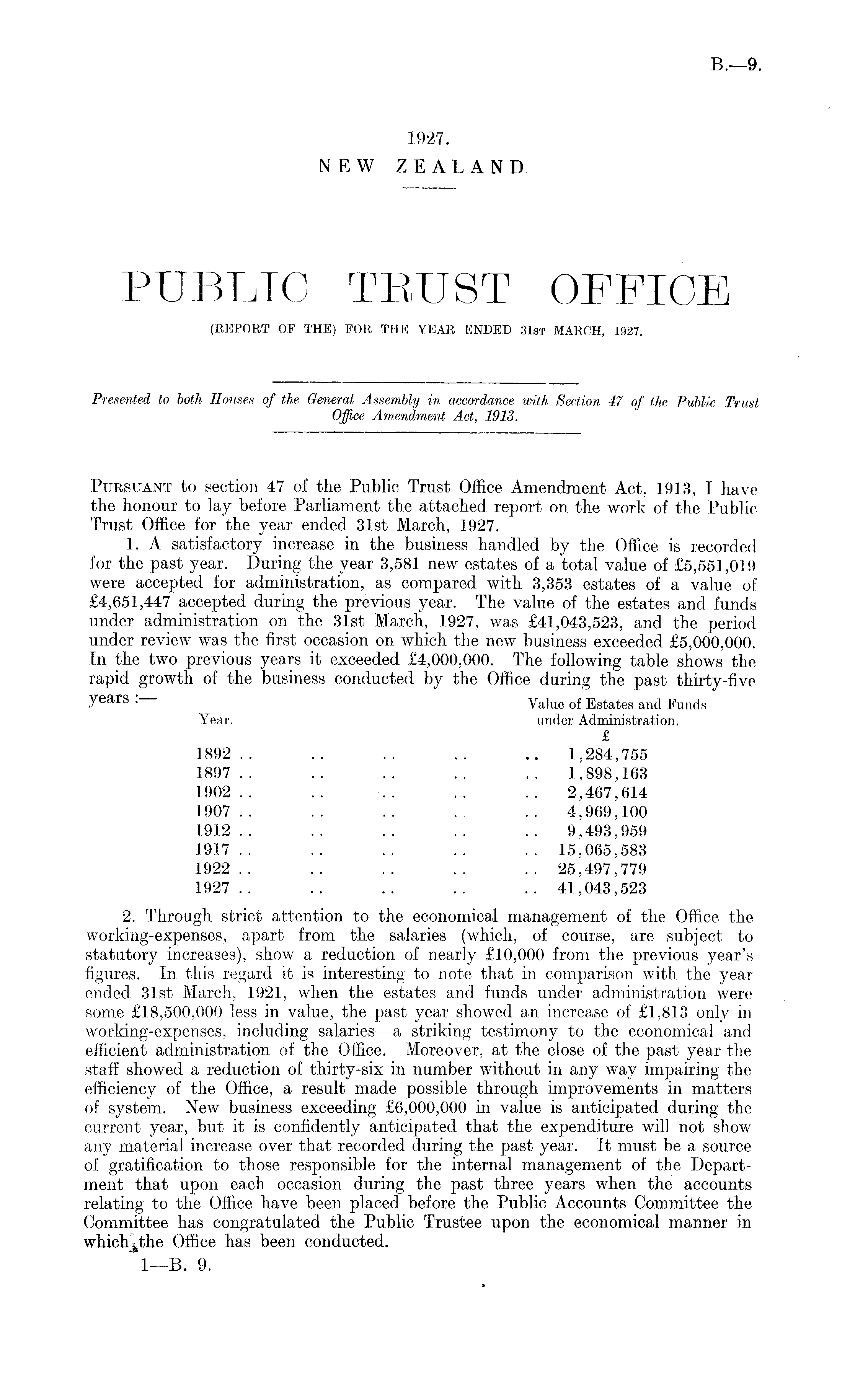 Pursuant to section 47 of the Public Trust Office Amendment Act. 1913, I have the honour to lay before Parliament the attached report on the work of the Public Trust Office for the year ended 31st March, 1927. 1. A satisfactory increase in the business handled by the Office is recorded for the past year. During the year 3,581 new estates of a total value of £5,551,019 were accepted for administration, as compared with 3,353 estates of a value of £4,651,447 accepted during the previous year. The value of the estates and funds under administration on the 31st March, 1927, was £41,043,523, and the period under review was the first occasion on which the new business exceeded £5,000,000. In the two previous years it exceeded £4,000,000. The following table shows the rapid growth of the business conducted by the Office during the past thirty-five years . Value of Estates and Funds Year. under Administration. £ 1892.. .. .. .. .. 1,284,755 1897 . . . . . . .. .. 1,898,163 1902 . . . . .. .. .. 2,467,614 1907.. .. .. . .. 4,969,100 1912.. .. .. .. .. 9,493,959 1917.. .. .. .. .. 15,065,583 1922.. .. .. .. 25,497,779 1927.. .. .. .. .. 41,043,523 2. Through strict attention to the economical management of the Office the working-expenses, apart from the salaries (which, of course, are subject to statutory increases), show a reduction of nearly £10,000 from the previous year's figitres. In this regard it is interesting to note that in comparison with the year ended 31st March, 1921, when the estates and funds under administration were some £18,500,000 less in value, the past year showed an increase of £1,813 only in working-expenses, including salaries—a striking testimony to the economical and efficient administration of the Office. Moreover, at the close of the past year the staff showed a reduction of thirty-six in number without in any way impairing the efficiency of the Office, a result made possible through improvements in matters of system. New business exceeding £6,000,000 in value is anticipated during the current year, but it is confidently anticipated that the expenditure will not show any material increase over that recorded during the past year. It must be a source of gratification to those responsible for the internal management of the Department that upon each occasion during the past three years when the accounts relating to the Office have been placed before the Public Accounts Committee the Committee has congratulated the Public Trustee upon the economical manner in Office has been conducted.