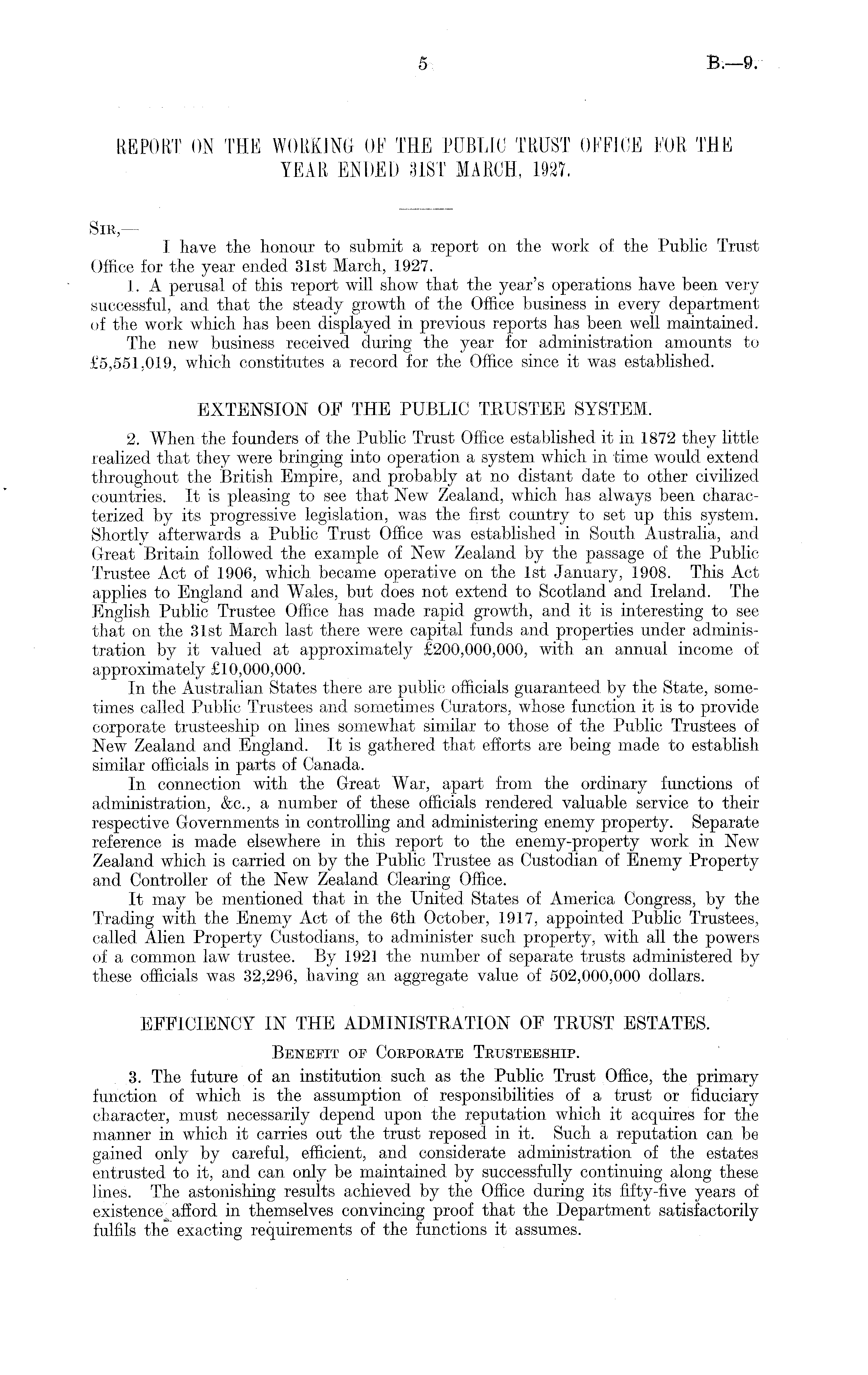REPORT ON THE WORKING OF THE PUBLIC TRUST OFFICE FOR THE YEAR ENDED 81ST MARCH, 1927. Sir, — I have the honour to submit a report on the work of the Public Trust Office for the year ended 31st March, 1927. 1. A perusal of this report will show that the year's operations have been very successful, and that the steady growth of the Office business in every department of the work which has been displayed in previous reports has been well maintained. The new business received during the year for administration amounts to £5,551,019, which constitutes a record for the Office since it was established. EXTENSION OE THE PUBLIC TRUSTEE SYSTEM. 2. When the founders of the Public Trust Office established it in 1872 they little realized that they were bringing into operation a system which in time would extend throughout the British Empire, and probably at no distant date to other civilized countries. It is pleasing to see that New Zealand, which has always been characterized by its progressive legislation, was the first country to set up this system. Shortly afterwards a Public Trust Office was established in South Australia, and Great Britain followed the example of New Zealand by the passage of the Public Trustee Act of 1906, which became operative on the Ist January, 1908. This Act applies to England and Wales, but does not extend to Scotland and Ireland. The English Public Trustee Office has made rapid growth, and it is interesting to see that on the 31st March last there were capital funds and properties under administration by it valued at approximately £200,000,000, with an annual income of approximately £10,000,000. In the Australian States there are public officials guaranteed by the State, sometimes called Public Trustees and sometimes Curators, whose function it is to provide corporate trusteeship on lines somewhat similar to those of the Public Trustees of New Zealand and England. It is gathered that efforts are being made to establish similar officials in parts of Canada. In connection with the Great War, apart from the ordinary functions of administration, &c., a number of these officials rendered valuable service to their respective Governments in controlling and administering enemy property. Separate reference is made elsewhere in this report to the enemy-property work in New Zealand which is carried on by the Public Trustee as Custodian of Enemy Property and Controller of the New Zealand Clearing Office. It may be mentioned that in the United States of America Congress, by the Trading with the Enemy Act of the 6th October, 1917, appointed Public Trustees, called Alien Property Custodians, to administer such property, with all the powers of a common law trustee. By 1921 the number of separate trusts administered by these officials was 32,296, having an aggregate value of 502,000,000 dollars. EFFICIENCY IN THE ADMINISTRATION OF TRUST ESTATES. Benefit op Corporate Trusteeship. 3. The future of an institution such as the Public Trust Office, the primary function of which is the assumption of responsibilities of a trust or fiduciary character, must necessarily depend upon the reputation which it acquires for the manner in which it carries out the trust reposed in it. Such a reputation can be gained only by careful, efficient, and considerate administration of the estates entrusted to it, and can only be maintained by successfully continuing along these lines. The astonishing results achieved by the Office during its fifty-five years of afford in themselves convincing proof that the Department satisfactorily fulfils the exacting requirements of the functions it assumes.