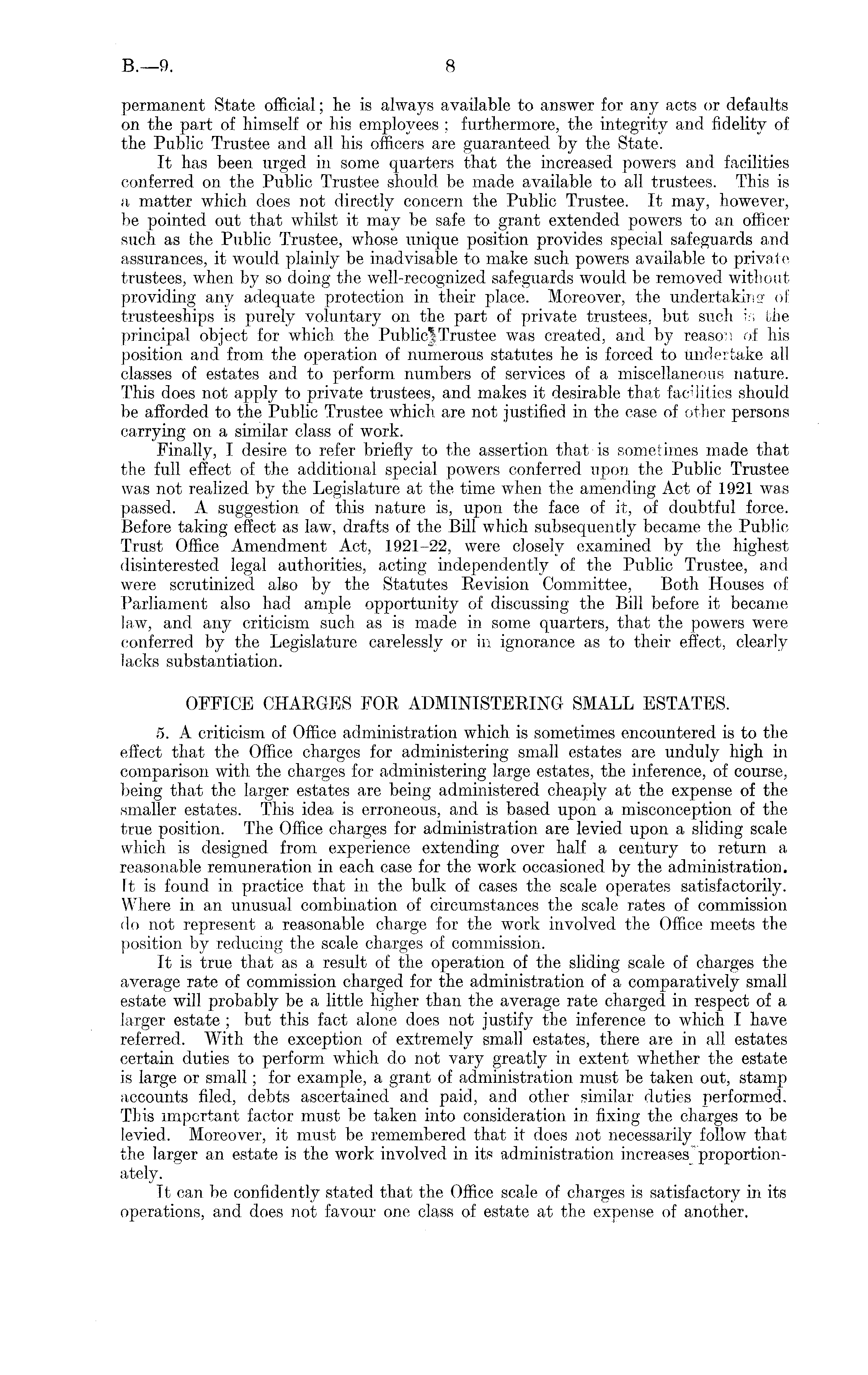 permanent State official; he is always available to answer for any acts or defaults on the part of himself or his employees ; furthermore, the integrity and fidelity of the Public Trustee and all his officers are guaranteed by the State. It has been urged in some quarters that the increased powers and facilities conferred on the Public Trustee should be made available to all trustees. This is a matter which does not directly concern the Public Trustee. It may, however, be pointed out that whilst it may be safe to grant extended powers to an officer such as the Public Trustee, whose unique position provides special safeguards and assurances, it would plainly be inadvisable to make such powers available to private trustees, when by so doing the well-recognized safeguards would be removed without providing any adequate protection in their place. Moreover, the undertaking of trusteeships is purely voluntary on the part of private trustees, but such is the principal object for which, the Public! Trustee was created, and by reason of his position and from the operation of numerous statutes he is forced to undertake all classes of estates and to perform numbers of services of a miscellaneous nature. This does not apply to private trustees, and makes it desirable that facilities should be afforded to the Public Trustee which are not justified in the case of other persons carrying on a similar class of work. Finally, I desire to refer briefly to the assertion that is sometimes made that the full effect of the additional special powers conferred upon the Public Trustee was not realized by the Legislature at the time when the amending Act of 1921 was passed. A suggestion of this nature is, upon the face of it, of doubtful force. Before taking effect as law, drafts of the Bill which subsequently became the Public Trust Office Amendment Act, 1921-22, were closely examined by the highest disinterested legal authorities, acting independently of the Public Trustee, and were scrutinized also by the Statutes Revision Committee, Both Houses of Parliament also had ample opportunity of discussing the Bill before it became law, and any criticism such as is made in some quarters, that the powers were conferred by the Legislature carelessly or in ignorance as to their effect, clearly lacks substantiation. OFFICE CHARGES FOR ADMINISTERING SMALL ESTATES. 5. A criticism of Office administration which is sometimes encountered is to the effect that the Office charges for administering small estates are unduly high in comparison with the charges for administering large estates, the inference, of course, being that the larger estates are being administered cheaply at the expense of the smaller estates. This idea is erroneous, and is based upon a misconception of the true position. The Office charges for administration are levied upon a sliding scale which is designed from experience extending over half a century to return a reasonable remuneration in each case for the work occasioned by the administration. It is found in practice that in the bulk of cases the scale operates satisfactorily. Where in an unusual combination of circumstances the scale rates of commission do not represent a reasonable charge for the work involved the Office meets the position by reducing the scale charges of commission. It is true that as a result of the operation of the sliding scale of charges the average rate of commission charged for the administration of a comparatively small estate will probably be a little higher than the average rate charged in respect of a larger estate ; but this fact alone does not justify the inference to which I have referred. With the exception of extremely small estates, there are in all estates certain duties to perform which do not vary greatly in extent whether the estate is large or small ; for example, a grant of administration must be taken out, stamp accounts filed, debts ascertained and paid, and other similar duties performed. This important factor must be taken into consideration in fixing the charges to be levied. Moreover, it must be remembered that it does not necessarily follow that the larger an estate is the work involved in its administration increases'proportionately. It can be confidently stated that the Office scale of charges is satisfactory in its operations, and does not favour one class of estate at the expense of another.