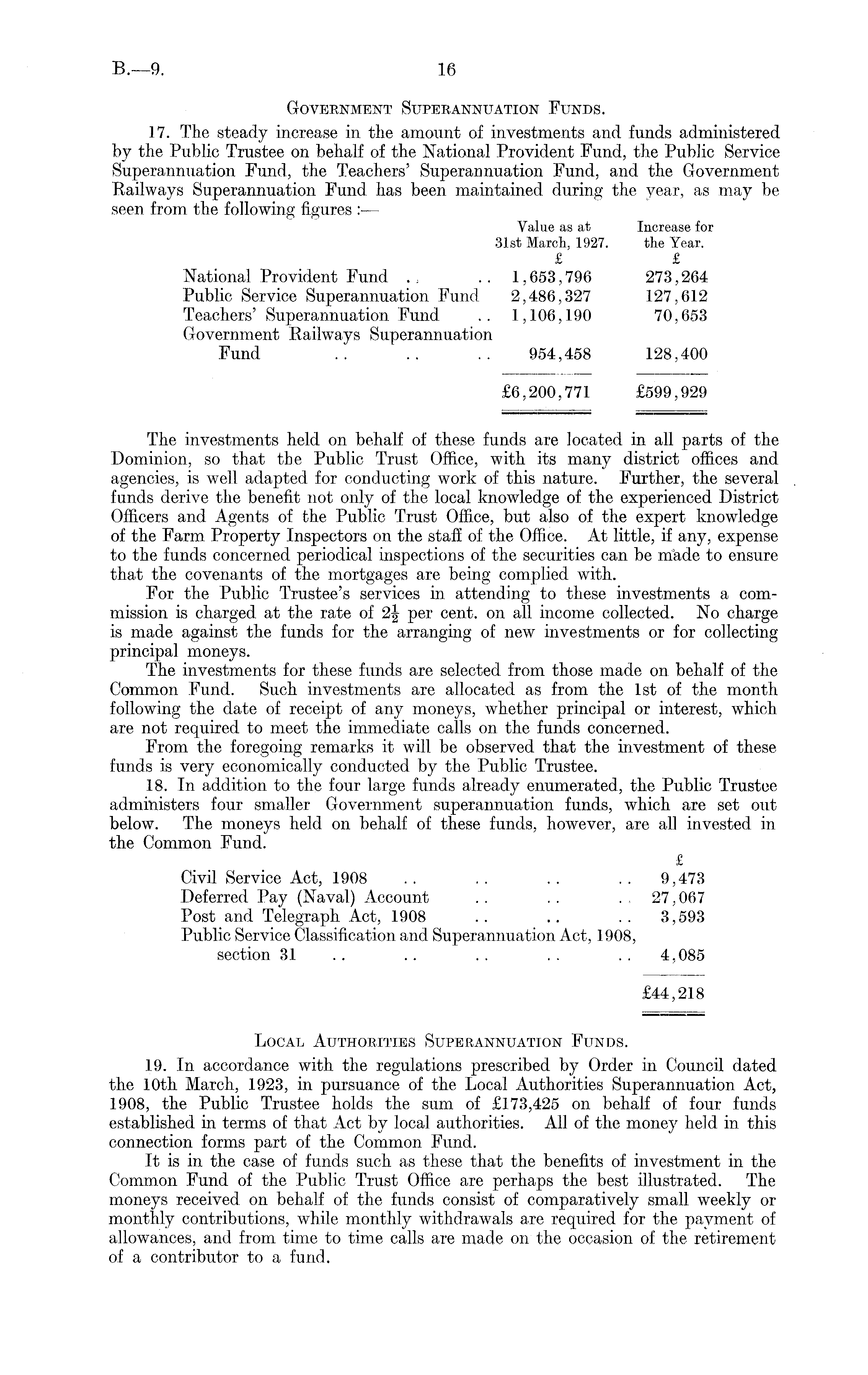 Government Superannuation Funds. 17. The steady increase in the amount of investments and funds administered by the Public Trustee on behalf of the National Provident Fund, the Public Service Superannuation Fund, the Teachers' Superannuation Fund, and the Government Railways Superannuation Fund has been maintained during the year, as may be seen from the following figures :— Value as at Increase for 31st March, 1927. the Year. £ £ National Provident Fund . , .. 1,653,796 273,264 Public Service Superannuation Fund 2,486,327 127,612 Teachers' Superannuation Fund .. 1,106,190 70,653 Government Railways Superannuation Fund .. .. .. 954,458 128,400 £6,200,771 £599,929 The investments held on behalf of these funds are located in all parts of the Dominion, so that the Public Trust Office, with its many district offices and agencies, is well adapted for conducting work of this nature. Further, the several funds derive the benefit not only of the local knowledge of the experienced District Officers and Agents of the Public Trust Office, but also of the expert knowledge of the Farm Property Inspectors on the staff of the Office. At little, if any, expense to the funds concerned periodical inspections of the securities can be made to ensure that the covenants of the mortgages are being complied with. For the Public Trustee's services in attending to these investments a commission is charged at the rate of 2§ per cent, on all income collected. No charge is made against the funds for the arranging of new investments or for collecting principal moneys. The investments for these funds are selected from those made on behalf of the Common Fund. Such investments are allocated as from the Ist of the month following the date of receipt of any moneys, whether principal or interest, which are not required to meet the immediate calls on the funds concerned. From the foregoing remarks it will be observed that the investment of these funds is very economically conducted by the Public Trustee. 18. In addition to the four large funds already enumerated, the Public Trustee administers four smaller Government superannuation funds, which are set out below. The moneys held on behalf of these funds, however, are all invested in the Common Fund. £ Civil Service Act, 1908 . . . . . . . . 9,473 Deferred Pay (Naval) Account . . . . . 27,067 Post and Telegraph Act, 1908 .. .. .. 3,593 Public Service Classification and Superannuation Act, 1908, section 31 . . . . . . . . . . 4,085 £44,218 Local Authorities Superannuation Funds. 19. In accordance with the regulations prescribed by Order in Council dated the 10th March, 1923, in pursuance of the Local Authorities Superannuation Act, 1908, the Public Trustee holds the sum of £173,425 on behalf of four funds established in terms of that Act by local authorities. All of the money held in this connection forms part of the Common Fund. It is in the case of funds such as these that the benefits of investment in the Common Fund of the Public Trust Office are perhaps the best illustrated. The moneys received on behalf of the funds consist of comparatively small weekly or monthly contributions, while monthly withdrawals are required for the payment of allowances, and from time to time calls are made on the occasion of the retirement of a contributor to a fund.
