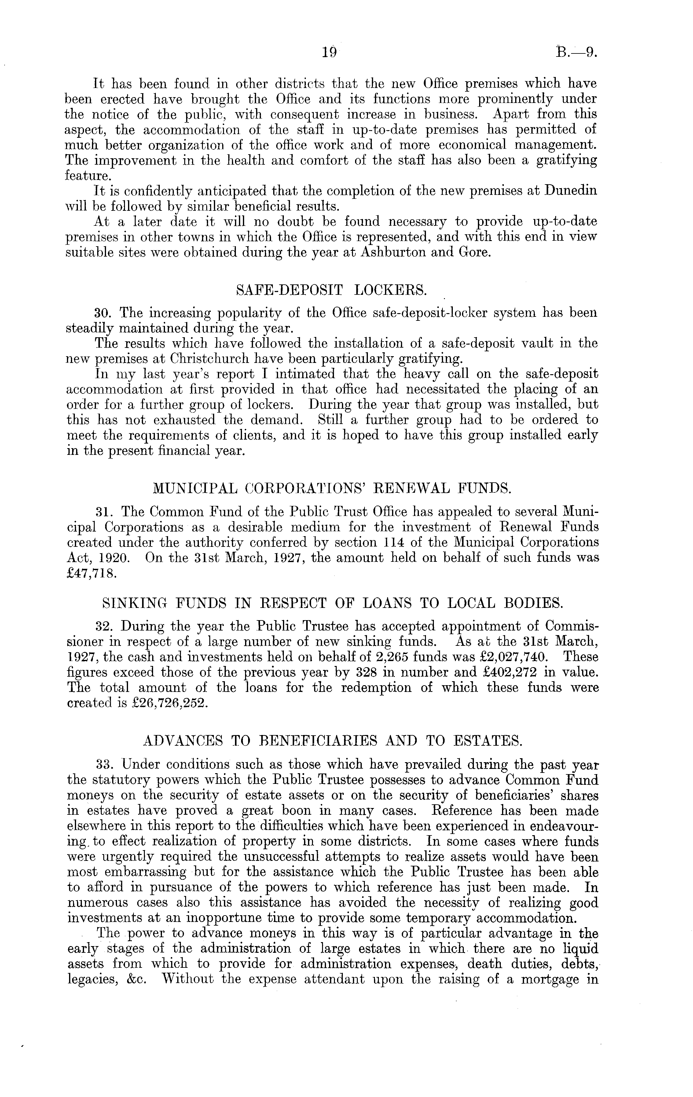It lias been found in other districts that the new Office premises which have been erected have brought the Office and its functions more prominently under the notice of the public, with consequent increase in business. Apart from this aspect, the accommodation of the staff in up-to-date premises has permitted of much better organization of the office work and of more economical management. The improvement in the health and comfort of the staff has also been a gratifying feature. It is confidently anticipated that the completion of the new premises at Dunedin will be followed by similar beneficial results. At a later date it will no doubt be found necessary to provide up-to-date premises in other towns in which the Office is represented, and with this end in view suitable sites were obtained during the year at Ashburton and Gore. SAFE-DEPOSIT LOCKERS. 30. The increasing popularity of the Office safe-deposit-locker system has been steadily maintained during the year. The results which have followed the installation of a safe-deposit vault in the new premises at Christchurch have been particularly gratifying. In my last year's report I intimated that the heavy call on the safe-deposit accommodation at first provided in that office had necessitated the placing of an order for a further group of lockers. During the year that group was installed, but this has not exhausted the demand. Still a further group had to be ordered to meet the requirements of clients, and it is hoped to have this group installed early in the present financial year. MUNICIPAL CORPORATIONS' RENEWAL FUNDS. 31. The Common Fund of the Public Trust Office has appealed to several Municipal Corporations as a desirable medium for the investment of Renewal Funds created under the authority conferred by section 114 of the Municipal Corporations Act, 1920. On the 31st March, 1927, the amount held on behalf of such funds was £47,718. SINKING FUNDS IN RESPECT OF LOANS TO LOCAL BODIES. 32. During the year the Public Trustee has accepted appointment of Commissioner in respect of a large number of new sinking funds. As at the 31st March, 1927, the cash and investments held on behalf of 2,265 funds was £2,027,740. These figures exceed those of the previous year by 328 in number and £402,272 in value. The total amount of the loans for the redemption of which these funds were created is £26,726,252. ADVANCES TO BENEFICIARIES AND TO ESTATES. 33. Under conditions such as those which have prevailed during the past year the statutory powers which the Public Trustee possesses to advance Common Fund moneys on the security of estate assets or on the security of beneficiaries' shares in estates have proved a great boon in many cases. Reference has been made elsewhere in this report to the difficulties which have been experienced in endeavouring, to effect realization of property in some districts. In some cases where funds were urgently required the unsuccessful attempts to realize assets would have been most embarrassing but for the assistance which the Public Trustee has been able to afford in pursuance of the powers to which reference has just been made. In numerous cases also this assistance has avoided the necessity of realizing good investments at an inopportune time to provide some temporary accommodation. The power to advance moneys in this way is of particular advantage in the early stages of the administration of large estates in which there are no liquid assets from which to provide for administration expenses, death duties, debts, legacies, &c. Without the expense attendant upon the raising of a mortgage in