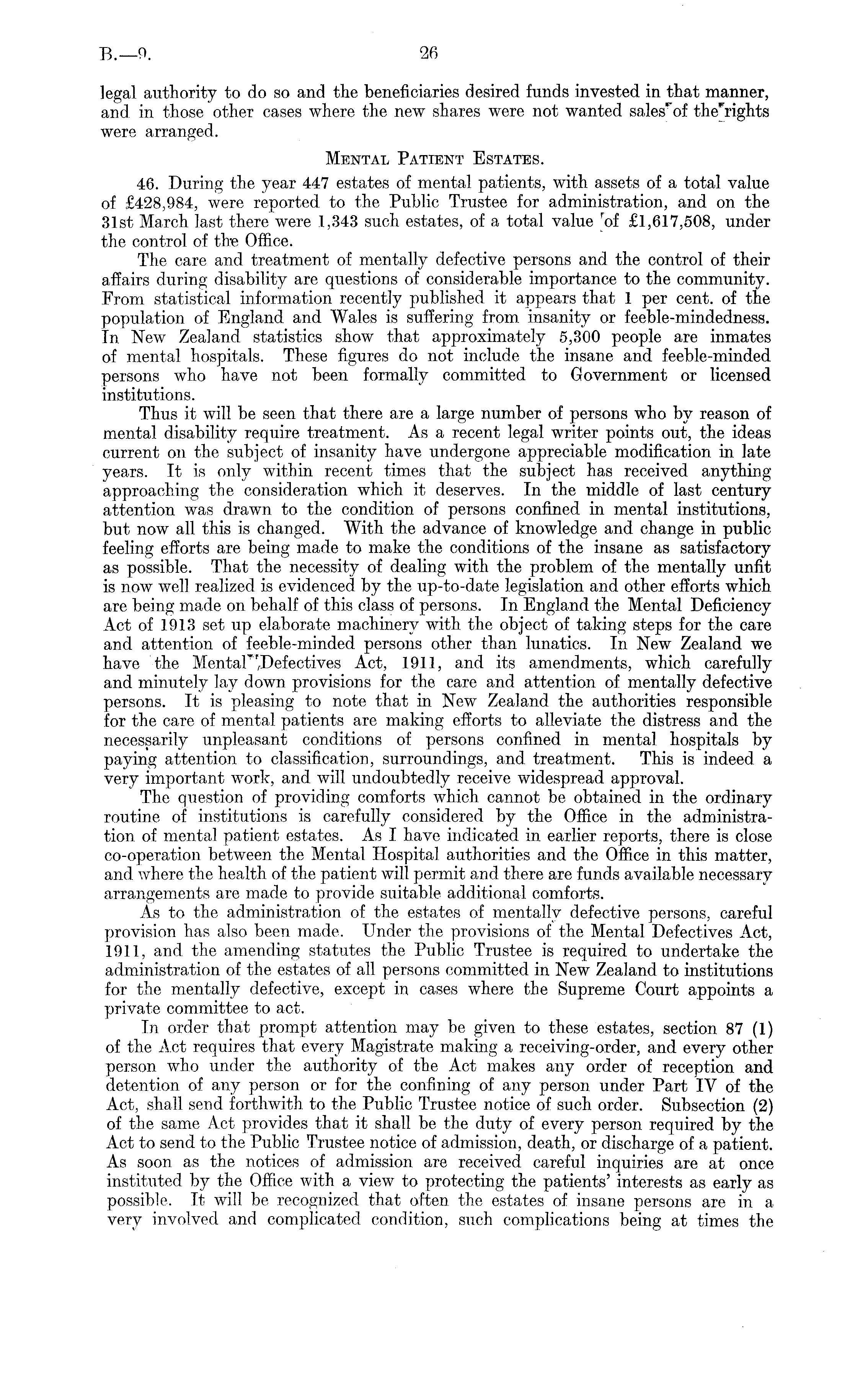 legal authority to do so and the beneficiaries desired funds invested in that manner, and in those other cases where the new shares were not wanted sales""of the'rights were arranged. Mental Patient Estates. 46. During the year 447 estates of mental patients, with assets of a total value of £428,984, were reported to the Public Trustee for administration, and on the 31st March last there were 1,343 such estates, of a total value r of £1,617,508, under the control of tire Office. The care and treatment of mentally defective persons and the control of their affairs during disability are questions of considerable importance to the community. From statistical information recently published it appears that 1 per cent, of the population of England and Wales is suffering from insanity or feeble-mindedness. In New Zealand statistics show that approximately 5,300 people are inmates of mental hospitals. These figures do not include the insane and feeble-minded persons who have not been formally committed to Government or licensed institutions. Thus it will be seen that there are a large number of persons who by reason of mental disability require treatment. As a recent legal writer points out, the ideas current on the subject of insanity have undergone appreciable modification in late years. It is only within recent times that the subject has received anything approaching the consideration which it deserves. In the middle of last century attention was drawn to the condition of persons confined in mental institutions, but now all this is changed. With the advance of knowledge and change in public feeling efforts are being made to make the conditions of the insane as satisfactory as possible. That the necessity of dealing with the problem of the mentally unfit is now well realized is evidenced by the up-to-date legislation and other efforts which are being made on behalf of this class of persons. In England the Mental Deficiency Act of 1913 set up elaborate machinery with the object of taking steps for the care and attention of feeble-minded persons other than lunatics. In New Zealand we have the Mental^,Defectives Act, 1911, and its amendments, which carefully and minutely lay down provisions for the care and attention of mentally defective persons. It is pleasing to note that in New Zealand the authorities responsible for the care of mental patients are making efforts to alleviate the distress and the necessarily unpleasant conditions of persons confined in mental hospitals by paying attention to classification, surroundings, and treatment. This is indeed a very important work, and will undoubtedly receive widespread approval. The question of providing comforts which cannot be obtained in the ordinary routine of institutions is carefully considered by the Office in the administration of mental patient estates. As I have indicated in earlier reports, there is close co-operation between the Mental Hospital authorities and the Office in this matter, and where the health of the patient will permit and there are funds available necessary arrangements are made to provide suitable additional comforts. As to the administration of the estates of mentally defective persons, careful provision has also been made. Under the provisions of the Mental Defectives Act, 1911, and the amending statutes the Public Trustee is required to undertake the administration of the estates of all persons committed in New Zealand to institutions for the mentally defective, except in cases where the Supreme Court appoints a private committee to act. In order that prompt attention may be given to these estates, section 87 (1) of the Act requires that every Magistrate making a receiving-order, and every other person who under the authority of the Act makes any order of reception and detention of any person or for the confining of any person under Part IV of the Act, shall send forthwith to the Public Trustee notice of such order. Subsection (2) of the same Act provides that it shall be the duty of every person required by the Act to send to the Public Trustee notice of admission, death, or discharge of a patient. As soon as the notices of admission are received careful inquiries are at once instituted by the Office with a view to protecting the patients' interests as early as possible. It will be recognized that often the estates of insane persons are in a very involved and complicated condition, such complications being at times the