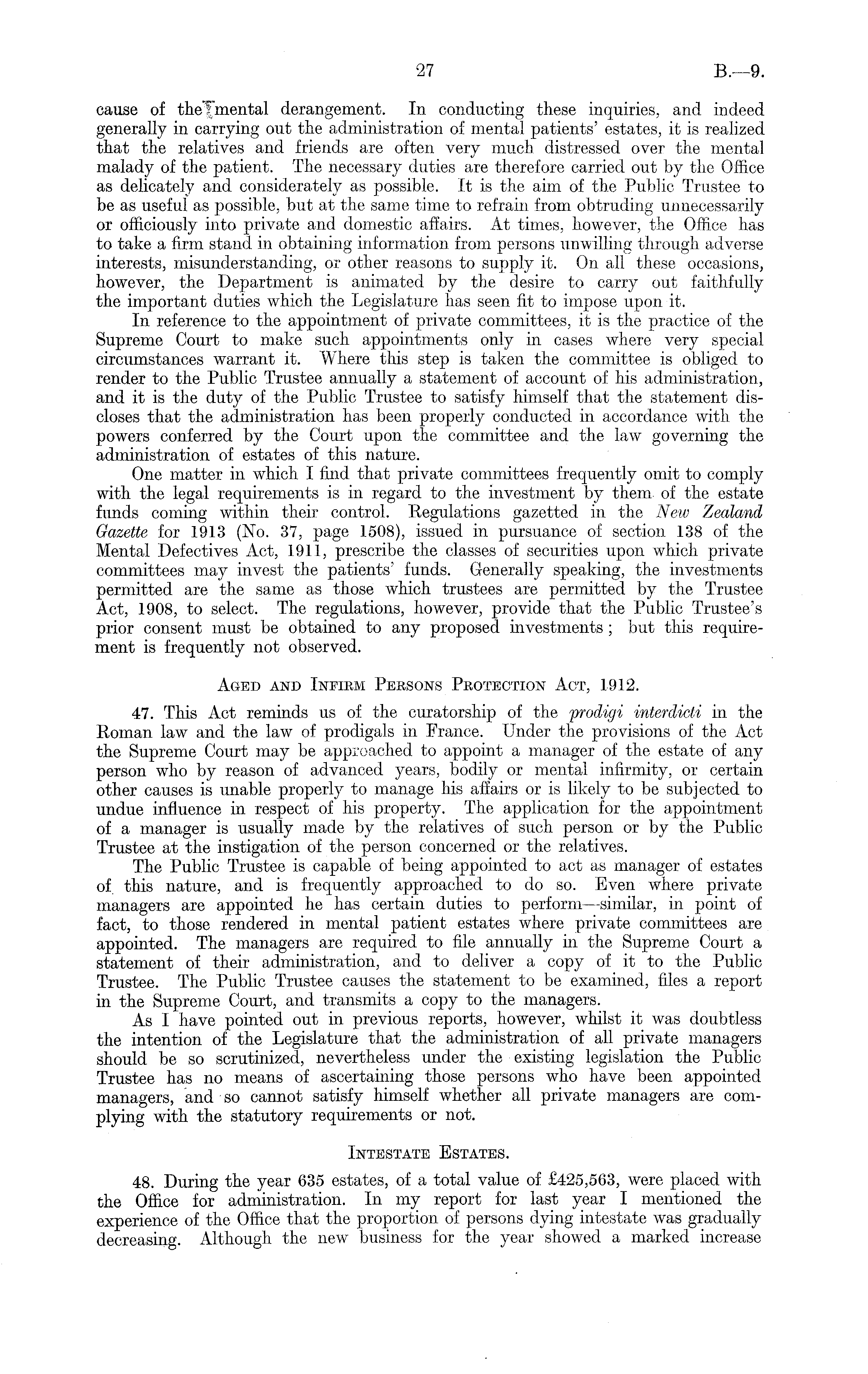 cause of the mental derangement. In conducting these inquiries, and indeed generally in carrying out the administration of mental patients' estates, it is realized that the relatives and friends are often very much distressed over the mental malady of the patient. The necessary duties are therefore carried out by the Office as delicately and considerately as possible. It is the aim of the Public Trustee to be as useful as possible, but at the same time to refrain from obtruding unnecessarily or officiously into private and domestic affairs. At times, however, the Office has to take a firm stand in obtaining information from persons unwilling through adverse interests, misunderstanding, or other reasons to supply it. On all these occasions, however, the Department is animated by the desire to carry out faithfully the important duties which the Legislature has seen fit to impose upon it. In reference to the appointment of private committees, it is the practice of the Supreme Court to make such appointments only in cases where very special circumstances warrant it. Where this step is taken the committee is obliged to render to the Public Trustee annually a statement of account of his administration, and it is the duty of the Public Trustee to satisfy himself that the statement discloses that the administration has been properly conducted in accordance with the powers conferred by the Court upon the committee and the law governing the administration of estates of this nature. One matter in which I find that private committees frequently omit to comply with the legal requirements is in regard to the investment by them of the estate funds coming within their control. Regulations gazetted in the New Zealand Gazette for 1913 (No. 37, page 1508), issued in pursuance of section 138 of the Mental Defectives Act, 1911, prescribe the classes of securities upon which private committees may invest the patients' funds. Generally speaking, the investments permitted are the same as those which trustees are permitted by the Trustee Act, 1908, to select. The regulations, however, provide that the Public Trustee's prior consent must be obtained to any proposed investments ; but this requirement is frequently not observed. Aged and Infirm Persons Protection Act, 1912. 47. This Act reminds us of the curatorship of the prodigi interdicti in the Roman law and the law of prodigals in France. Under the provisions of the Act the Supreme Court may be approached to appoint a manager of the estate of any person who by reason of advanced years, bodily or mental infirmity, or certain other causes is unable properly to manage his affairs or is likely to be subjected to undue influence in respect of his property. The application for the appointment of a manager is usually made by the relatives of such person or by the Public Trustee at the instigation of the person concerned or the relatives. The Public Trustee is capable of being appointed to act as manager of estates of this nature, and is frequently approached to do so. Even where private managers are appointed he has certain duties to perform —similar, in point of fact, to those rendered in mental patient estates where private committees are appointed. The managers are required to file annually in the Supreme Court a statement of their administration, and to deliver a copy of it to the Public Trustee. The Public Trustee causes the statement to be examined, files a report in the Supreme Court, and transmits a copy to the managers. As I have pointed out in previous reports, however, whilst it was doubtless the intention of the Legislature that the administration of all private managers should be so scrutinized, nevertheless under the existing legislation the Public Trustee has no means of ascertaining those persons who have been appointed managers, and so cannot satisfy himself whether all private managers are complying with the statutory requirements or not. Intestate Estates. 48. During the year 635 estates, of a total value of £425,563, were placed with the Office for administration. In my report for last year I mentioned the experience of the Office that the proportion of persons dying intestate was gradually decreasing. Although the new business for the year showed a marked increase