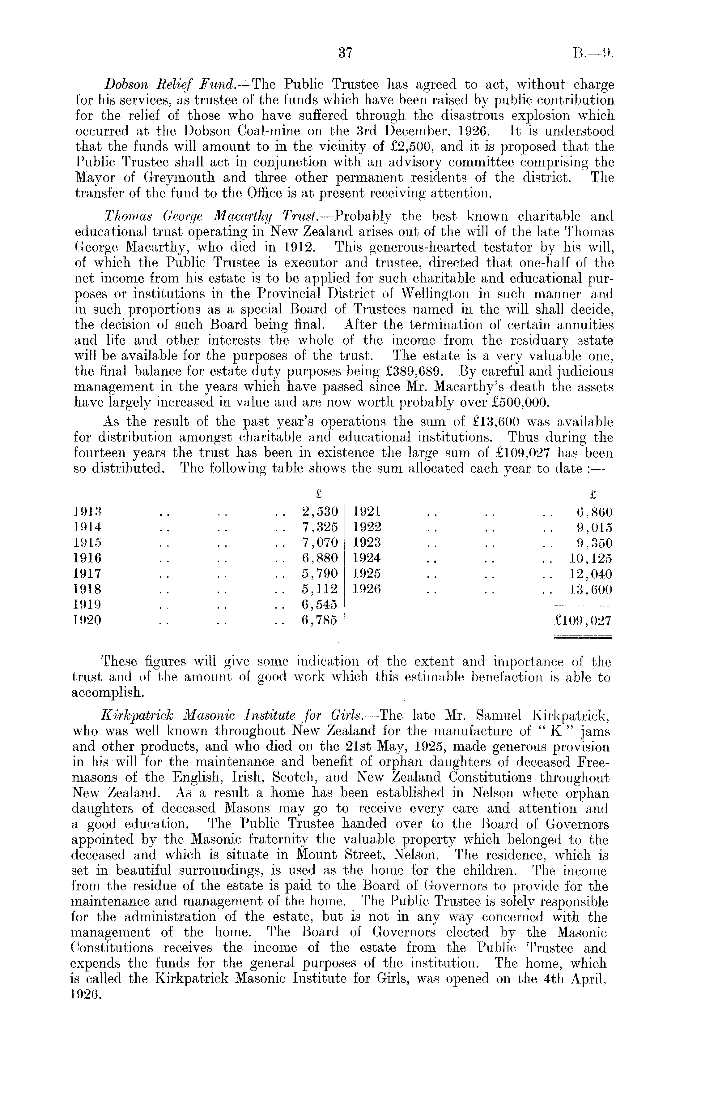 Dobson Relief Fund— The Public Trustee has agreed to act, without charge for his services, as trustee of the funds which have been raised by public contribution for the relief of those who have suffered through the disastrous explosion which occurred at the Dobson Coal-mine on the 3rd December, 1926. It is understood that the funds will amount to in the vicinity of £2,500, and it is proposed that the Public Trustee shall act in conjunction with an advisory committee comprising the Mayor of Greymouth and three other permanent residents of the district. The transfer of the fund to the Office is at present receiving attention. Thomas George Macarthy Trust. —Probably the best known charitable and educational trust operating in New Zealand arises out of the will of the late Thomas George Macarthy, who died in 1912. This generous-hearted testator by his will, of which the Public Trustee is executor and trustee, directed that one-half of the net income from his estate is to be applied for such charitable and educational purposes or institutions in the Provincial District of Wellington in such manner and in such proportions as a special Board of Trustees named in the will shall decide, the decision of such Board being final. After the termination of certain annuities and life and other interests the whole of the income from the residuary estate will be available for the purposes of the trust. The estate is a very valuable one, the final balance for estate duty purposes being £389,689. By careful and judicious management in the years which have passed since Mr. Macarthy's death the assets have largely increased in value and are now worth probably over £500,000. As the result of the past year's operations the sum of £13,600 was available for distribution amongst charitable and educational institutions. Thus during the fourteen years the trust has been in existence the large sum of £109,027 has been so distributed. The following table shows the sum allocated each year to date : £ £ 1913 .. .. .. 2,530 1921 .. .. .. 6,860 1914 .. .. .. 7,325 1922 .. .. .. 9,015 1915 .. .. ..7,070 1923 .. .. . 9.350 1916 .. .. 6,880 1924 .. .. ..10,125 1917 .. .. .. 5,790 1925 .. .. .. 12,040 1918 .. .. .. 5,112 1926 .. .. .. 13,600 1919 .. .. .. 6,545 1920 .. .. ..6,785 £109,027 These figures will give some indication of the extent and importance of the trust and of the amount of good work which this estimable benefaction is able to accomplish. Kirkpatrick Masonic Institute for Girls.—The late Mr. Samuel Kirkpatrick, who was well known throughout New Zealand for the manufacture of " K " jams and other products, and who died on the 21st May, 1925, made generous provision in his will for the maintenance and benefit of orphan daughters of deceased Freemasons of the English, Irish, Scotch, and New Zealand Constitutions throughout New Zealand. As a result a home has been established in Nelson where orphan daughters of deceased Masons may go to receive every care and attention and a good education. The Public Trustee handed over to the Board of Governors appointed by the Masonic fraternity the valuable property which belonged to the deceased and which is situate in Mount Street, Nelson. The residence, which is set in beautiful surroundings, is used as the home for the children. The income from the residue of the estate is paid to the Board of Governors to provide for the maintenance and management of the home. The Public Trustee is solely responsible for the administration of the estate, but is not in any way concerned with the management of the home. The Board of Governors elected by the Masonic Constitutions receives the income of the estate from the Public Trustee and expends the funds for the general purposes of the institution. The home, which is called the Kirkpatrick Masonic Institute for Girls, was opened on the 4th April, 1926.