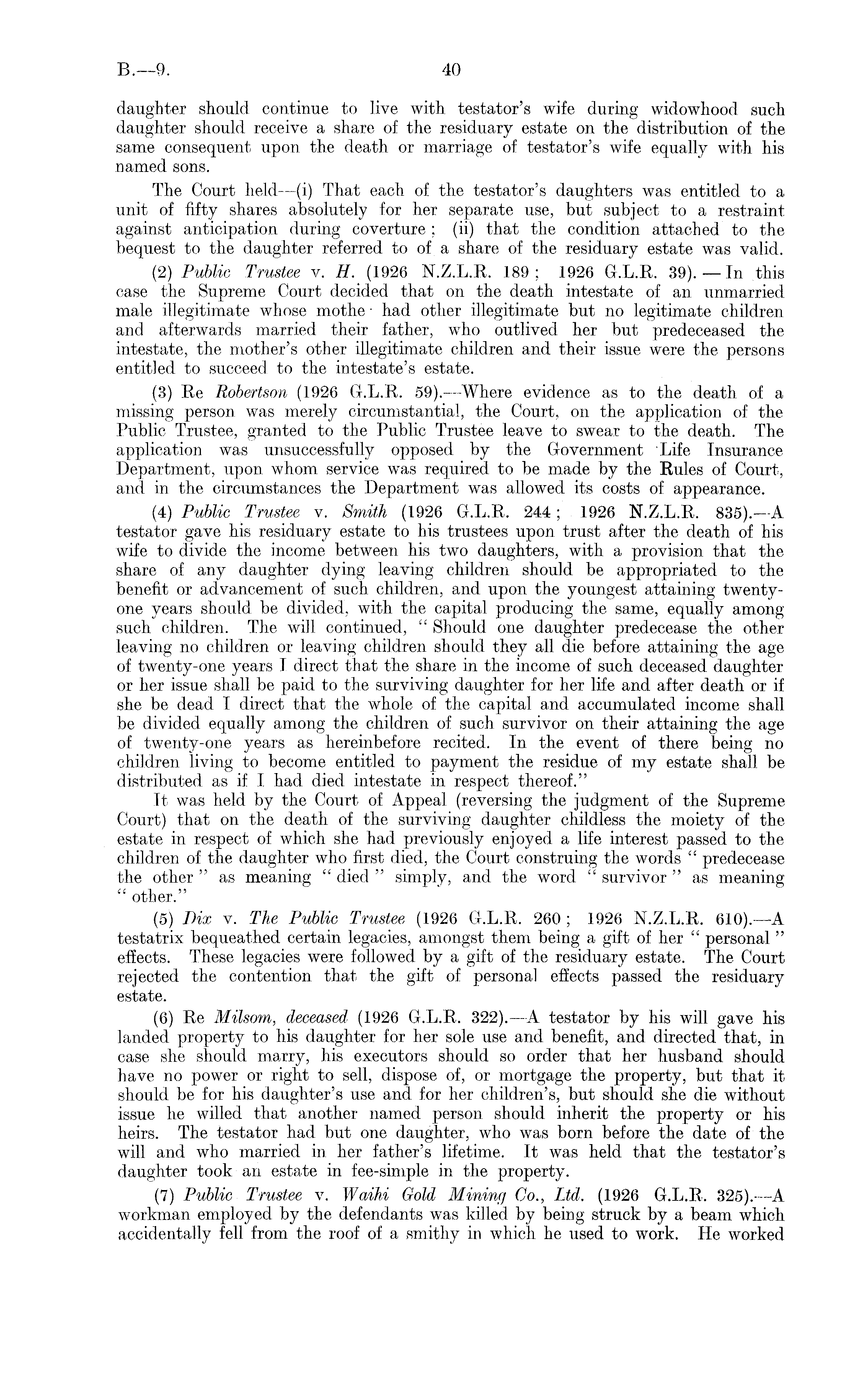 daughter should continue to live with, testator's wife during widowhood such daughter should receive a share of the residuary estate on the distribution of the same consequent upon the death or marriage of testator's wife equally with his named sons. The Court held —(i) That each of the testator's daughters was entitled to a unit of fifty shares absolutely for her separate use, but subject to a restraint against anticipation during coverture ; (ii) that the condition attached to the bequest to the daughter referred to of a share of the residuary estate was valid. (2) Public Trustee v. H. (1926 N.Z.L.R. 189; 1926 G.L.R. 39).—1n this case the Supreme Court decided that on the death intestate of an unmarried male illegitimate whose mothe: had other illegitimate but no legitimate children and afterwards married their father, who outlived her but predeceased the intestate, the mother's other illegitimate children and their issue were the persons entitled to succeed to the intestate's estate. (3) Re Robertson (1926 G.L.R. 59). —Where evidence as to the death of a missing person was merely circumstantial, the Court, on the application of the Public Trustee, granted to the Public Trustee leave to swear to the death. The application was unsuccessfully opposed by the Government 'Life Insurance Department, upon whom service was required to be made by the Rules of Court, and in the circumstances the Department was allowed its costs of appearance. (4) Public Trustee v. Smith (1926 G.L.R. 244 ; 1926 N.Z.L.R. 835). —A testator gave his residuary estate to his trustees upon trust after the death of his wife to divide the income between his two daughters, with a provision that the share of any daughter dying leaving children should be appropriated to the benefit or advancement of such children, and upon the youngest attaining twentyone years should be divided, with the capital producing the same, equally among such children. The will continued, " Should one daughter predecease the other leaving no children or leaving children should they all die before attaining the age of twenty-one years T direct that the share in the income of such deceased daughter or her issue shall be paid to the surviving daughter for her life and after death or if she be dead I direct that the whole of the capital and accumulated income shall be divided equally among the children of such survivor on their attaining the age of twenty-one years as hereinbefore recited. In the event of there being no children living to become entitled to payment the residue of my estate shall be distributed as if I had died intestate in respect thereof." Tt was held by the Court of Appeal (reversing the judgment of the Supreme Court) that on the death of the surviving daughter childless the moiety of the estate in respect of which she had previously enjoyed a life interest passed to the children of the daughter who first died, the Court construing the words " predecease the other " as meaning " died " simply, and the word " survivor " as meaning " other." (5) Dix v. The Public Trustee (1926 Gr.L.R. 260 ; 1926 N.Z.L.R. 610). —A testatrix bequeathed certain legacies, amongst them being a gift of her " personal " effects. These legacies were followed by a gift of the residuary estate. The Court rejected the contention that the gift of personal effects passed the residuary estate. (6) Re Milsom, deceased (1926 G.L.R. 322). —A testator by his will gave his landed property to his daughter for her sole use and benefit, and directed that, in case she should marry, his executors should so order that her husband should have no power or right to sell, dispose of, or mortgage the property, but that it should be for his daughter's use and for her children's, but should she die without issue he willed that another named person should inherit the property or his heirs. The testator had but one daughter, who was born before the date of the will and who married in her father's lifetime. It was held that the testator's daughter took an estate in fee-simple in the property. (7) Public Trustee v. Waihi Gold Minim/ Co., Ltd. (1926 G.L.R. 325). —A workman employed by the defendants was killed by being struck by a beam which accidentally fell from the roof of a smithy in which he used to work. He worked