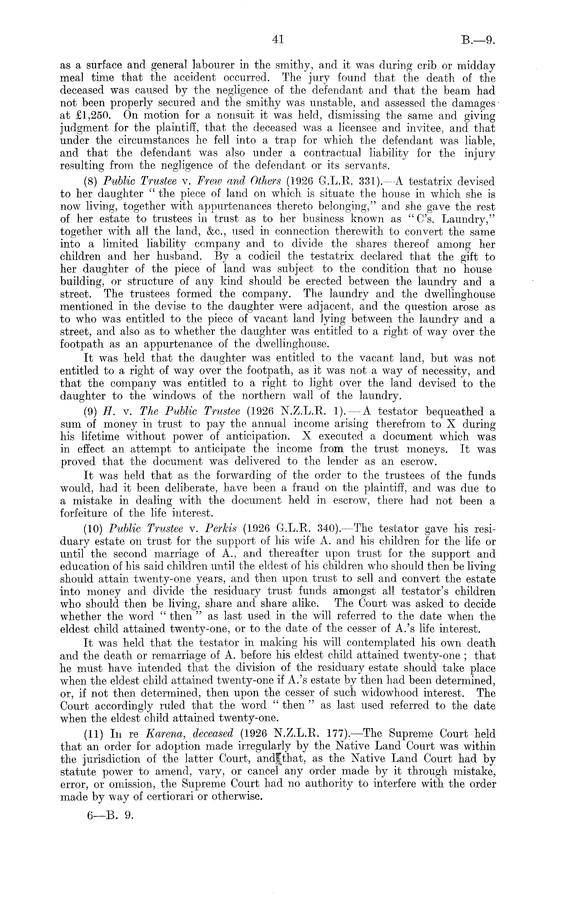as a surface and general labourer in the smithy, and it was during crib or midday meal time that the accident occurred. The jury found that the death of the deceased was caused by the negligence of the defendant and that the beam had not been properly secured and the smithy was unstable, and assessed the damages at £1,250. On motion for a nonsuit it was held, dismissing the same and giving judgment for the plaintiff, that the deceased was a licensee and invitee, and that under the circumstances he fell into a trap for which the defendant was liable, and that the defendant was also under a contractual liability for the injurv resulting from the negligence of the defendant or its servants. (8) Public Trustee v. Frew and Others (1926 G.L.R. 331).—A testatrix devised to her daughter " the piece of land on which is situate the house in which she is now living, together with appurtenances thereto belonging," and she gave the rest of her estate to trustees in trust as to her business known as " C's. Laundry," together with all the land, &c., used in connection therewith to convert the same into a limited liability company and to divide the shares thereof among her children and her husband. By a codicil the testatrix declared that the gift to her daughter of the piece of land was subject to the condition that no house building, or structure of any kind should be erected between the laundry and a street. The trustees formed the company. The laundry and the dwellinghouse mentioned in the devise to the daughter were adjacent, and the question arose as to who was entitled to the piece of vacant land lying between the laundry and a street, and also as to whether the daughter was entitled to a right of way over the footpath as an appurtenance of the dwellinghouse. It was held that the daughter was entitled to the vacant land, but was not entitled to a right of way over the footpath, as it was not a way of necessity, and that the company was entitled to a right to light over the land devised to the daughter to the windows of the northern wall of the laundry. (9) 11. v. The Public Trustee (1926 N.Z.L.R. 1). —A testator bequeathed a sum of money in trust to pay the annual income arising therefrom to X during his lifetime without power of anticipation. X executed a document which was in effect an attempt to anticipate the income from the trust moneys. It was proved that the document was delivered to the lender as an escrow. It was held that as the forwarding of the order to the trustees of the funds would, had it been deliberate, have been a fraud on the plaintiff, and was due to a mistake in dealing with the document held in escrow, there had not been a forfeiture of the life interest. (10) Public Trustee v. Perlds (1926 G.L.R. 340). —The testator gave his residuary estate on trust for the support of his wife A. and his children for the life or until the second marriage of A., and thereafter upon trust for the support and education of his said children until the eldest of his children who should then be living should attain twenty-one years, and then upon trust to sell and convert the estate into money and divide the residuary trust funds amongst all testator's children who should then be living, share and share alike. The Court was asked to decide whether the word " then " as last used in the will referred to the date when the eldest child attained twenty-one, or to the date of the cesser of A.'s life interest. It was held that the testator in making his will contemplated his own death and the death or remarriage of A. before his eldest child attained twenty-one ; that he must have intended that the division of the residuary estate should take place when the eldest child attained twenty-one if A.'s estate by then had been determined, or, if not then determined, then upon the cesser of such widowhood interest. The Court accordingly ruled that the word " then " as last used referred to the date when the eldest child attained twenty-one. (11) In re Karena, deceased (1926 N.Z.L.R. 177). —The Supreme Court held that an order for adoption made irregularly by the Native Land Court was within the jurisdiction of the latter Court, andfthat, as the Xative Land Court had by statute power to amend, vary, or cancel any order made by it through mistake, error, or omission, the Supreme Court had no authority to interfere with the order made by way of certiorari or otherwise.