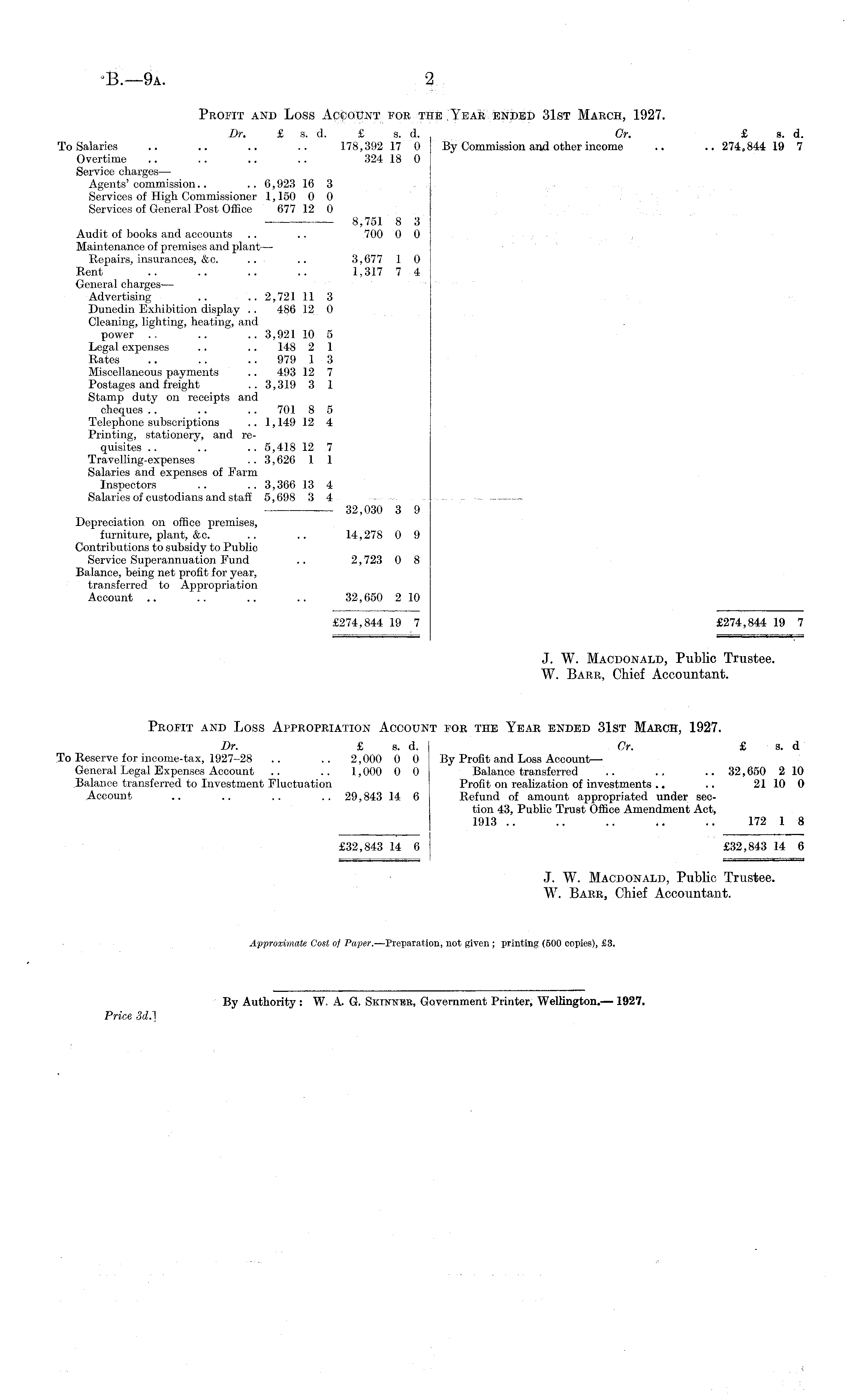 Profit and Loss Account for the Year ended 31st March, 1927. Dr. £ s. d. £ s. d. Gr. £ a. d. To Salaries .. .. .. .. 178,392 17 0 By Commission and other income .. .. 274,844 19 7 Overtime .. .. .. .. 324 18 0 Service charges— Agents' commission.. .. 6,923 16 3 Services of High Commissioner 1,150 0 0 Services of General Post Office 677 12 0 8,751 8 3 Audit of books and accounts .. .. 700 0 0 Maintenance of premises and plant— Repairs, insurances, &c. .. .. 3,677 1 0 Rent .. .. .. .. 1,317 7 4 General chargesAdvertising .. ..2,72111 3 Dunedin Exhibition display .. 486 12 0 Cleaning, lighting, heating, and power .. .. .. 3,921 10 5 Legal expenses .. .. 148 2 1 Rates .. .. .. 979 1 3 Miscellaneous payments .. 493 12 7 Postages and freight .. 3,319 3 1 Stamp duty on receipts and cheques .. .. .. 701 8 5 Telephone subscriptions .. 1,149 12 4 Printing, stationery, and requisites .. .. .. 5,418 12 7 Travelling-expenses .. 3,626 1 1 Salaries and expenses of Farm Inspectors .. .. 3,366 13 4 Salaries of custodians and staff 5,698 3 4 - —-—• 32,030 3 9 Depreciation on office premises, furniture, plant, &c. .. .. 14,278 0 9 Contributions to subsidy to Public Service Superannuation Fund .. 2,723 0 8 Balance, being net profit for year, transferred to Appropriation Account .. .. .. .. 32,650 2 10 £274,844 19 7 £274,844 19 7 J. W. Macdonald, Public Trustee. W. Barr, Chief Accountant. Profit and Loss Appropriation Account for the Year ended 31st March, 1927. Dr. £ s. d. Or. £ s. d To Reserve for income-tax, 1927-28 .. .. 2,000 0 0 By Profit and Loss Account — General Legal Expenses Account .. .. 1,000 0 0 Balance transferred .. .. .. 32,650 210 Balance transferred to Investment Fluctuation Profit on realization of investments.. .. 21 10 0 Account .. .. .. .. 29,843 14 6 Refund of amount appropriated under section 43, Public Trust Office Amendment Act, 1913 .. .. .. .. .. 172 1 8 £32,843 14 6 £32,843 14 6 J. W. Macdonald, Public Trustee. W. Barr, Chief Accountant.