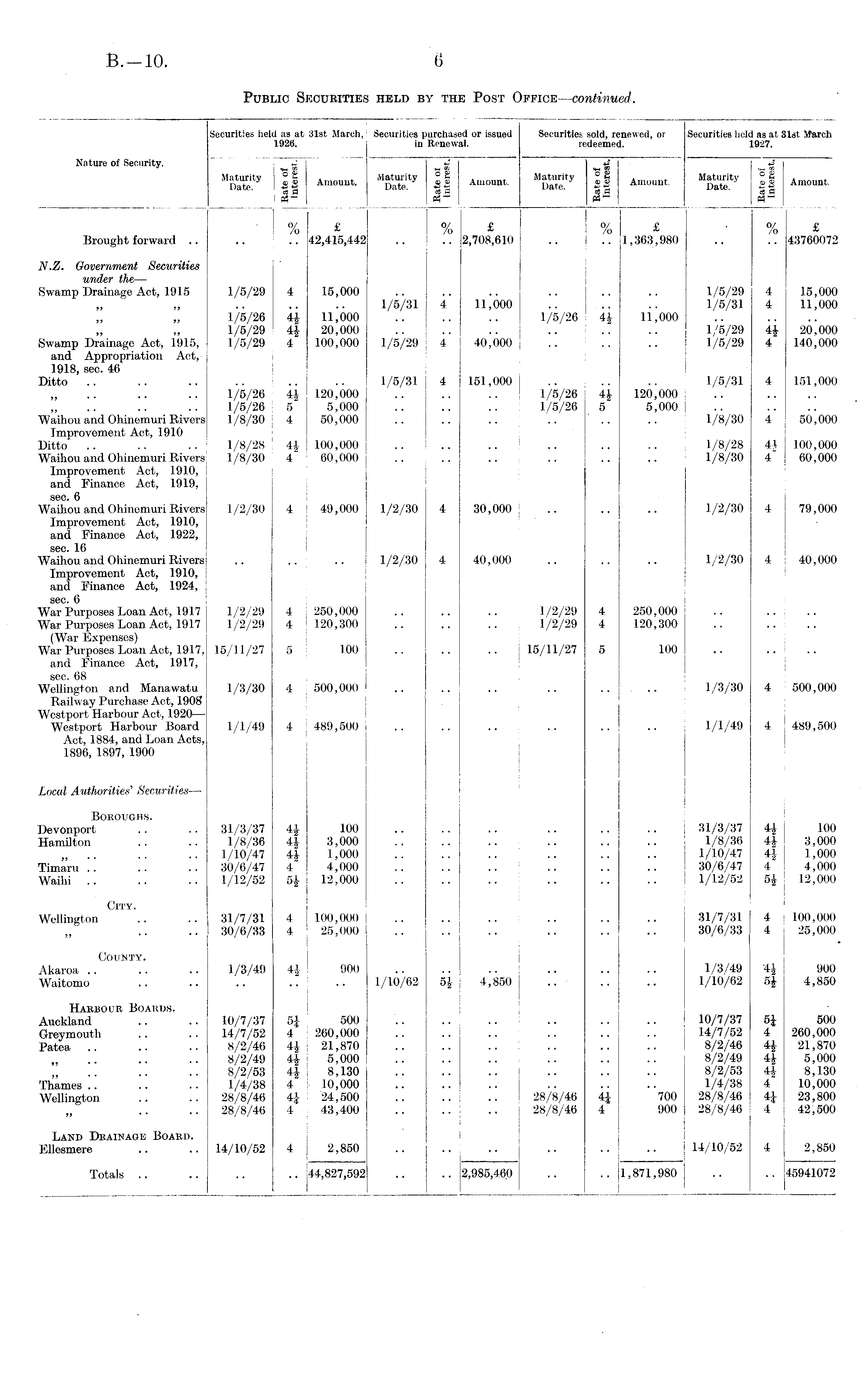 Securities held as at 31st March, Securities purchased or issued Securities sold, renewed, or Securities held as at 31st March 1926. in Renewal. redeemed. 1927. Nature of Security. ~~~U m vT y 1*1 Amount. — If Amount. If Amount ™' V !| Amount ra H cS H s h raw I «- M" % £ % £ % £ • % £ Brought forward .. .. .? 42,415,442 .. .? 2,708,610 .. 1,363,980 .. .? 43760072 N.Z. Governm&nt Securities ti/Ybcl@/r tha* Swamp Drainage Act, 1915 1/5/29 4 15,000 .. .. .. .. .. .. 1/5/29 4 15,000 1/5/31 4 11,000 .. .. .. 1/5/31 4 11,000 1/5/26 4J 11,000 1/5/26 4J 11,000 1/5/29 4J 20,000 .. . . .. 1/5/29 4J 20,000 Swamp Drainage Act, 1915, 1/5/29 4 100,000 1/5/29 4 40,000 j .. .. .. 1/5/29 4 140,000 and Appropriation Act, 1918, sec. 46 Ditto .. .. .. .. .. .. 1/5/31 4 151,000 I .. .. .. 1/5/31 4 151,000 1/5/26 4J 120,000 .. .. .. ! 1/5/26 4J 120,000 1/5/26 5 5,000 1/5/26 5 5,000: Waihou and Ohinemuri Rivers 1/8/30 4 50,000 .. .. .. .. .. .. 1/8/30 4 50,000 Improvement Act, 1910 Ditto .. .. .. 1/8/28 4J 100,000 .. .. .. 1/8/28 41 100,000 Waihou and Ohinemuri Rivers 1/8/30 4 60,000 .. .. .. .. .. .. 1/8/30 4 60,000 Improvement Act, 1910, and Finance Act, 1919, Waihou and Ohinemuri Rivers 1/2/30 4 ! 49,000 1/2/30 4 30,000 .. .. .. 1/2/30 4 79,000 Improvement Act, 1910, and Finance Act, J 922, sec. 16 Waihou and Ohinemuri Rivers .. .. .. 1/2/30 4 40,000 .. .. .. 1/2/30 4 40,000 Improvement Act, 1910, and Finance Act, 1924, sec. 6 War Purposes Loan Act, 1917 1/2/29 4 250,000 .. .. .. 1/2/29 4 250,000 War Purposes Loan Act, 1917 1/2/29 4 120,300 1/2/29 4 120,300 (War Expenses) War Purposes Loan Act, 1917, 15/11/27 5 | 100 15/11/27 5 100 and Finance Act, 1917, sec. 68 Wellington and Manawatu 1/3/30 4 500,000 .. .. .. .. .. .. 1/3/30 4 500,000 Railway Purchase Act, 1908 Westport Harbour Act, 1920— Westport Harbour Board 1/1/49 4 489,500 .. .. .. 1/1/49 4 489,500 Act, 1884, and Loan Acts, 1896, 1897, 1900 Local Authorities' Securities— Boroughs. Devonport .. .. 31/3/37 4J 100 .. .. .. .. .. .. 31/3/37 4£ 100 Hamilton .. .. 1/8/36 3,000 .. .. .. .. .. .. 1/8/36 3,000 „ .. .. 1/10/47 4| 1,000 .. .. .. 1/10/47 4J 1,000 Timaru .. .. .. 30/6/47 4 4,000 .. .. .. .. .. .. 30/6/47 4 4,000 Wailii .. .. .. 1/12/52 5| 12,000 .. .. .. 1/12/52 5J 12,000 City. Wellington .. .. 31/7/31 4 100,000 ! .. .. .. 31/7/31 4 100,000 30/6/33 4 25,000 .. .. .. .. .. .. 30/6/33 4 25,000 County. Akaroa .. .. .. 1/3/49 H 900 .. .. .. 1/3/49 4| 900 Waitomo .. .. .. .1 .. 1/10/62 5J 4,850 .. .. .. 1/10/62 5£ 4,850 Harbour Boards. Auckland .. .. 10/7/37 5J 500 .. .. .. ; 10/7/37 5J 500 Oreymouth .. .. 14/7/52 4 260,000 .. .. .. 14/7/52 4 260,000 Patea .. .. .. 8/2/46 4£ 21,870 .. .. .. ! 8/2/46 4| 21,870 8/2/49 44 5,000 .. .. .. 8/2/49 4£ 5,000 8/2/53 4i 8,130 .. .. .. 8/2/53 4£ 8,130 Thames .. .. .. 1/4/38 4 10,000 .. .. .. 1/4/38 4 10,000 Wellington .. .. 28/8/46 4| 24,500 28/8/46 4{ : 700 28/8/46 4J- 23,800 28/8/46 4 43,400 .. .. .. 28/8/46 4 900 28/8/46 4 42,500 Land Drainage Board. Ellesmere .. .. 14/10/52 4 2,850 .. .. .. 14/10/52 4 2,850 Totals .. .. .. .. 44,827,592 .. j 2,985,460 .. .. 1,871,980 .. .. 45941072