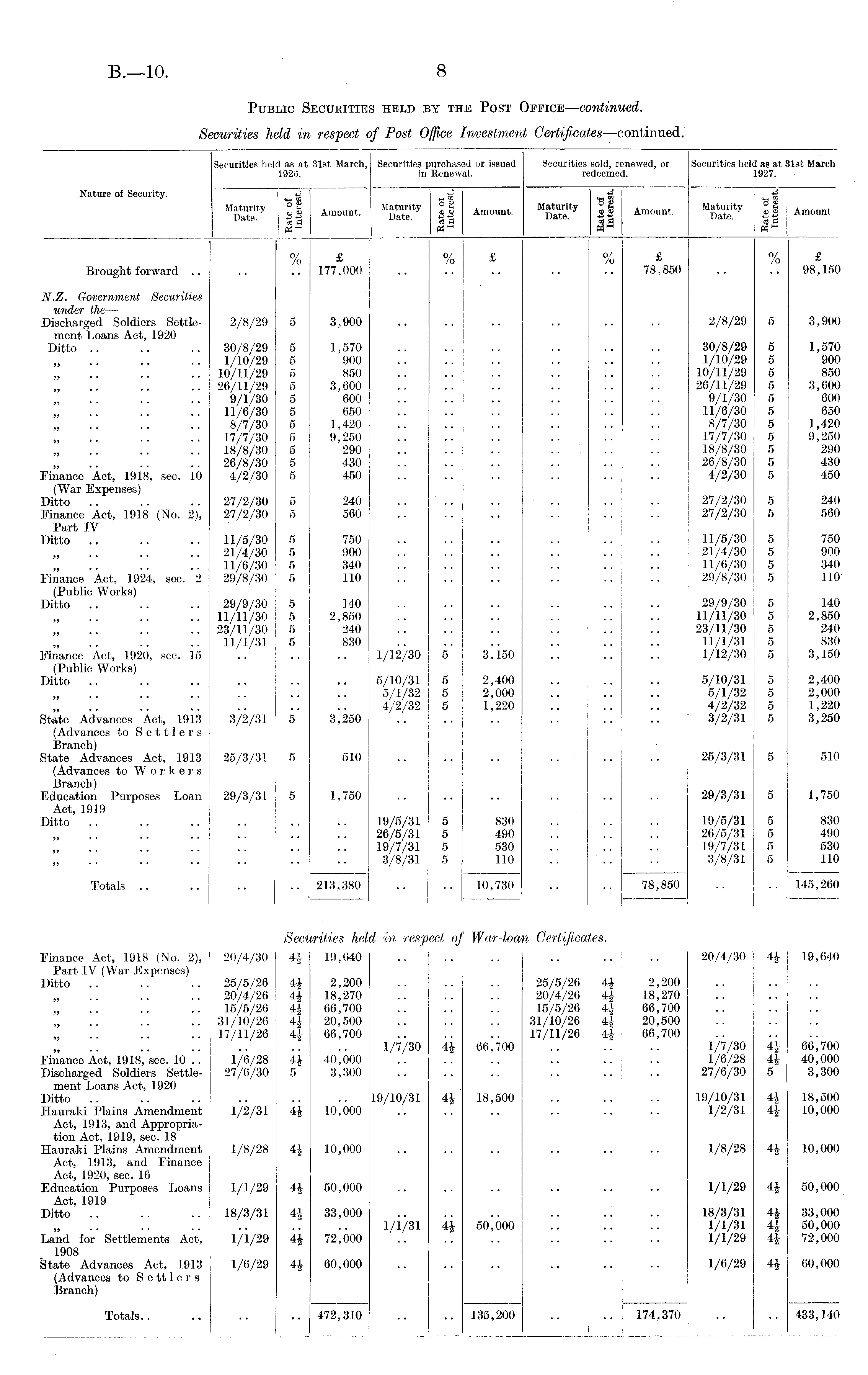 Securities held as at 31st March, Securities purchased or issued Securities sold, renewed, or Securities held as at 31st March 1926. in Renewal. redeemed. 1927. Nature of Security, i -g -g -g -g* M {£T '|l Amount. « I! Amount. || Amonnt . Maturity |J Am01mt ci H com ASH cow jp=- % £ % £ % £ % £ _ Brought forward .. .. .. 177,000 .. .. .. .. .. 78,850 .. .. 98,150 N.Z. Government Securities under the — Discharged Soldiers Settle- 2/8/29 5 3,900 .. .. .. .. .. .. 2/8/29 5 3,900 ment Loans Aet, 1920 Ditto .. .. .. 30/8/29 5 1,570 .. .. .. .. .. .. 30/8/29 5 1,570 1/10/29 5 900 .. .. .. 1/10/29 5 900 10/11/29 5 850 .. .. .. 10/11/29 5 850 .. 26/11/29 5 3,600 .. .. .. 26/11/29 5 3,600 9/1/30 5 600 .. .. . . 9/1/30 5 600 11/6/30 5 650 .. .. .. 11/6/30 5 650 8/7/30 5 1,420 .. .. .. 8/7/30 5 1,420 17/7/30 5 9,250 .. .. .. .. .. .. 17/7/30 5 9,250 18/8/30 5 290 .... .. 18/8/30 5 290 26/8/30 5 .430 .. .. .. 26/8/30 5 430 Finance Act, 1918, sec. 10 4/2/30 5 450 .. .. .. 4/2/30 5 450 (War Expenses) i Ditto .. .. .. 27/2/30 5 240 .. . . .. 27/2/30 5 240 Finance Act, 1918 (No. 2), 27/2/30 5 560 .. . . .. 27/2/30 5 560 Part IV Ditto .. .. .. 11/5/30 5 750 .. .. .. 11/5/30 5 750 21/4/30 5 900 .. .. .. 21/4/30 5 900 11/6/30 5 340 .. .. .. 11/6/30 5 340 Finance Aet, 1924, sec. 2 29/8/30 5 110 .. .. .. 29/8/30 5 110 (Public Works) Ditto .. .. .. 29/9/30 5 140 . . .. .. .. .. .. 29/9/30 5 140 .. 11/11/30 5 2,850 .. .. .. 11/11/30 5 2,850 .. 23/11/30 5 240 .. .. .. 23/11/30 5 240 11/1/31 5 830 .. .. .. 11/1/31 5 830 Finance Act, 1920, sec. 15 .. .. .. 1/12/30 5 3,150 .. .. .. 1/12/30 5 3,150 (Public Works) Ditto .. .. .. .. .. .. 5/10/31 5 2,400 .. .. .. 5/10/31 5 2,400 | .. .. 5/1/32 5 2,000 .. .. .. 5/1/32 5 2,000 .. .. 4/2/32 5 1,220 .. .. .. 4/2/32 5 1,220 State Advances Act, 1913 3/2/31 5 3,250 .. .. .. 3/2/31 5 3,250 (Advances to Settlers { Branch) State Advances Act, 1913 25/3/31 5 510 .. .. .. 25/3/31 5 510 (Advances to Workers Branch) Education Purposes Loan 29/3/31 5 1,750 .. .. .. .. .. .. 29/3/31 5 1,750 Act, 1919 Ditto .. .. .. .. .. .. 19/5/31 5 830 .. .. .. 19/5/31 5 830 26/5/31 5 490 .. .. .. 26/5/31 5 490 19/7/31 5 530 .. .. .. 19/7/31 5 530 3/8/31 5 110 .. .. .. 3/8/31 5 110 Totals .. .. .. .. 213,380 .. .. 10,730 .. .. 78,850 .. .. 145,260 Securities held in respect of War-loan Certificates. Finance Act, 1918 (No. 2), 20/4/30 44 19,040 .. .. .. 20/4/30 4£ 19,640 Part IV (War Expenses) Ditto .. .. .. 25/5/26 4| 2,200 25/5/26 4J 2,200 20/4/26 4i 18,270 .. .. .. 20/4/26 4J 18,270 15/5/26 4i 66,700 15/5/26 4| 66,700 .. 31/10/26 4J 20,500 .. .. .. 31/10/26 4J 20,500 .. 17/11/26 4i 66,700 17/11/26 4| 66,700 1/7/30 4J 66,700 .. .. .. 1/7/30 4i 66,700 Finance Act, 1918, sec. 10 .. 1/6/28 4J 40,000 .. .. .. 1/6/28 44 40,000 Discharged Soldiers Settle- 27/6/30 5 3,300 .. .. .. .. .. .. 27/6/30 5 3,300 ment Loans Act, 1920 Ditto .. .. .. .. .. .. 19/10/31 4J 18,500 .. .. .. 19/10/31 4* 18,500 Hauraki Plains Amendment 1/2/31 4J 10,000 .. .. .. .. .. .. 1/2/31 4J 10,000 Act, 1913, and Appropriation Act, 1919, sec. 18 Hauraki Plains Amendment 1/8/28 4h 10,000 .. .. .. .. .. .. 1/8/28 44 10,000 Act, 1913, and Finance Act, 1920, sec. 16 Education Purposes Loans 1/1/29 44 50,000 .. .. .. .. .. .. 1/1/29 44 50,000 Act, 1919 Ditto .. .. .. 18/3/31 44 33,000 .. .. .. 18/3/31 4J 33,000 .T .. 1/1/31 44 50,000 .. .. .. 1/1/31 4J 50,000 Land for Settlements Act, 1/1/29 44 72,000 .. .. .. .. .. •• 1/1/29 44 72,000 1908 State Advances Act, 1913 1/6/29 4f 60,000 .. .. .. .. .. .. 1/6/29 44 60,000 (Advances to S e tt 1 e r s Branch) Totals.. .. .. .. 472,310 .. .. 135,200 .. .. 174,370 .. .. 433,140