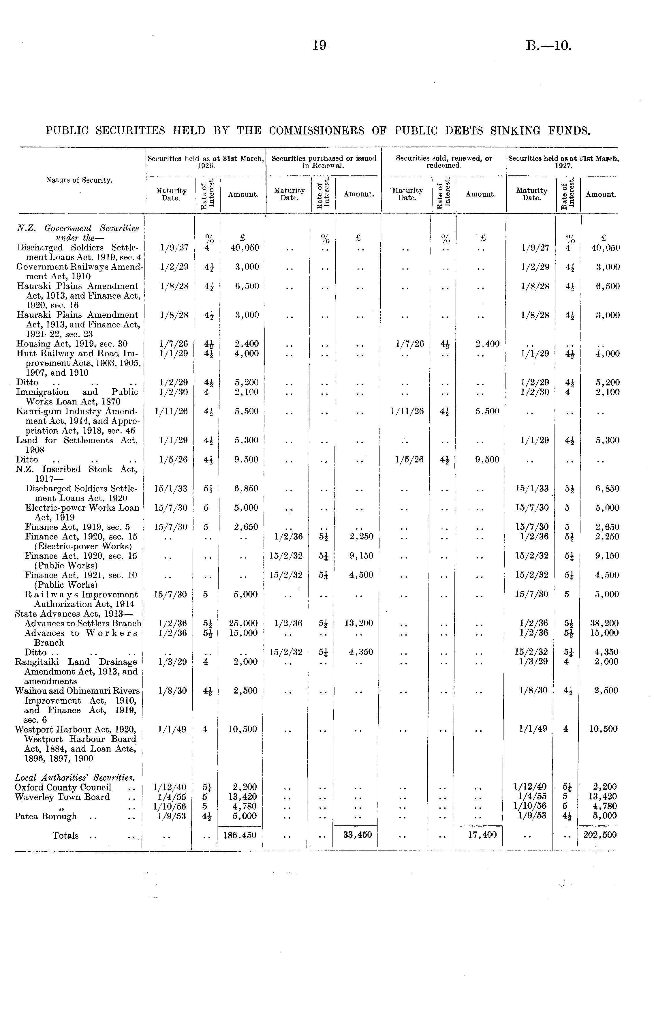 Securities held as at 31st March, Securities purchased or issued Securities sold, renewed, or Securities held as at 31st March. 1926. in Renewal. redeemed. 1927. Nature of Security. -g -g If amount. ~ If *—». — II A -unt. Maturity J J Am0UD , d a ce p «s s ess rt" P3~ I pi(-' I N.Z. Government Securities under the— % , £ % £ % £ % £ Discharged Soldiers Settle- 1/9/27 4 j 40,050 .. .. .. .. .. .. 1/9/27 4 40,050 ment Loans Act, 1919, sec. 4 Government Railways Amend- 1/2/29 41 j 3,000 .. .. .. .. .. .. 1/2/29 44 3,000 ment Act, 1910 j Hauraki Plains Amendment 1/8/28 4J j 6,500 .. .. .. .. .. .. 1/8/28 4|- (5,500 Act, 1913, and Finance Act, | 1920, sec. 16 Hauraki Plains Amendment ! 1/8/28 4J j 3,000 .. .. .. .. .. .. 1/8/28 4£ 3,000 Act, 1913, and Finance Act, 1921-22, sec. 23 Housing Act, 1919, sec. 30 1/7/26 4J 2,400 .. .. .. 1/7/26 41 2,400 Hutt Railway and Road Im- 1/1/29 4J I 4,000 .. .. .. .. .. .. 1/1/29 4J 4,000 provement Acts, 1903,1905, 1907, and 1910 1 Ditto .. .. .. 1/2/29 4i 5,200 ! I .. .. .. 1/2/29 4| 5,200 Immigration and Public 1/2/30 4 2,100 j .. .. .. .. .. .. 1/2/30 4 2,100 Works Loan Act, 1870 Kauri-gum Industry Amend- 1/11/26 4h 5,500 I .. .. .. 1/11/26 4£ 5,500 ment Act, 1914, and Appropriation Act, 1918, sec. 45 Land for Settlements Act, 1/1/29 4b 5,300 ; .. .. .. ! .. .. 1/1/29 4\ 5,300 1908 Ditto .. .. .. 1/5/26 4J 9,500 ! .. ., .1/5/26 4£ 9,500 N.Z. Inscribed Stock Act, 1917— Discharged Soldiers Settle- 15/1/33 5J 6,850 .. .. ..I .. .. .. 15/1/33 5| 6,850 ment Loans Act, 1920 Electric-power Works Loan 15/7/30 5 5,000 .. .. .. j .. .. .. 15/7/30 5 5,000 Act, 1919 ' j Finance Act, 1919, sec. 5 15/7/30 5 2,650 .. .. .. .. .. .. 15/7/30 5 2,650 Finance Act, 1920, sec. 15 .. .. .. 1/2/36 5£ 2,250 .. .. .. 1/2/36 5J 2,250 (Electric-power Works) Finance Act, 1920, sec. !5 .. .. .. 15/2/32 5J 9,150 .. .. .. 15/2/32 5J 9,150 (Public Works) Finance Act, 1921, sec. 10 .. .. .. 15/2/32 5£ 4,500 .. .. .. 15/2/32 5J 4,500 (Public Works) R ai 1 w ay s Improvement 15/7/30 5 5,000 .. .. .. .. .. .. 15/7/30 5 5,000 Authorization Act, 1914 State Advances Act, 1913 — Advances to Settlers Branch 1/2/36 5| 25,000 1/2/36 5J 13,200 .. .. .. 1/2/36 5| 38,200 Advances to Workers 1/2/36 6J 15,000 .. .. .. .. .. .. 1/2/36 5| 15,000 Branch Ditto .. .. .. .. .. .. 15/2/32 5£ 4,350 .. .. .. 15/2/32 5£ 4,350 Rangitaiki Land Drainage 1/3/29 4 2,000 .. .. .. .. .. .. 1/3/29 4 2,000 Amendment Act, 1913, and amendments Waihou and Ohinemuri Rivers 1/8/30 4J 2,500 .. .. .. .. .. .. 1/8/30 4£ 2,500 Improvement Act, 1910, and Finance Act, 1919, sec. 6 Westport Harbour Act, 1920, 1/1/49 4 10,500 .. .. .. .. .. .. 1/1/49 4 10,500 Westport Harbour Board Act, 1884, and Loan Acts,' 1896, 1897, 1900 Local Authorities' Securities. Oxford County Council .. 1/12/40 5J 2,200 .. .. .. .. .. .. 1/12/40 5| 2,200 Waverley Town Board .. 1/4/55 5 13,420 .. .. .. 1/4/55 5 13,420 1/10/56 5 4,780 .. .. .. 1/10/56 5 4,780 Patea Borough .. .. 1/9/53 4j 5,000 .. .. .. .. .. .. 1/9/53 4i 5,000 Totals .. .. .. .. 186,450 .. .. 33,450 .. .. 17,400 J .. .. 202,500