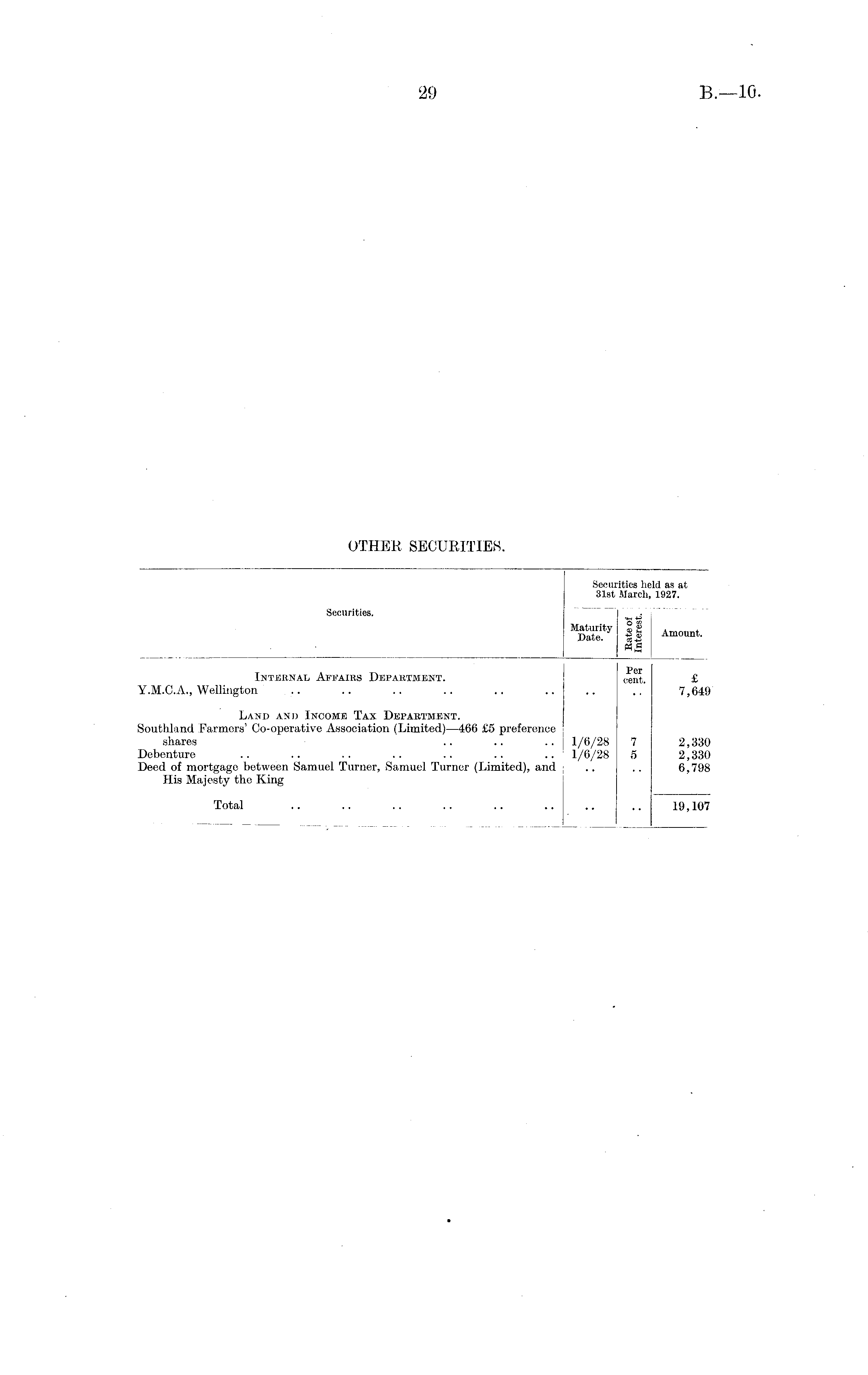 Securities held as at 31st March, 1927. Securities. Maturity S g Date. ta JS Amount - _ I Per Internal Affairs Department. cen t. £ Y.M.C.A., Wellington .. .. .. .. .. .. .. . 7,649 Land and Income Tax Department. Southland Farmers' Co-operative Association (Limited) —466 £5 preference shares .. .. .. 1/6/28 7 2,330 Debenture .. .. .. .. .. .. .. 1/6/28 5 2,330 Deed of mortgage between Samuel Turner, Samuel Turner (Limited), and .. .. 6,798 His Majesty the King Total .. .. .. .. .. .. .. .. 19,107