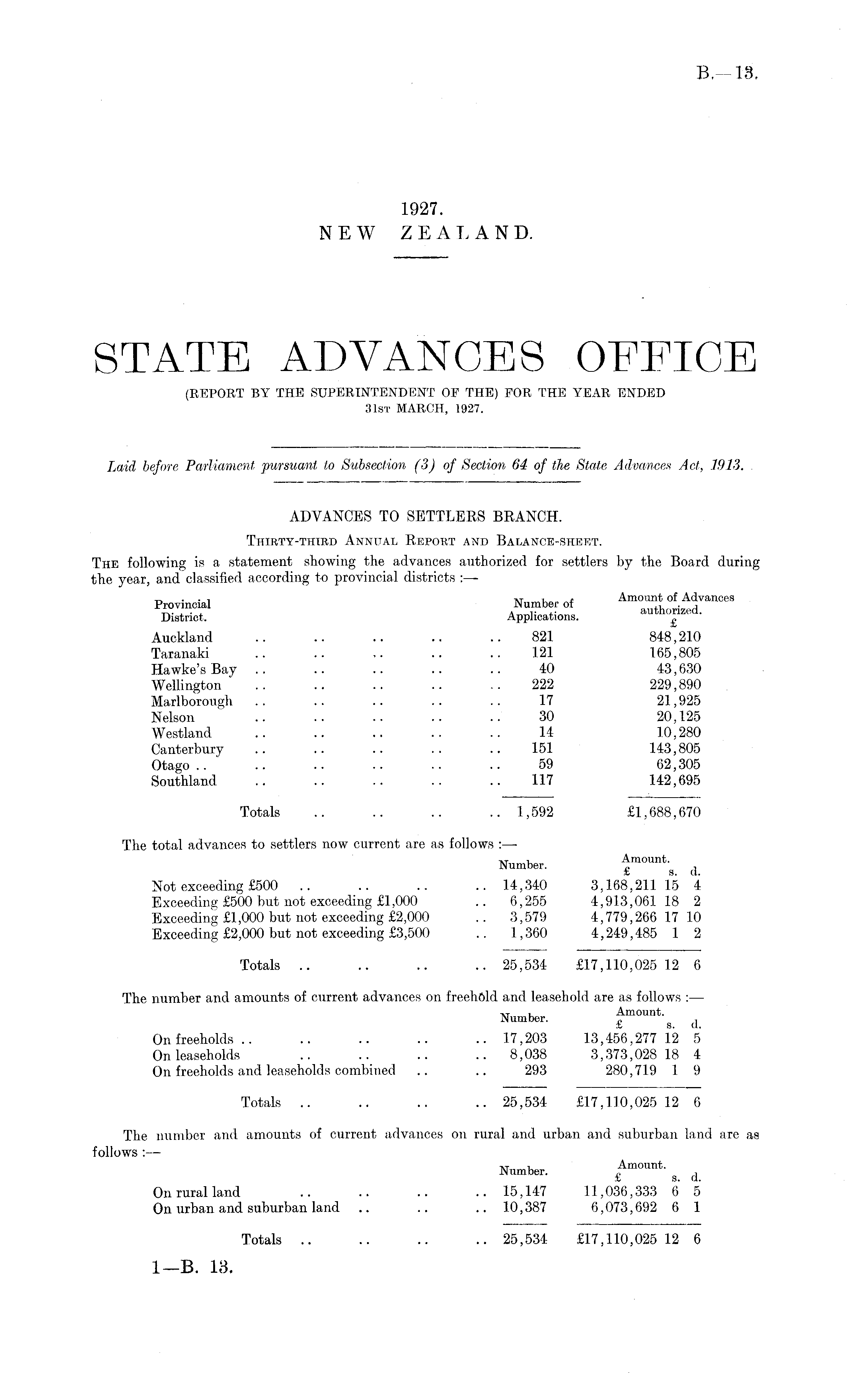 STATE ADVANCES OFFICE (REPORT BY THE SUPERINTENDENT OF THE) FOR THE YEAR ENDED 31st MARCH, 1927.