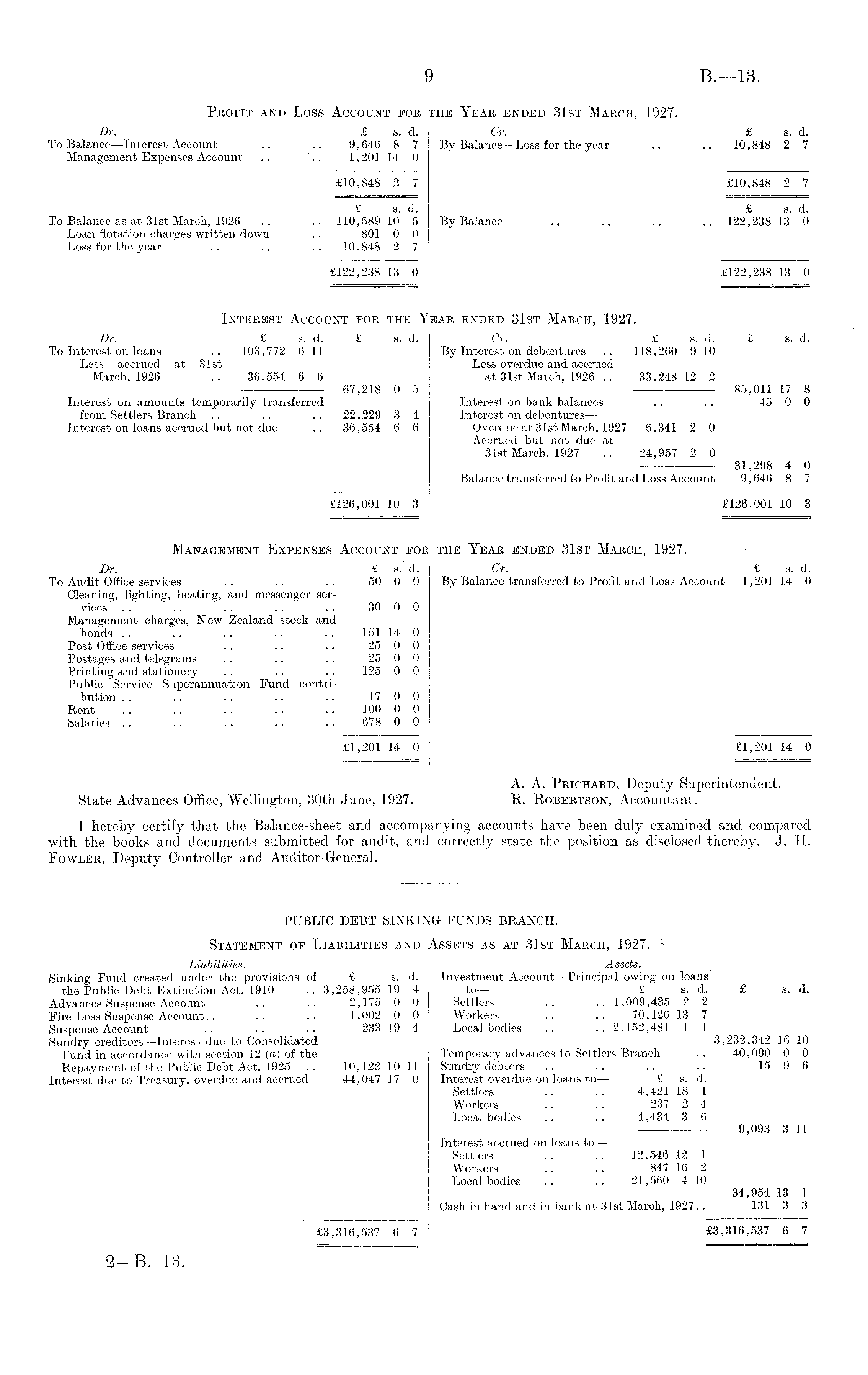 Profit and Loss Account foe the Year ended 31st March, 1927. Dr. £ s. d. Or. £ s. d. To Balance—lnterest Account .. .. 9,646 8 7 By Balance—Loss for the year .. .. 10,848 2 7 Management Expenses Account .. .. 1,201 14 0 £10,848 2 7 £10,848 2 7 £sd £ s d To Balance as at 31st March, 1926 .. .. 110,589 10 5 By Balance .. .. .. .. 122,238 13 0 Loan-flotation charges written down .. 801 0 0 Loss for the year .. .. .. 10,848 2 7 £122,238 13 0 £122,238 13 0 Interest Account for the Year ended 31st March, 1927. Dr. £ s. d. £ s. d. Gr. £ s. d. £ s. d. To Interest on loans .. 103,772 611 By Interest on debentures .. 118,260 910 Less accrued at 31st Less overdue and accrued March, 1926 .. 36,554 6 6 at 31st March, 1926 .. 33,248 12 2 67,218 0 5 85,011 17 8 Interest on amounts temporarily transferred Interest on bank balances .. .. 45 0 0 from Settlers Branch .. .. .. 22,229 3 4 Interest on debentures— Interest on loans accrued but not due .. 36 ,554 6 6 Overdue at 31st March, 1927 6,341 2 0 Accrued but not due at 31st March, 1927 .. 24,957 2 0 31,298 4 0 Balance transferred to Profit and Loss Account 9,646 8 7 £126,001 10 3 £126,001 10 3 Management Expenses Account for the Year ended 31st March, 1927. Dr. £ s. d. Or. £ s. d. To Audit Office services .. .. .. 50 0 0 By Balance transferred to Profit and Loss Account 1,201 14 0 Cleaning, lighting, heating, and messenger services .. .. .. .. .. 30 0 0 Management charges, New Zealand stock and bonds .. . . .. .. .. 151 14 0 Post Office services .. .. .. 25 0 0 Postages and telegrams .. .. .. 25 0 0 Printing and stationery .. .. .. 125 0 0 Public Service Superannuation Fund contribution . . .. .. .. .. 17 0 0 Rent .. .. .. .. .. 100 0 0 Salaries .. .. .. .. .. 678 0 0 £1,201 14 0 £1,201 14 0 A. A. Prichard, Deputy Superintendent. State Advances Office, Wellington, 30th June, 1927. E. Robertson, Accountant. I hereby certify that the Balance-sheet and accompanying accounts have been duly examined and compared with the books and documents submitted for audit, and correctly state the position as disclosed thereby. —J. H. Fowler, Deputy Controller and Auditor-General. PUBLIC DEBT SINKING FUNDS BRANCH. Statement of Liabilities and Assets as at 31st March, 1927. * Liabilities. Assets. Sinking Fund created under the provisions of £ s. d. Investment Account—Principal owing on loans the Public Debt Extinction Act, 1910 .. 3,258,955 19 4 to— £ s. d. £ s. d. Advances Suspense Account .. .. 2,175 0 0 Settlers .. .. 1,009,435 2 2 Fire Loss Suspense Account.. .. .. 1,002 0 0 Workers .. .. 70,426 13 7 Suspense Account .. .. .. 233 19 4 Local bodies .. .. 2,152,481 1 1 Sundry creditors —Interest due to Consolidated 3,232,342 16 10 Fund in accordance with section 12 (a) of the Temporary advances to Settlers Branch .. 40,000 0 0 Repayment of the Public Debt Act, 1925 .. 10,122 10 11 Sundry debtors .. .. .. .. 15 9 6 Interest due to Treasury, overdue and accrued 44,047 17 0 Interest overdue on loans to— £ s. d. Settlers .. .. 4,421 18 1 Workers .. .. 237 2 4 Local bodies .. .. 4,434 3 6 9,093 3 11 Interest accrued on loans to — Settlers .. .. 12,546 12 1 Workers .. .. 847 16 2 Local bodies .. .. 21,560 4 10 - 34,954 13 1 Cash in hand and in bank at 31st March, 1927.. 131 3 3 £3,316,537 6 7 £3,316,537 6 7