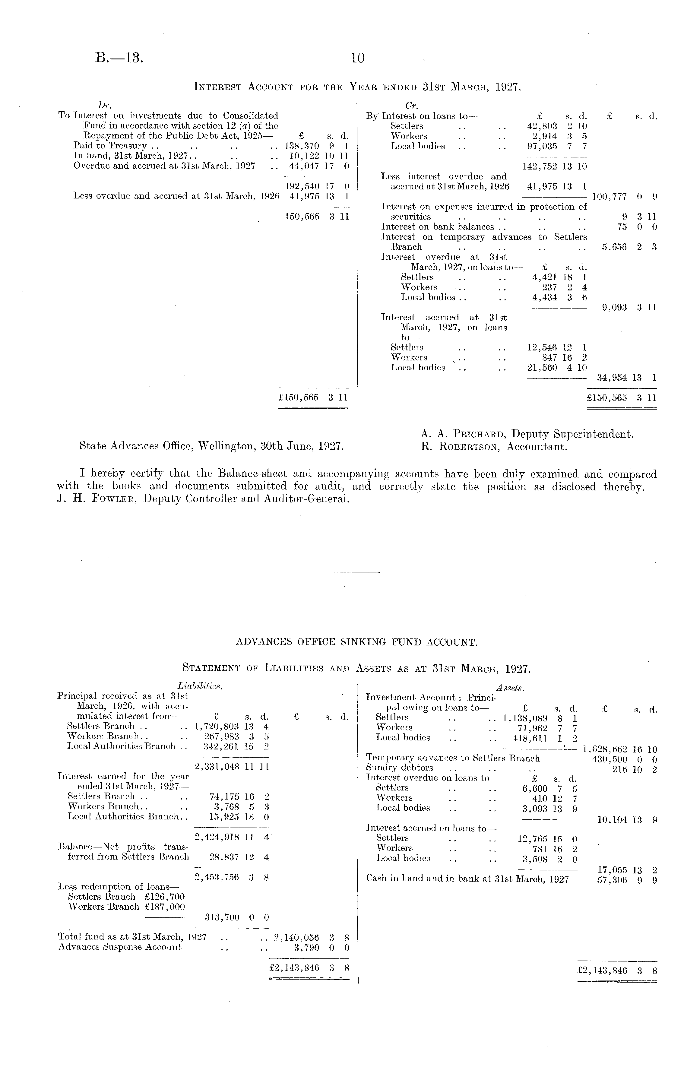 ADVANCES OFFICE SINKING FUND ACCOUNT. Statement of Liabilities and Assets as at 31st March, 1927. Liabilities. Assets. Principal received as at 31st Investment Account : PrinciMarch, 1926, with accu- pal owing on loans to— £ s. d. £ s. d. mulated interest from— £ s. d. £ s. d. Settlers .. .. 1,138,089 8 1 Settlers Branch .. .. 1,720,803 13 4 Workers .. .. 71,962 7 7 Workers Branch.. .. 267,983 3 5 Local bodies .. .. 418,611 1 2 Local Authorities Branch .. 342,261 15 2 i 1,628,662 16 10 Temporary advances to Settlers Branch 430,500 0 0 2,331,048 11 11 Sundry debtors .. .. .. 216 10 2 Interest earned for the year Interest overdue on loans to— £ s. d. ended 31st March, 1927 — Settlers .. .. 6,600 7 5 Settlers Branch .. .. 74,175 16 2 Workers .. .. 410 12 7 Workers Branch.. .. 3,768 5 3 Local bodies .. .. 3,093 13 9 Local Authorities Branch.. 15,925 18 0 ]0 104 13 9 Interest accrued on loans to — 2,424,918 11 4 Settlers .. .. 12,765 15 0 Balance—Net profits trans- Workers .. .. 781 16 2 ferred from Settlers Branch 28,837 12 4 Local bodies .. .. 3,508 2 0 —— 17,055 13 2 2,453,756 3 8 Cash in hand and in bank at 31st March, 1927 57,306 9 9 Less redemption of loans— Settlers Branch £126,700 Workers Branch £187,000 313,700 0 0 Total fund as at 31st March, 1927 .. .. 2,140,056 3 8 Advances Suspense Account .. .. 3,790 0 0 £2,143,846 3 8 £2,143,846 3 8