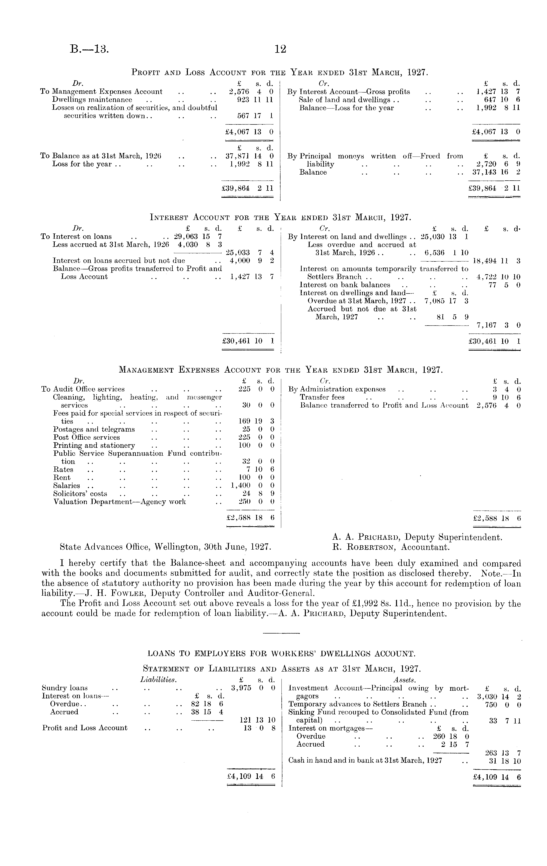Profit and Loss Account for the Year ended 31st March, 1927. Dr. £ s. d. Cr. £ s. d. To Management Expenses Account .. .. 2,576 4 0 By Interest Account —Gross profits .. .. 1,427 13 7 Dwellings maintenance .. .. .. 923 11 11 Sale of land and dwellings .. .. .. 647 10 6 Losses on realization of securities, and doubtful Balance—Loss for the year .. .. 1,992 811 securities written down.. .. .. 567 17 1 £4,067 13 0 £4,067 13 0 £ s. d. To Balance as at 31st March, 1926 .. .. 37,871 14 0 By Principal moneys written off—Freed from £ s. d. Loss for the year .. .. .. .. 1,992 811 liability .. .. .. .. 2,720 6 9 Balance .. .. . . 37,143 16 2 £39,864 2 11 £39,864 2 11 Interest Account foe the Year ended 31st March, 1927. Dr. £ s. d. £ s. d. Cr. £ s. d. £ s. dTo Interest on loans .. .. 29,063 15 7 By Interest on land and dwellings .. 25,030 13 1 Less accrued at 31st March, 1926 4,030 8 3 Less overdue and accrued at 25,033 7 4 31st March, 1926 .. .. 6,536 1 10 Interest on loans accrued but not due .. 4,000 9 2 18,494 11 3 Balance —Gross profits transferred to Profit and Interest on amounts temporarily transferred to Loss Account .. .. .. 1,427 13 7 Settlers Branch .. .. .. .. 4,722 10 10 Interest on bank balances .. .. .. 77 5 0 Interest on dwellings and land — £ s. d. Overdue at 31st March, 1927 .. 7,085 17 3 Accrued but not due at 31st March, 1927 .. .. 81 5 9 7,167 3 0 £30,461 10 1. £30,461 10 1 Management Expenses Account for the Year ended 31st March, 1927. Dr. £ s. d. Cr. £ s. d. To Audit Office services .. .. .. 225 0 0 By Administration expenses .. .. .. 3 4 0 Cleaning, lighting, heating, and messenger Transfer fees .. .. . . .. 9 10 6 services .. .. .. . . 30 0 0 Balance transferred to Profit and Loss Account 2,576 4 0 Fees paid for special services in respect of securities .. .. .. .. .. 169 19 3 Postages and telegrams .. .. .. 25 0 0 Post Office services .. .. .. 225 0 0 Printing and stationery .. .. .. 100 0 0 Public Service Superannuation Fund contribution .. .. .. .. .. 32 0 0 Rates .. . . .. .. .. 7 10 6 Rent .. .. .. .. . . 100 0 0 Salaries .. .. .. .. .. 1,400 0 0 Solicitors' costs .. .. .. .. 24 8 9 Valuation Department—Agency work .. 250 0 0 £2,588 18 6 £2,588 18 6 A. A. Prichard, Deputy Superintendent. State Advances Office, Wellington, 30th June, 1927. R. Robertson, Accountant. I hereby certify that the Balance-sheet and accompanying accounts have been duly examined and compared with the books and documents submitted for audit, and correctly state the position as disclosed thereby. Note.- In the absence of statutory authority no provision has been made during the year by this account for redemption of loan liability.—J. H. Fowler, Deputy Controller and Auditor-General. The Profit and Loss Account set out above reveals a loss for the year of £1,992 Bs. lid., hence no provision by the account could be made for redemption of loan liability.—A. A. Prichard, Deputy Superintendent. LOANS TO EMPLOYERS FOR WORKERS' DWELLINGS ACCOUNT. Statement of Liabilities and Assets as at 31st March, 1927. Liabilities. £ s. d. Assets. Sundry loans .. .. .. .. 3,975 0 0 Investment Account —Principal owing by mort- £ s. d. Interest on loans — £ s. cl. gagors .. .. .. .. .. 3,030 14 2 Overdue.. .. .. 82 18 6 Temporary advances to Settlers Branch .. .. 750 0 0 Accrued .. .. 38 15 4 Sinking Fund recouped to Consolidated Fund (from 121 13 10 capital) .. .. .. .. .. 33 711 Profit and Loss Account .. .. .. 13 0 8 Interest on mortgages— £ s. d. Overdue .. .. .. 260 18 0 Accrued .. .. .. 2 15 7 263 J3 7 Cash in hand and in bank at 31st March, 1927 .. 31 18 10 £4,109 14 6 £4,109 14 6