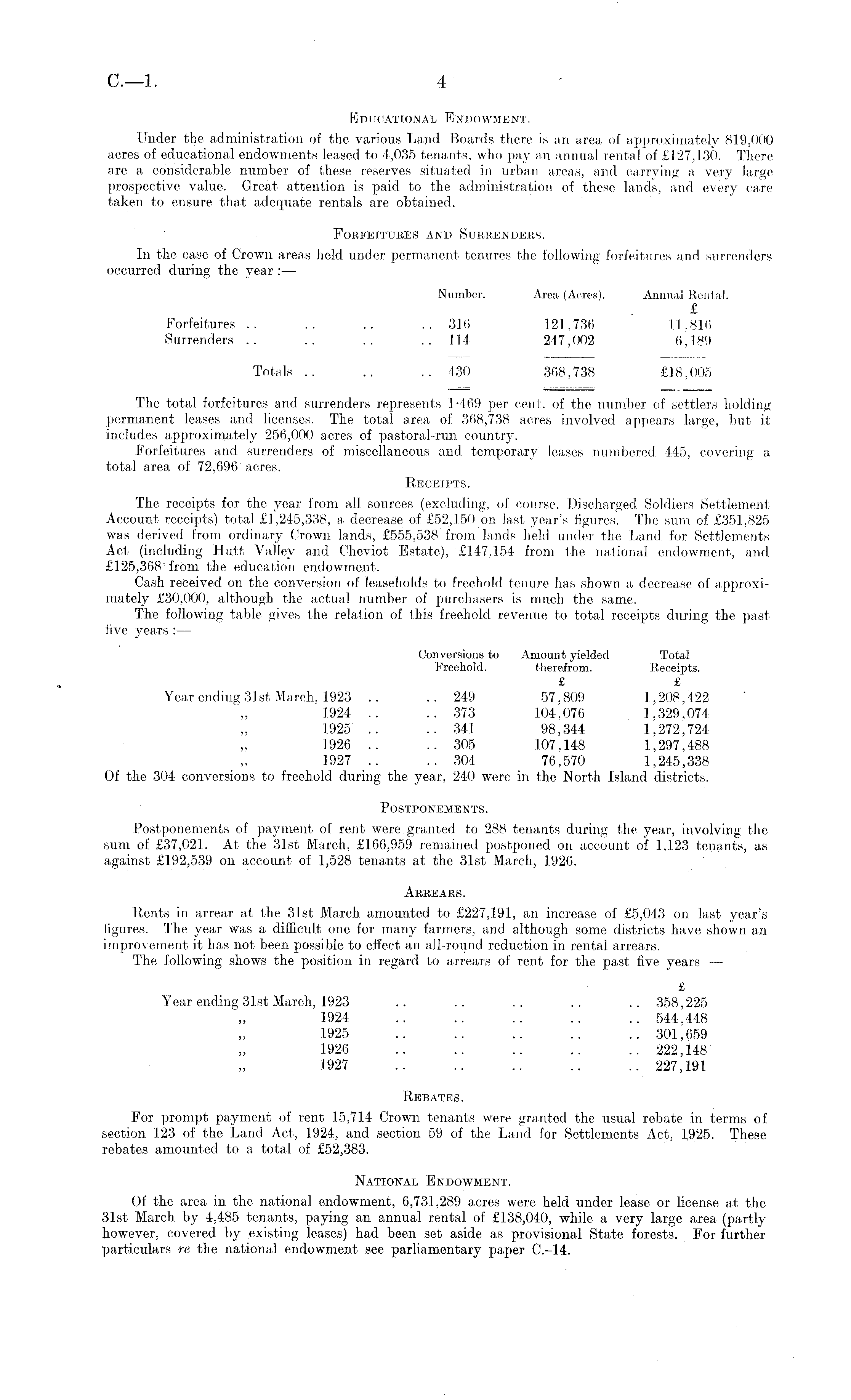 Educational Endowment. Under the administration of the various Land Boards there is an area of approximately 819,000 acres of educational endowments leased to 4,035 tenants, who pay an annual rental of £127,130. There are a considerable number of these reserves situated in urban area's, and carrving a very large prospective value. Great attention is paid to the administration of these lands, and every care taken to ensure that adequate rentals are obtained. Forfeitures and Surrenders. In the case of Crown areas held under permanent tenures the following forfeitures and surrenders occurred during the year : — Number. Area (Acres). Annual Rental. £ Forfeitures .. .. .. .. 316 121,736 11,816 Surrenders .. .. .. .. 114 247,002 6,189 Totals .. .. ..430 368,738 £18,005 The total forfeitures' and surrenders represents 1-469 per cent, of the number of settlers holding permanent leases and licenses. The total area of 368,738 acres involved appears large, but it includes approximately 256,000 acres of pastoral-run country'. Forfeitures and surrenders of miscellaneous and temporary leases numbered 445, covering a total area of 72,696 acres. Receipts. The receipts for the year from all sources (excluding, of course, Discharged Soldiers Settlement Account receipts) total £1,245,338, a decrease of £52,150 on last year's figures. The sum of £351,825 was derived from ordinary Crown lands, £555,538 from lands held under the Land for Settlements Act (including Hutt Valley and Cheviot Estate), £147,154 from the national endowment, and £125,368 from the education endowment. Cash received on the conversion of leaseholds to freehold tenure has shown a decrease of-approxi-mately £30,000, although the actual number of purchasers is much the same. The following table gives the relation of this freehold revenue to total receipts during the past five years : — Conversions to Amount yielded Total Freehold. therefrom. Receipts. £ £ Year ending 31st March, 1923 .. .. 249 57,809 1,208,422 1924 .. ..373 104,076 1,329,074 1925 .. ..341 98,344 1,272,724 1926 .. ..305 107,148 1,297,488 1927 .. ..304 76,570 1,245,338 Of the 304 conversions to freehold, during the year, 240 were in the North Island districts. Postponements. Postponements of payment of rent were granted to 288 tenants during the year, involving the sum of £37,021. At the 31st March, £166,959 remained postponed on account of 1.123 tenants, as against £192,539 on account of 1,528 tenants at the 31st March, 1926. Arrears. Rents in arrear at the 31st March amounted to £227,191, an increase of £5,043 on last year's figures. The year was a difficult one for many farmers, and although some districts have shown an improvement it has not been possible to effect an all-round reduction in rental arrears. The following shows the position in regard to arrears of rent for the past five years — £ Year ending 31st March, 1923 .. .. .. .. .. 358,225 1924 .. .. .. .. .. 544.448 1925 .. .. .. .. .. 301,659 1926 .. .. .. .. .. 222,148 1927 .. .. .. .. .. 227,191 Rebates. For prompt payment of rent 15,714 Crown tenants were granted the usual rebate in terms of section 123 of the Land Act, 1924, and section 59 of the Land for Settlements Act, 1925. These rebates amounted to a total of £52,383. National Endowment. Of the area in the national endowment, 6,731,289 acres were held under lease or license at the 31st March by 4,485 tenants, paying an annual rental of £138,040, while a very large area (partly however, covered by existing leases) had been set aside as provisional State forests. For further particulars re the national endowment see parliamentary paper C.-14.
