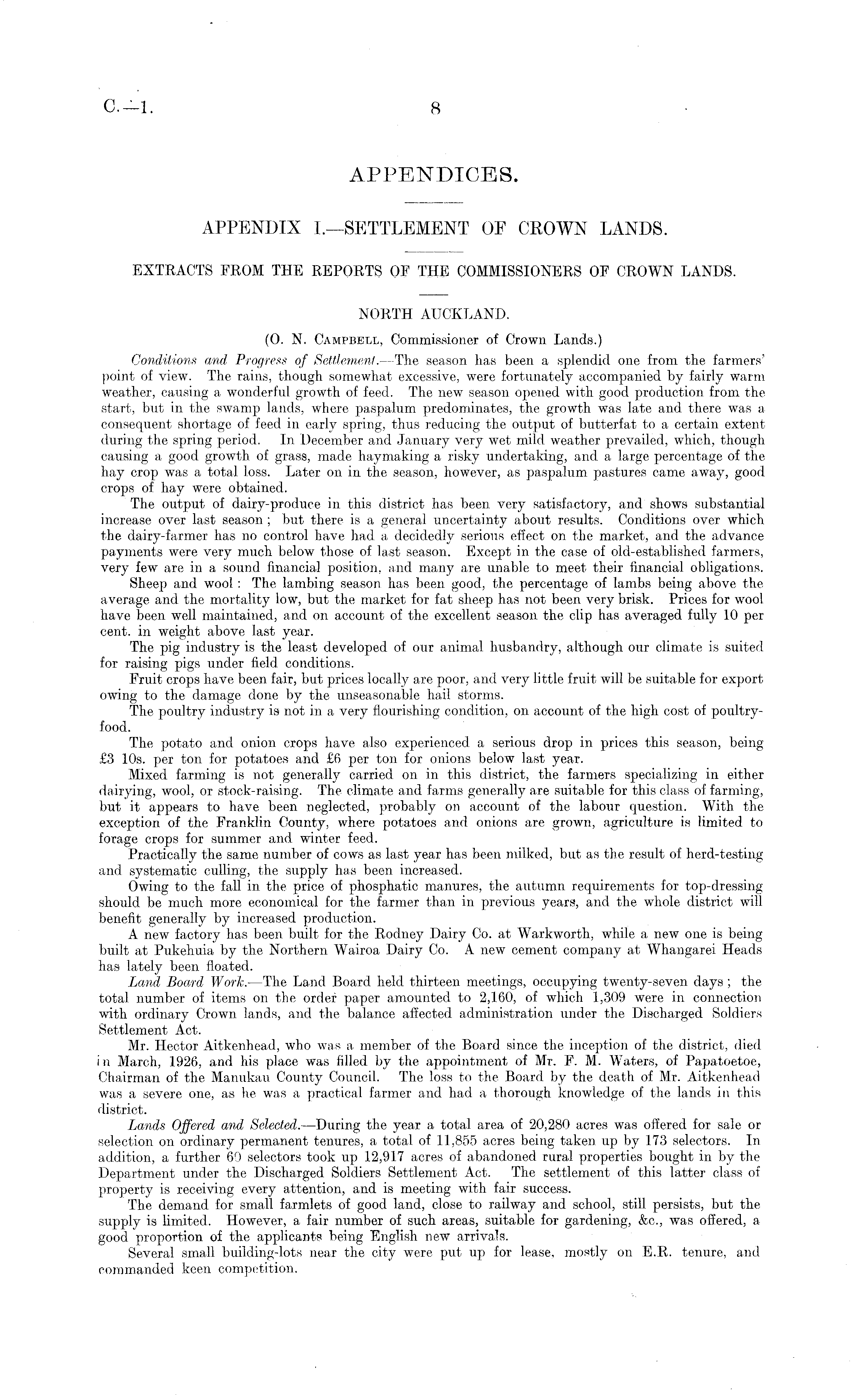 APPENDICES. APPENDIX I.—SETTLEMENT OF CROWN LANDS. EXTRACTS FROM THE REPORTS OF THE COMMISSIONERS OF CROWN LANDS. NORTH AUCKLAND. (0. N. Campbell, Commissioner of Crown Lands.) Conditions and Progress of Settlement.—The season has been a splendid one from the farmers' point of view. The rains, though somewhat excessive, were fortunately accompanied by fairly warm weather, causing a wonderful growth of feed. The new season opened with good production from the start, but in the swamp lands, where paspalum predominates, the growth was late and there was a consequent shortage of feed in early spring, thus reducing the output of butterfat to a certain extent during the spring period. In December and January very wet mild weather prevailed, which, though causing a good growth of grass, made haymaking a risky undertaking, and a large percentage of the hay crop was a total loss. Later on in the season, however, as paspalum pastures came away, good crops of hay were obtained. The output of dairy-produce in this district has been very satisfactory, and shows substantial increase over last season ; but there is a general uncertainty about results. Conditions over which the dairy-farmer has no control have had a decidedly serious effect on the market, and the advance payments were very much below those of last season. Except in the case of old-established farmers, very few are in a sound financial position, and many are unable to meet their financial obligations. Sheep and wool: The lambing season has been good, the percentage of lambs being above the average and the mortality low, but the market for fat sheep has not been very brisk. Prices for wool have been well maintained, and on account of the excellent season the clip has averaged fully 10 per cent, in weight above last year. The pig industry is the least developed of our animal husbandry, although our climate is suited for raising pigs under field conditions. Fruit crops have been fair, but prices locally are poor, and very little fruit will be suitable for export owing to the damage done by the unseasonable hail storms. The poultry industry is not in a very flourishing condition, on account of the high cost of poultryfood. The potato and onion crops have also experienced a serious drop in prices this season, being £3 10s. per ton for potatoes and £6 per ton for onions below last year. Mixed farming is not generally carried on in this district, the farmers specializing in either dairying, wool, or stock-raising. The climate and farms generally are suitable for this class of farming, but it appears to have been neglected, probably on account of the labour question. With the exception of the Franklin County, where potatoes and onions are grown, agriculture is limited to forage crops for summer and winter feed. Practically the same number of cows as last year has been milked, but as the result of herd-testing and systematic culling, the supply has been increased. Owing to the fall in the price of phosphatic manures, the autumn requirements for top-dressing should be much more economical for the farmer than in previous years, and the whole district will benefit generally by increased production. A new factory has been built for the Rodney Dairy Co. at Warkworth, while a new one is being built at Pukehuia by the Northern Wairoa Dairy Co. A new cement company at Whangarei Heads has lately been floated. Land Board Work. —The Land Board held thirteen meetings, occupying twenty-seven days ; the total number of items on the order paper amounted to 2,160, of which 1,309 were in connection with ordinary Crown lands, and the balance affected administration under the Discharged Soldiers Settlement Act. Mr. Hector Aitkenhead, who was a member of the Board since the inception of the district, died i n March, 1926, and his place was filled by the appointment of Mr. F. M. Waters, of Papatoetoe, Chairman of the Manukau County Council. The loss to the Board by the death of Mr. Aitkenhead was a severe one, as he was a practical farmer and had a thorough knowledge of the lands in this district. Lands Offered and Selected.—During the year a total area of 20,280 acres was offered for sale or selection on ordinary permanent tenures, a total of 11,855 acres being taken up by 173 selectors. In addition, a further 69 selectors took up 12,917 acres of abandoned rural properties bought in by the Department under the Discharged Soldiers Settlement Act. The settlement of this latter class of property is receiving every attention, and is meeting with fair success. The demand for small farmlets of good land, close to railway and school, still persists, but the supply is limited. However, a fair number of such areas, suitable for gardening, &c. : was offered, a good proportion of the applicants being English new arrivals. Several small building-lots near the city were put up for lease, mostly on E.R. tenure, and commanded keen competition.