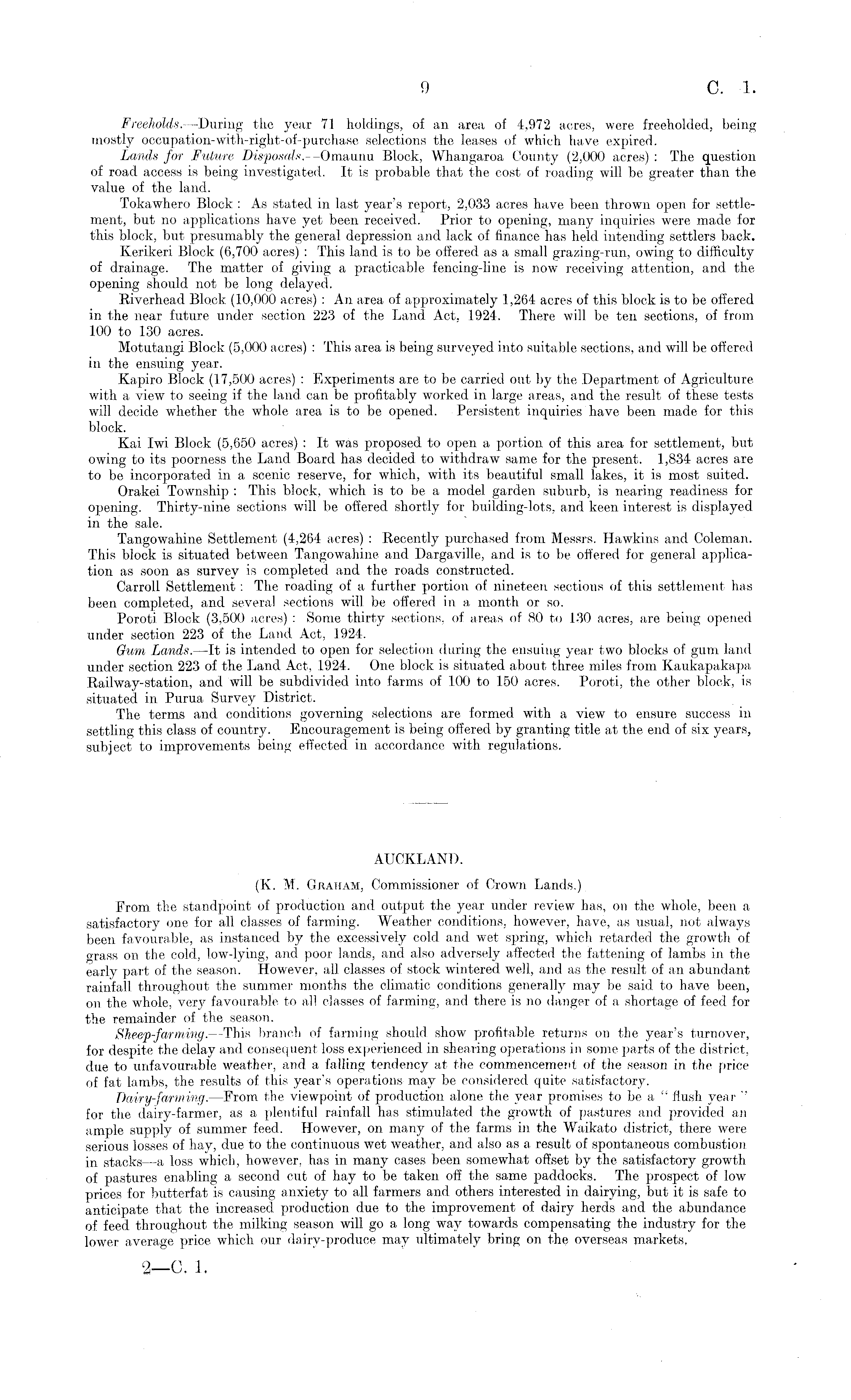 Freeholds. —During the year 71 holdings, of an area of 4,972 acres, were freeholded, being mostly occupation-with-right-of-purchase selections the leases of which have expired. Lands for Future Disposals.- -Omaunu Block, Whangaroa County (2,000 acres) : The question of road access is being investigated. It is probable that the cost of reading will be greater than the value of the land. Tokawhero Block : As stated in last year's report, 2,033 acres have been thrown open for settlement, but no applications have yet been received. Prior to opening, many inquiries were made for this block, but presumably the general depression and lack of finance has held intending settlers back. Kerikeri Block (6,700 acres) : This land is to be offered as a small grazing-run, owing to difficulty of drainage. The matter of giving a practicable fencing-line is now receiving attention, and the opening should not be long delayed. Riverhead Block (10,000 acres) : An area of approximately 1,264 acres of this block is to be offered in the near future under section 223 of the Land Act, 1924. There will be ten sections, of from 100 to 130 acres. Motutangi Block (5,000 acres) : This area is being surveyed into suitable sections, and will be offered in the ensuing year. Kapiro Block (17,500 acres) : Experiments are to be carried out by the Department of Agriculture with a view to seeing if the land can be profitably worked in large areas, and the result of these tests will decide whether the whole area is to be opened. Persistent inquiries have been made for this block. Kai Iwi Block (5,650 acres) : It was proposed to open a portion of this area for settlement, but owing to its poorness the Land Board has decided to withdraw same for the present. .1,834 acres are to be incorporated in a scenic reserve, for which, with its beautiful small lakes, it is most suited. Orakei Township : This block, which is to be a model garden suburb, is nearing readiness for opening. Thirty-nine sections will be offered shortly for building-lots, and keen interest is displayed in the sale. Tangowahine Settlement (4,264 acres) : Recently purchased from Messrs. Hawkins and Coleman. This block is situated between Tangowahine and Dargaville, and is to be offered for general application as soon as survey is completed and the roads constructed. Carroll Settlement: The roading of a further portion of nineteen sections of this settlement has been completed, and several sections will be offered in a month or so. Poroti Block (3,500 acres) : Some thirty sections, of areas of 80 to 130 acres, are being opened under section 223 of the Land Act, 1924. Gum Lands.—lt is intended to open for selection during the ensuing year two blocks of gum land under section 223 of the Land Act, 1924. One block is situated about three miles from Kaukapakapa Railway-station, and will be subdivided into farms of 100 to 150 acres. Poroti, the other block, is situated in Purua Survey District. The terms and conditions governing selections are formed with a view to ensure success in settling this class of country. Encouragement is being offered by granting title at the end of six years, subject to improvements being effected in accordance with regulations. AUCKLAND. (K. M. Graham, Commissioner of Crown Lands.) From the standpoint of production and output the year under review has, on the whole, been a satisfactory one for all classes of farming. Weather conditions, however, have, as usual, not always been favourable, as instanced by the excessively cold and wet spring, which retarded the growth of crass on the cold, low-lying, and poor lands, and also adversely affected the fattening of lambs in the early part of the season. However, all classes of stock wintered well, and as the result of an abundant rainfall throughout the summer months the climatic conditions generally may be said to have been, on the whole, very favourable to all classes of farming, and there is no danger of a shortage of feed for the remainder of the season. Sheep-farming. —This branch of farming should show profitable returns on the year's turnover, for despite the delay and consequent loss experienced in shearing operations in some parts of the district, due to unfavourable weather, and a falling tendency at the commencement of the season in the price of fat lambs, the results of this year's operations may be considered quite satisfactory. Dairy-fanning. —From the viewpoint of production alone the year promises to be a " flush year " for the dairy-farmer, as a plentiful rainfall has stimulated the growth of pastures and provided an ample supply of summer feed. However, on many of the farms in the Waikato district, there were serious losses of hay, due to the continuous wet weather, and also as a result of spontaneous combustion in stacks —a loss which, however, has in many cases been somewhat offset by the satisfactory growth of pastures enabling a second cut of hay to be taken off the same paddocks. The prospect of low prices for butterfat is causing anxiety to all farmers and others interested in dairying, but it is safe to anticipate that the increased production due to the improvement of dairy herds and the abundance of feed throughout the milking season will go a long way towards compensating the industry for the lower average price which our dairy-produce may ultimately bring on the overseas markets.