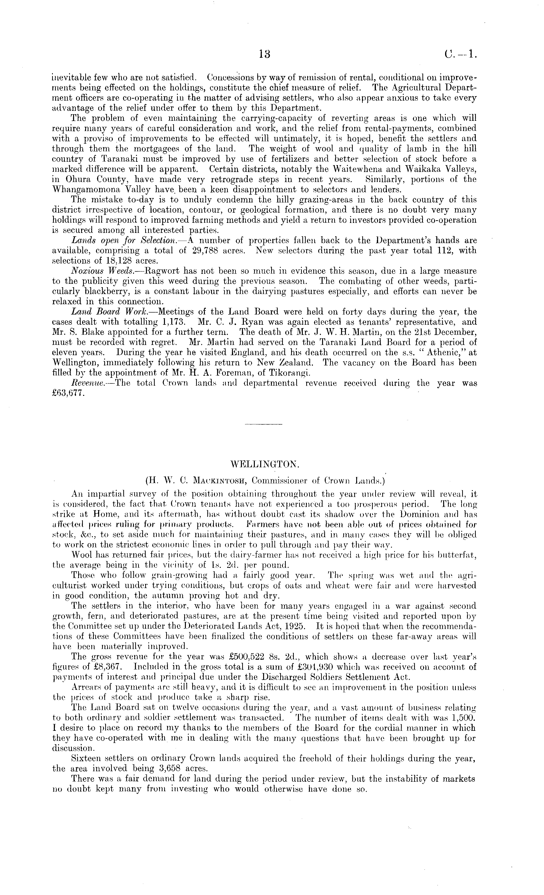 inevitable few who are not satisfied. Concessions by way of remission of rental, conditional 011 improvements being effected on the holdings, constitute the chief measure of relief. The Agricultural Department officers are co-operating in the matter of advising settlers, who also appear anxious to take every advantage of the relief under offer to them by this Department. The problem of even maintaining the carrying-capacity of reverting areas is one which will require many years of careful consideration and work, and the relief from rental-payments, combined with a proviso of improvements to be effected will untimately, it is hoped, benefit the settlers and through them the mortgagees of the land. The weight of wool and quality of lamb in the hill country of Taranaki must be improved by use of fertilizers and better selection of stock before a marked difference will be apparent. Certain districts, notably the Waitewhena and Waikaka Valleys, in Ohura County, have made very retrograde steps in recent years. Similarly, portions of the Whangamomona Valley have, been a keen disappointment to selectors and lenders. The mistake to-day is to unduly condemn the hilly grazing-areas in the back country of this district irrespective of location, contour, or geological formation, and there is no doubt very many holdings will respond to improved farming methods and yield a return to investors provided co-operation is secured among all interested parties. Lands open for Selection. —A number of properties fallen back to the Department's hands are available, comprising a total of 29,788 acres. New selectors during the past year total 112, with selections of 18,128 acres. Noxious Weeds.—Ragwort has not been so much in evidence this season, due in a large measure to the publicity given this weed during the previous season. The combating of other weeds, particularly blackberry, is a constant labour in the dairying pastures especially, and efforts can never be relaxed in this connection. Land Board Work. —Meetings of the Land Board were held on forty days during the year, the cases dealt with totalling 1,173. Mr. C. J. Ryan was again elected as tenants' representative, and Mr. S. Blake appointed for a further term. The death of Mr. J. W. H. Martin, on the 21st December, must be recorded with regret. Mr. Martin had served on the Taranaki Land Board for a period of eleven years. During the year he visited England, and his death occurred on the s.s. " Athenic," at Wellington, immediately following his return to New Zealand. The vacancy on the Board has been filled by the appointment of Mr. H. A. Foreman, of Tikorangi. Revenue. —The total Crown lands and departmental revenue received during the year was £63,677. WELLINGTON. (H. W. C. Mackintosh, Commissioner of Crown Lands.) An impartial survey of the position obtaining throughout the year under review will reveal, it is considered, the fact that Crown tenants have not experienced a too prosperous period. The long strike at Home, and its aftermath, has without doubt cast its shadow over the Dominion and has affected prices ruling for primary products. Farmers have not been able out of prices obtained for stock, &c., to set aside much for maintaining their pastures, and in many cases they will be obliged to work on the strictest economic lines in order to pull through and pay their way. Wool has returned fair prices, but the dairy-farmer has not received a high price for his butterfat, the average being in the vicinity of Is. 2d. per pound. Those who follow grain-growing had a fairly good year. The spring was wet and the agriculturist worked under trying conditions, but crops of oats and wheat were fair and were harvested in good condition, the autumn proving hot and dry. The settlers in the interior, who have been for many years engaged in a war against second growth, fern, and deteriorated pastures, are at the present time being visited and reported upon by the Committee set up under the Deteriorated Lands Act, 1925. It is hoped that when the recommendations of these Committees have been finalized the conditions of settlers on these far-away areas will have been materially improved. The gross revenue for the year was £500,522 Bs. 2d., which shows a decrease over last year's figures of £8,367. Included in the gross total is a sum of £304,930 which was received on account of payments of interest and principal due under the Discharged Soldiers Settlement Act. Arrears of payments are still heavy, and it is difficult to see an improvement in the position unless the prices of stock and produce take a sharp rise. The Land Board sat on twelve occasions during the year, and a vast amount of business relating to both ordinary and soldier settlement was transacted. The number of items dealt with was 1,500. I desire to place on record my thanks to the members of the Board for the cordial manner in which they have co-operated with me in dealing with the many questions that have been brought up for discussion. Sixteen settlers on ordinary Crown la nds acquired the freehold of their holdings during the year, the area involved being 3,658 acres. There was a fair demand for land during the period under review, but the instability of markets no doubt kept many from investing who would otherwise have done so.