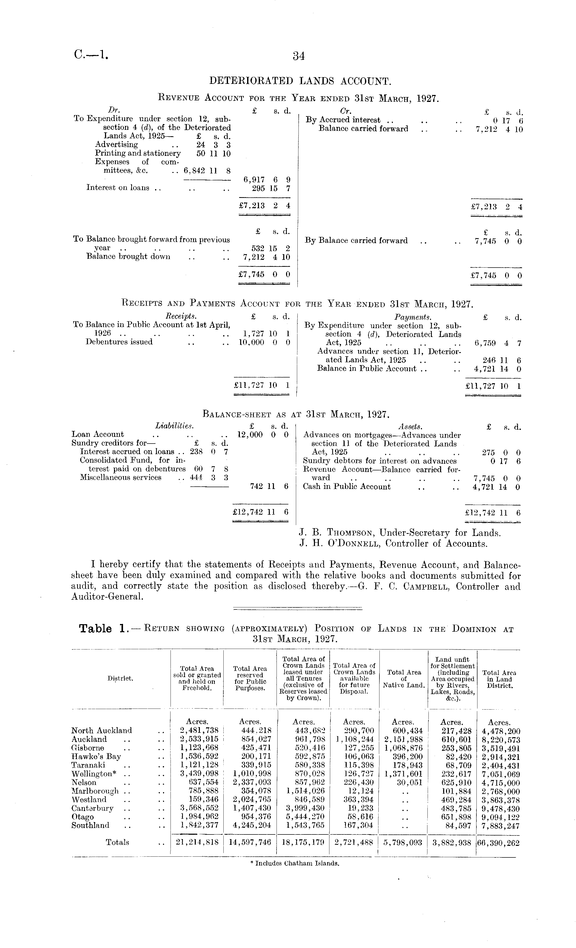 Table 1. —Return showing (approximately) Position of Lands in the Dominion at 31st March, 1927.