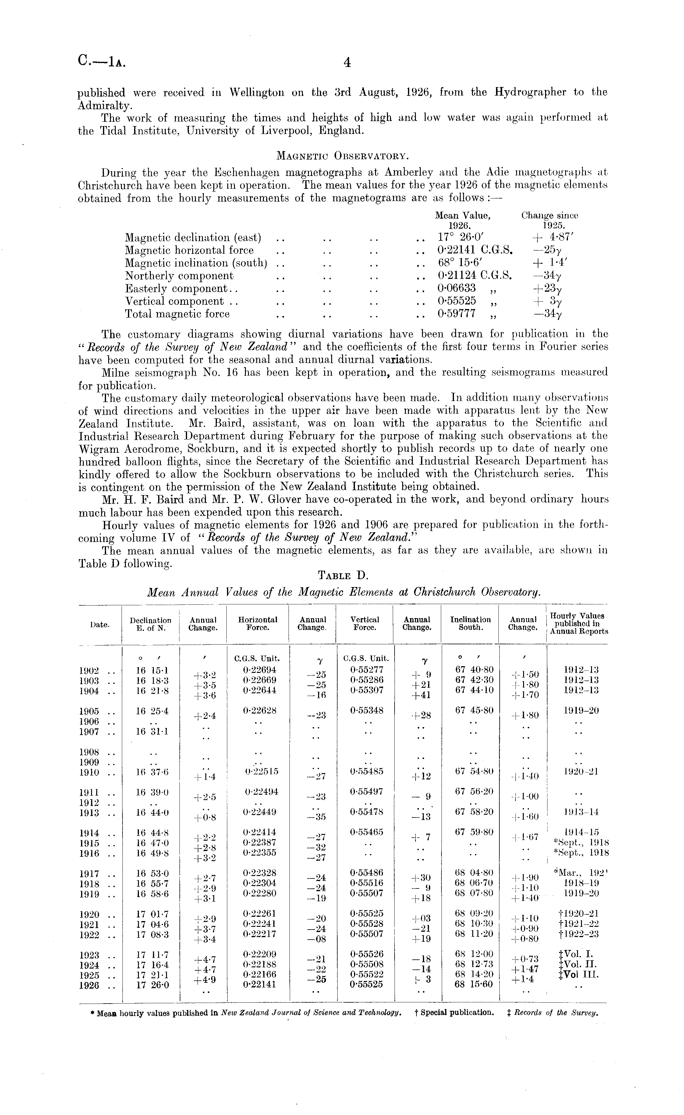 published were received in Wellington on the 3rd August, 1926, from the Hydrographer to the Admiralty. The work of measuring the times and heights of high and low water was again performed at the Tidal Institute, University of Liverpool, England. Magnetic Observatoby. During the year the Eschenhagen magnetographs at Amberley and the Adie magnetographs at Christchurch have been kept in operation. The mean values for the year 1926 of the magnetic elements obtained from the hourly measurements of the magnetograms are as follows : — Mean Value, Change since 1926. 1925. Magnetic declination (east) .. .. .. .. 17° 26-0' + 4-87' Magnetic horizontal force .. .. .. .. 022141 C.G.S. —25y Magnetic inclination (south) .. .. .. .. 68° 15-6' -j- 1-4' Northerly component .. .. .. .. 0-21124 C.G.S, —34y Easterly component. . .. .. .. .. 0-06633 ~ +23y Vertical component .. .. .. .. .. 0-55525 ~ +3y Total magnetic force .. .. .. .. 0-59777 „ —34y The customary diagrams showing diurnal variations have been drawn for publication in the "Records of the Survey of New Zealand" and the coefficients of the first four terms in Fourier series have been computed for the seasonal and annual diurnal variations. Milne seismograph No. .16 has been kept in operation, and the resulting seismograms measured for publication. The customary daily meteorological observations have been made. In addition many observations of wind directions and velocities in the upper air have been made with apparatus lent by the New Zealand Institute. Mr. Baird, assistant, was on loan with the apparatus to the Scientific and Industrial Research Department during February for the purpose of making such observations at the Wigram Aerodrome, Sockburn, and it is expected shortly to publish records up to date of nearly one hundred balloon flights, since the Secretary of the Scientific and Industrial Research Department has kindly offered to allow the Sockburn observations to be included with the Christchurch series. This is contingent on the permission of the New Zealand Institute being obtained. Mr. H. F. Baird and Mr. P. W. Glover have co-operated in the work, and beyond ordinary hours much labour has been expended upon this research. Hourly values of magnetic elements for 1926 and 1906 are prepared for publication in the forthcoming volume IV of " Records of the Survey of New Zealand The mean annual values of the magnetic elements, as far as they are available, are shown in Table D following.