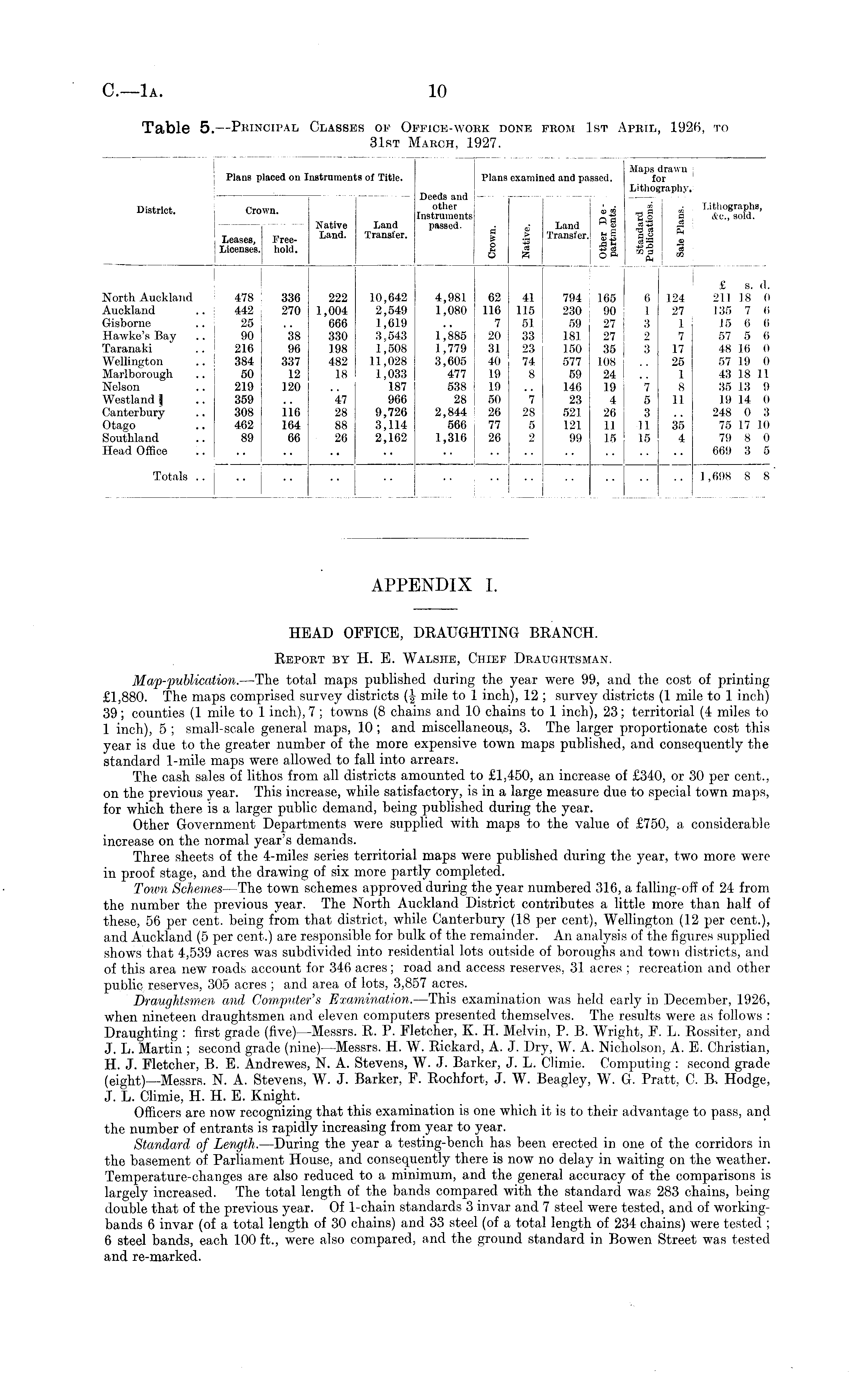 APPENDIX I. HEAD OFFICE, DRAUGHTING BRANCH. Report by H. E. Walshe, Chief Draughtsman. Map-publication. —The total maps published during the year were 99, and the cost of printing £1,880. The maps comprised survey districts (f mile to 1 inch), 12 ; survey districts (1 mile to 1 inch) 39; counties (1 mile to 1 inch), 7 ; towns (8 chains and 10 chains to 1 inch), 23; territorial (4 miles to 1 inch), 5 ; small-scale general maps, 10; and miscellaneous, 3. The larger proportionate cost this year is due to the greater number of the more expensive town maps published, and consequently the standard 1-mile maps were allowed to fall into arrears. The cash sales of lithos from all districts amounted to £1,450, an increase of £340, or 30 per cent., on the previous year. This increase, while satisfactory, is in a large measure due to special town maps, for which there is a larger public demand, being published during the year. Other Government Departments were supplied with maps to the value of £750, a considerable increase on the normal year's demands. Three sheets of the 4-miles series territorial maps were published during the year, two more were in proof stage, and the drawing of six more partly completed. Town Schemes —The town schemes approved during the year numbered 316, a falling-off of 24 from the number the previous year. The North Auckland District contributes a little more than half of these, 56 per cent, being from that district, while Canterbury (18 per cent), Wellington (12 per cent.), and Auckland (5 per cent.) are responsible for bulk of the remainder. An analysis of the figures supplied shows that 4,539 acres was subdivided into residential lots outside of boroughs and town districts, and of this area new roads account for 346 acres; road and access reserves, 31 acres ; recreation and other public reserves, 305 acres ; and area of lots, 3,857 acres. Draughtsmen and Computer's Examination. —This examination was held early in December, 1926, when nineteen draughtsmen and eleven computers presented themselves. The results were as follows : Draughting : first grade (five) —Messrs. R. P. Fletcher, K. H. Melvin, P. B. Wright, F. L. Rossiter, and J. L. Martin ; second grade (nine) —Messrs. H. W. Rickard, A. J. Dry, W. A. Nicholson, A. E. Christian, H. J. Fletcher, B. E. Andrewes, N. A. Stevens, W. J. Barker, J. L. Climie. Computing : second grade (eight)— Messrs. N. A. Stevens, W. J. Barker, F. Rochfort, J. W. Beagley, W. G. Pratt, C. B-. Hodge, J. L. Climie, H. H. E. Knight. Officers are now recognizing that this examination is one which it is to their advantage to pass, and the number of entrants is rapidly increasing from year to year. Standard of Length. —During the year a testing-bench has been erected in one of the corridors in the basement of Parliament House, and consequently there is now no delay in waiting on the weather. Temperature-changes are also reduced to a minimum, and the general accuracy of the comparisons is largely increased. The total length of the bands compared with the standard was 283 chains, being double that of the previous year. Of 1-chain standards 3 invar and 7 steel were tested, and of workingbands 6 invar (of a total length of 30 chains) and 33 steel (of a total length of 234 chains) were tested ; 6 steel bands, each 100 ft., were also compared, and the ground standard in Bowen Street was tested and re-marked.