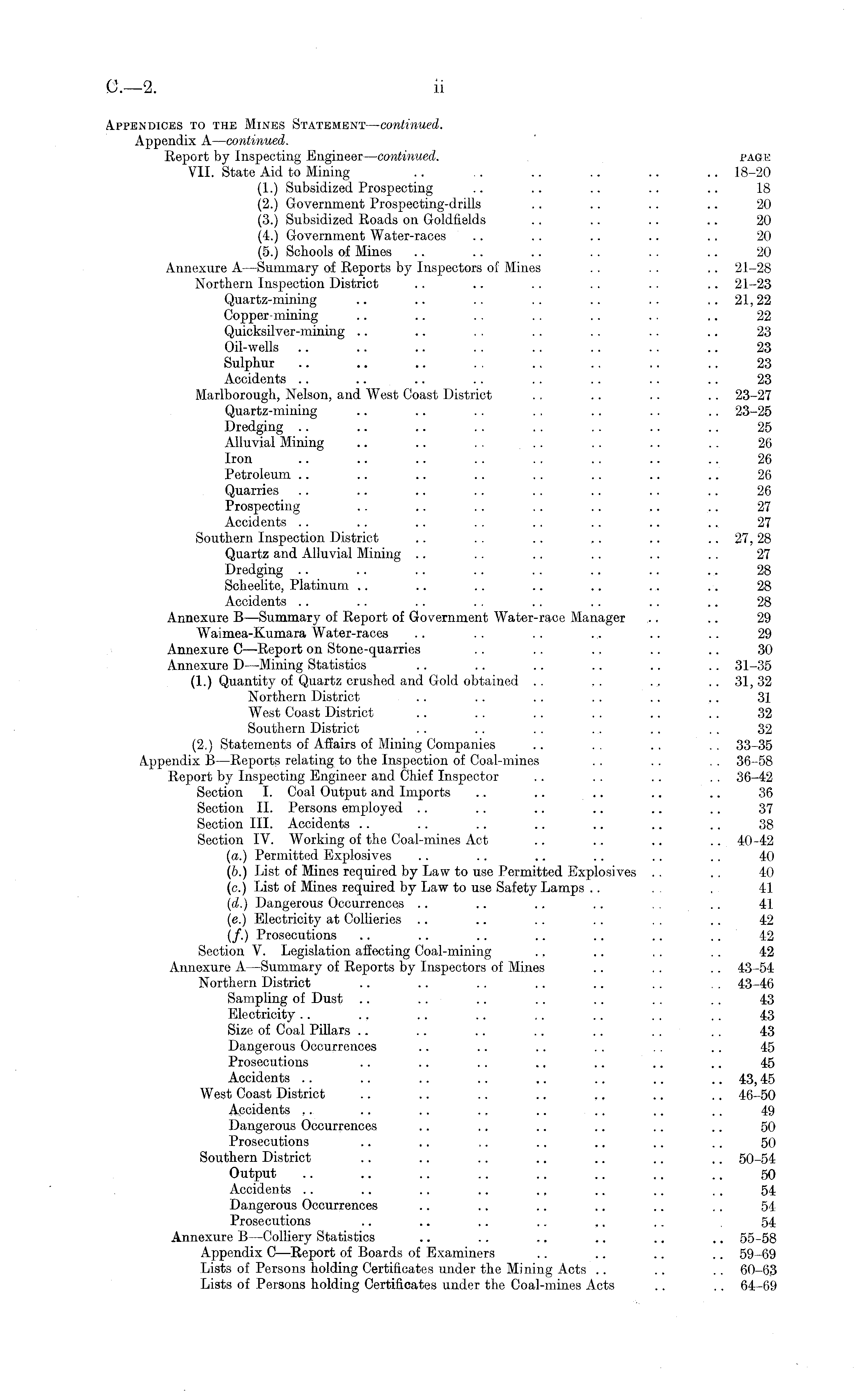 Appendices to the Mines Statement —continued. Appendix A —continued. Report by Inspecting Engineer—continued. page VIL State Aid to Mining .. .. .. .. .. .. 18-20 (1.) Subsidized Prospecting .. .. .. .. .. 18 (2.) Government Prospecting-drills .. .. .. .. 20 (3.) Subsidized Roads on Goldfields .. .. .. .. 20 (4.) Government Water-races .. .. .. .. .. 20 (5.) Schools of Mines ~ ~ .. .. .. .. 20 Annexure A-*—Summary of Reports by Inspectors of Mines .. . . .. 21-28 Northern Inspection District .. .. .. . . .. .. 21-23 Quartz-mining .. .. .. .. .. .. ..21,22 Copper-mining .. .. .. .. .. .. .. 22 Quicksilver-mining .. .. . . .. .. .. .. 23 Oil-wells .. .. .. .. .. .. .. .. 23 Sulphur .. .. .. . . .. .. .. .. 23 Accidents .. .. .. .. .. .. .. .. 23 Marlborough, Nelson, and West Coast District . . .. .. .. 23-27 Quartz-mining .. .. .. .. .. .. .. 23-25 Dredging .. .. .. . . . . .. .. .. 25 Alluvial Mining .. .. . . . . .. .. .. 26 Iron .. .. .. .. .. .. .. ~ 26 Petroleum .. .. .. .. .. .. .. .. 26 Quarries .. .. .. .. .. .. .. .. 26 Prospecting .. .. .. .. .. .. .. 27 Accidents .. .. .. . . .. .. .. .. 27 Southern Inspection District .. . . .. .. .. .. 27, 28 Quartz and Alluvial Mining .. .. .. .. .. .. 27 Dredging .. .. .. .. .. .. .. ... 28 Scheelite, Platinum .. .. .. .. .. .. .. 28 Accidents .. .. .. . . .. .. .. .. 28 Annexure B —Summary of Report of Government Water-race Manager .. .. 29 Waimea-Kumara Water-races .. .. .. ... .. .. 29 Annexure C—Report on Stone-quarries .. .. .. .. .. 30 Annexure D —Mining Statistics .. .. .. .. .. .. 31-35 (1.) Quantity of Quartz crushed and Gold obtained .. .. ~ ~ 31, 32 Northern District .. .. .. .. .. .. 31 West Coast District .. .. .. . . .. .. 32 Southern District .. .. .. .. .. .. 32 (2.) Statements of Affairs of Mining Companies .. . . , . . . 33-35 Appendix B —Reports relating to the Inspection of Coal-mines . . . . . . 36-58 Report by Inspecting Engineer and Chief Inspector .. . . .. . . 36-42 Section I. Coal Output and Imports .. .. .. .. .. 36 Section 11. Persons employed .. .. .. .. .. .. 37 Section 111. Accidents .. .. .. .. .. .. .. 38 Section IV. Working of the Coal-mines Act .. .. .. .. 40-42 (a.) Permitted Explosives .. .. .. .. .. .. 40 (b.) List of Mines required by Law to use Permitted Explosives .. .. 40 (c.) List of Mines required by Law to use Safety Lamps .. . 41 (d.) Dangerous Occurrences .. .. .. .. . . .. 41 (■e.) Electricity at Collieries .. .. .. . . . . .. 42 (/.) Prosecutions .. .. .. .. .. .. .. 42 Section V. Legislation affecting Coal-mining .. .. .. .. 42 Annexure A—Summary of Reports by Inspectors of Mines .. . . .. 43-54 Northern District .. .. .. .. .. .. . . 43-46 Sampling of Dust .. .. .. .. .. .. . . 43 Electricity .. .. .. .. .. .. . . .. 43 Size of Coal Pillars .. .. .. .. .. . . . . 43 Dangerous Occurrences .. .. .. . . .. 45 Prosecutions .. .. .. .. .. .. .. 45 Accidents .. .. .. .. .. .. .. .. 43,45 West Coast District .. .. .. .. ~ .. .. 46-50 Accidents ~ .. .. .. .. .. .. .. 49 Dangerous Occurrences .. .. .. .. .. .. 50 Prosecutions .. .. .. .. .. .. .. 50 Southern District .. .. .. .. .. .. .. 50-54 Output .. .. .. .. .. .. .. .. 50 Accidents .. .. .. .. ~ .. .. .. 54 Dangerous Occurrences .. .. .. .. .. .. 54 Prosecutions .. .. .. .. ~ ~ 54 Annexure B —Colliery Statistics .. .. ~ .. .. .. 55-58 Appendix C —Report of Boards of Examiners .. .. .. .. 59-69 Lists of Persons holding Certificates under the Mining Acts .. .. .. 60-63 Lists of Persons holding Certificates under the Coal-mines Acts .. .. 64-69