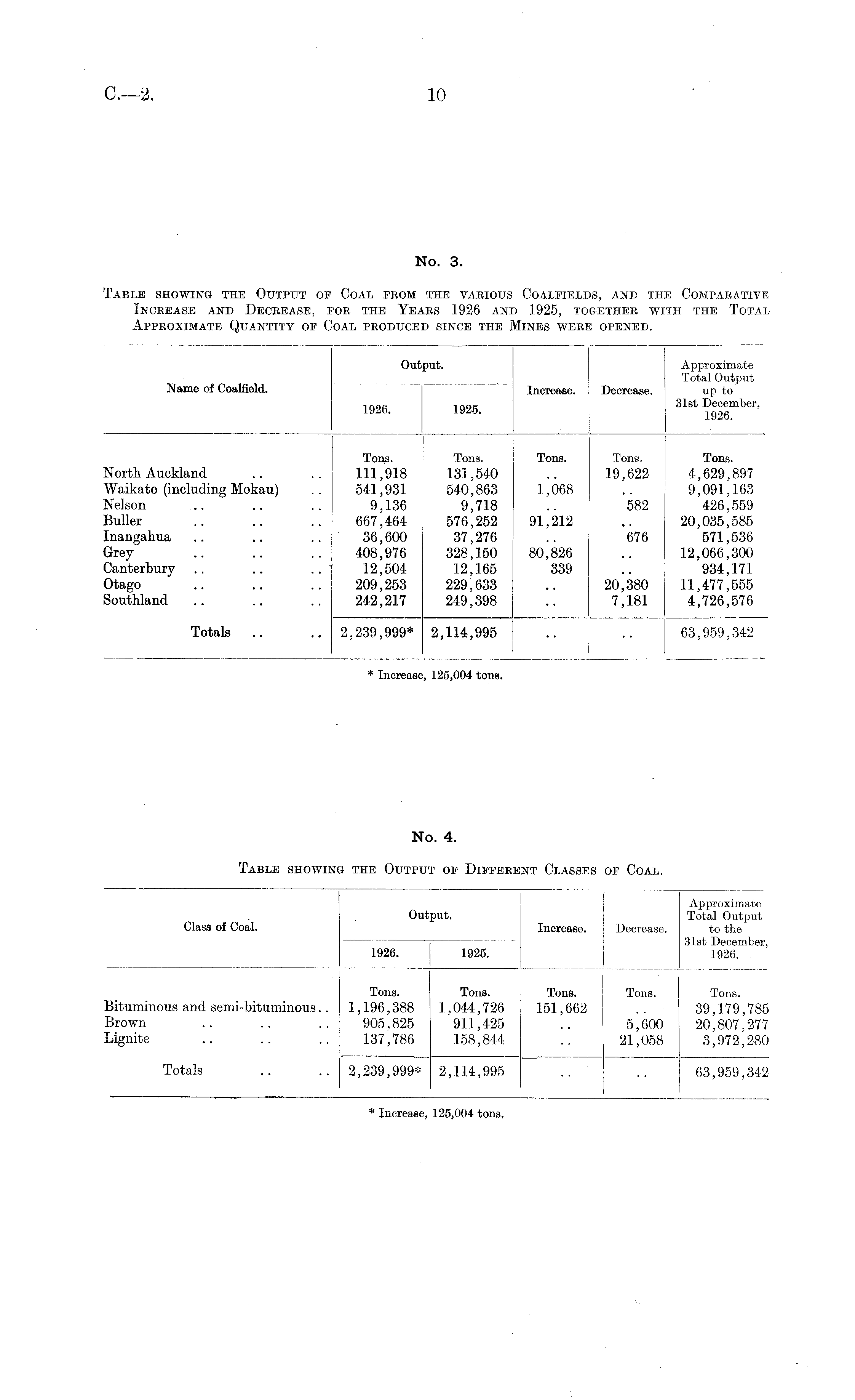 No. 3. Table showing the Output of Coal from the various Coalfields, and the Comparative Increase and Decrease, for the Years 1926 and 1925, together with the Total Approximate Quantity of Coal produced since the Mines were opened.