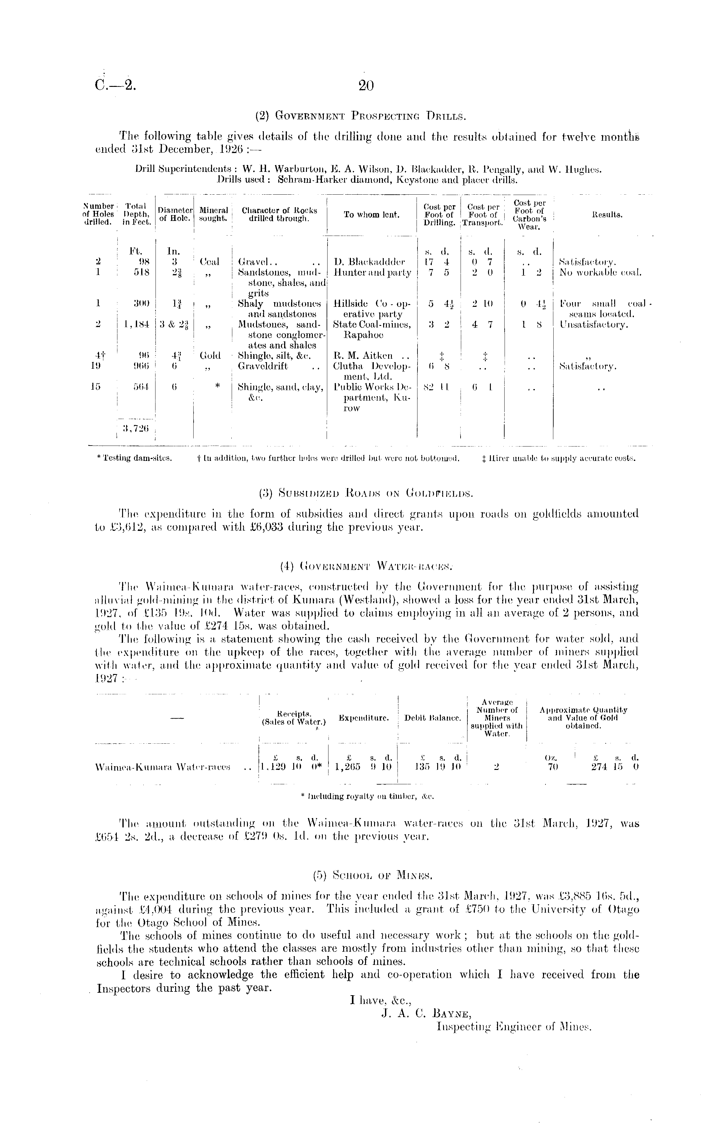 (2) Government Prospecting Drills. The following table gives details of the drilling done and the resxdts obtained for twelve months ended 31st December, 1926 :—