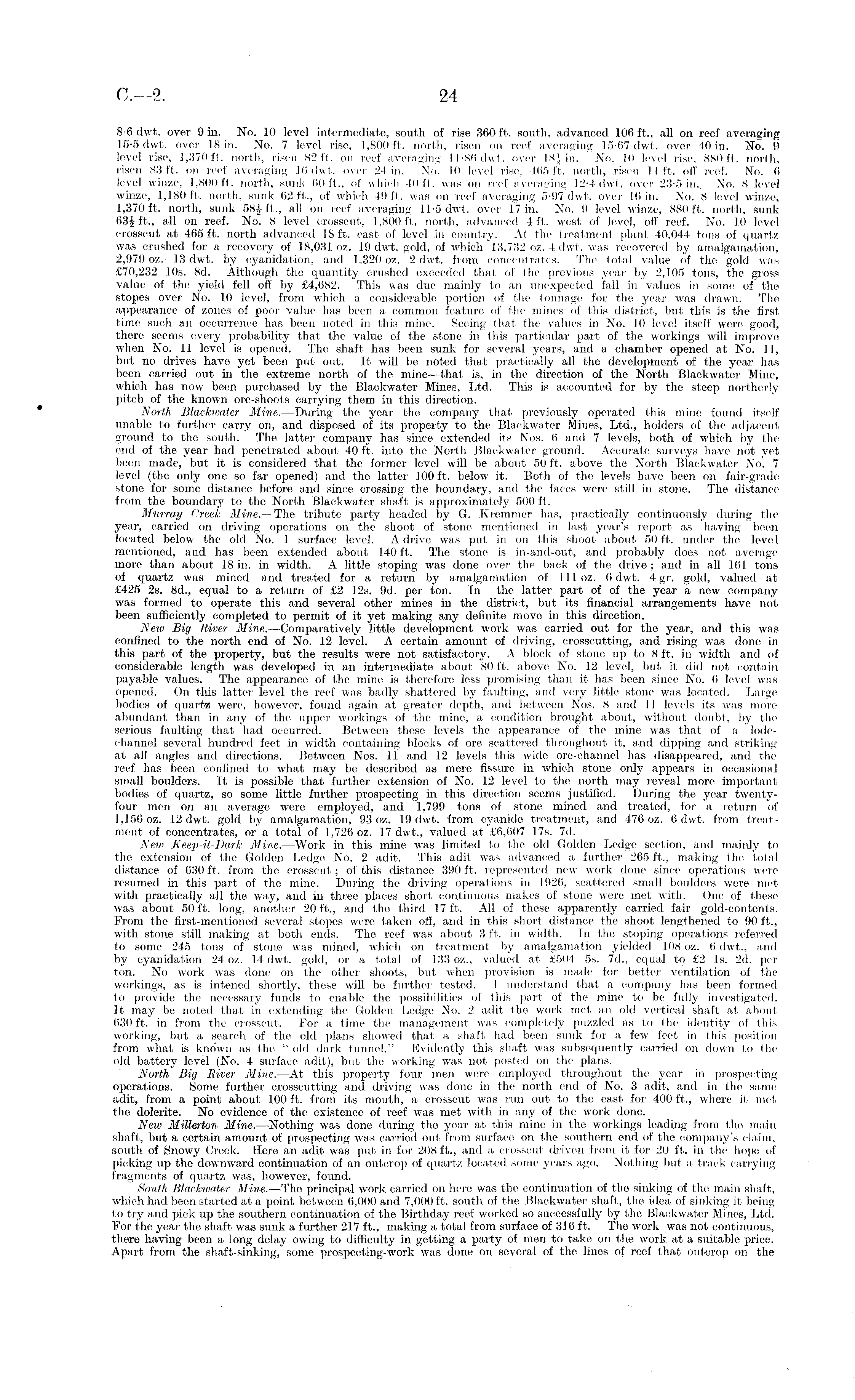 8-6 dwt. over 9 in. No. 10 level intermediate, south of rise 360 ft. south, advanced 106 ft., all on reef averaging 15*5 dwt. over 18 in. No. 7 level rise, 1,800 ft. north, risen on reef averaging 15-67 dwt. over 40 in. No. 9 level rise, 1,370 ft. north, risen 82 ft . on reef averaging 11-86 dwt. over 18| in. No. 10 level rise, 880 ft. north, risen 83 ft. on reef averaging 16 dwt. over 24 in. No. 10 level rise. 465 ft. north, risen li ft, off reef. No. 6 level winze, 1,800 ft. north, sunk 60 ft., of which 40 ft. was on reef averaging 12*4 dwt. over 23-5 in.. No. 8 level winze, 1,180 ft. north, sunk 62 ft., of which 49 ft. was on reef averaging 5-97 dwt. over 16 in. No. 8 level winze, 1,370 ft. north, sunk 58|-ft., all on reef averaging 11-5 dwt. over 17 in. No. 9 level winze, 880 ft. north, sunk ■63J ft., all on reef. No. 8 level crosscut, 1,800 ft. north, advanced 4 ft. west of level, oft' reef. No. 10 level crosscut at 465 ft. north advanced IS ft. east of level in country. At the treatment plant 40,044 tons of quartz was crushed for a recovery of 18,031 oz. 19 dwt. gold, of which 13,732 oz. 4 dwt. was recovered by amalgamation, 2,979 oz. 13 dwt. by cyanidation, and 1,320 oz. 2 dwt. from concentrates. The total value of the gold was £70,232 10s. Bd. Although the quantity crushed exceeded that of the previous year by 2,105 tons, the gross value of the yield fell oft by £4,682. This was due mainly to an unexpected fall in values in some of the stopes over No. 10 level, from which a considerable portion of the tonnage for the year was drawn. The appearance of zones of poor value has been a common feature of the mines of this district, but this is the first time such an occurrence has been noted in this mine. Seeing that the values in No. 10 level itself were good, there seems every probability that the value of the stone in this particular part of the workings will improve when No. 11 level is opened. The shaft has been sunk for several years, and a chamber opened at No. 11, but no drives have yet been put out. It will be noted that practically all the development of the year has been carried out in the extreme north of the mine—that is, in the direction of the North Black water Mine, which has now been purchased by the Blackwater Mines, Ltd. This is accounted for by the steep northerly pitch of the known ore-shoots carrying them in this direction. North Blackwater Mine. —During the year the company that previously operated this mine found itself unable to further carry on, and disposed of its property to the Blackwater Mines, Ltd., holders of the adjacent ground to the south. The latter company has since extended its Nos. 6 and 7 levels, both of which by the end of the year had penetrated about 40 ft. into the North Blackwater ground. Accurate surveys have not yet been made, but it is considered that the former level will be about 50 ft. above the North Blackwater No. 7 level (the only one so far opened) and the latter 100 ft. below it. Both of the levels have been on fair-grade stone for some distance before and since crossing the boundary, and the faces were still in stone. The distance from the boundary to the North Blackwater shaft is approximately 500 ft. Murray Creek Mine. —The tribute party headed by G. Kremmer has, practically continuously during the year, carried on driving operations on the shoot of stone mentioned in last year's report as having been located below the old No. 1 surface level. A drive was put in on this shoot about 50 ft. under the level mentioned, and has been extended about 140 ft. The stone is in-and-out, and probably does not average more than about 18 in. in width. A little stoping was done over the back of the drive; and in all 161 tons of quartz was mined and treated for a return by amalgamation of 111 oz. 6 dwt. 4 gr. gold, valued at £425 2s. Bd., equal to a return of £2 12s. 9d. per ton. In the latter part of of the year a new company was formed to operate this and several other mines in the district, but its financial arrangements have not been sufficiently completed to permit of it yet making any definite move in this direction. New Big River Mine.—Comparatively little development work was carried out for the year, and this was confined to the north end of No. 12 level. A certain amount of driving, crosscut/ting, and rising was done in this part of the property, but the results were not satisfactory. A block of stone up to 8 ft. in width and of considerable length was developed in an intermediate about 80 ft. above No. 12 level, but it did not contain payable values. The appearance of the mine is therefore less promising than it has been since No. 6 level was opened. On this latter level the reef was badly shattered by faulting, and very little stone was located. Large bodies of quartz were, however, found again at greater depth, and between Nos. 8 and 11 levels its was more abundant than in any of the upper workings of the mine, a condition brought about, without doubt, by the serious faulting that had occurred. Between these levels the appearance of the mine was that of a lodechannel several hundred feet in width containing blocks of ore scattered throughout it, and dipping and striking at all angles and directions. Between Nos. 11 and 12 levels this wide ore-channel has disappeared, and the reef has been confined to what may be described as mere fissure in which stone only appears in occasional small boulders. It is possible that further extension of No. 12 level to the north may reveal more important bodies of quartz, so some little further prospecting in this direction seems justified. During the year twenty - four men on an average were employed, and 1,799 tons of stone mined and treated, for a return of 1,156 oz. 12 dwt. gold by amalgamation, 93 oz. 19 dwt. from cyanide treatment, and 476 oz. 6 dwt. from treatment of concentrates, or a total of 1,726 oz. 17 dwt., valued at £6,607 17s. 7d. New Keep-it-Darlc Mine.- —Work in this
