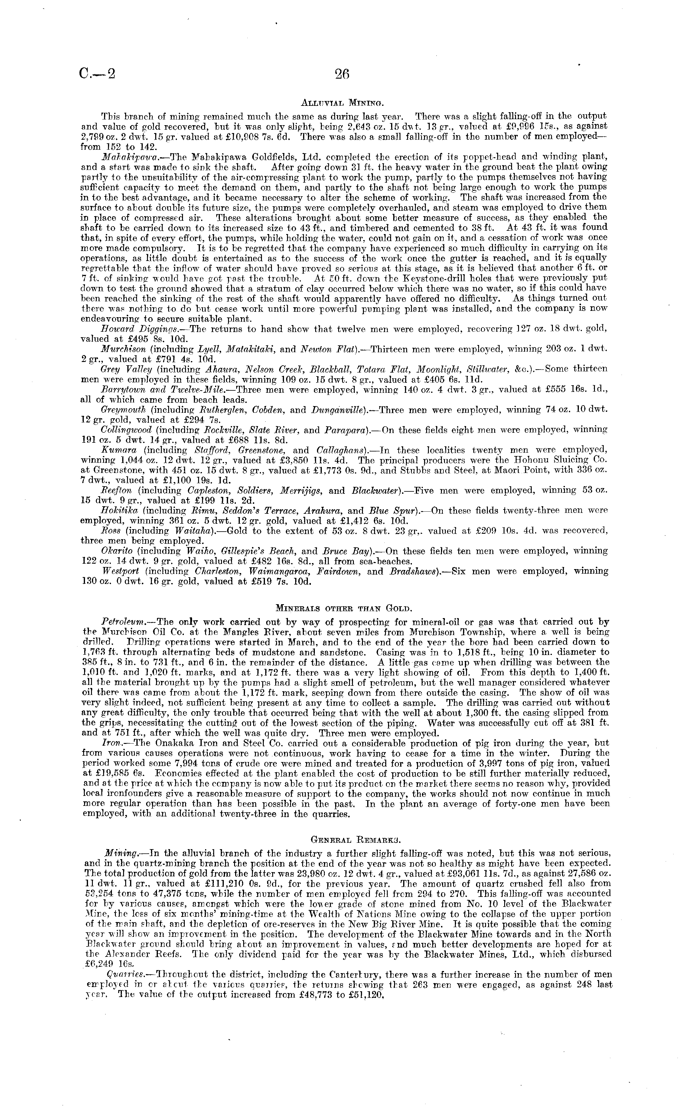 Allttvtal Mining. This branch of mining remained much the same as during last. year. There was a slight falling-off in the output and value of gold recovered, hut it was only slight, being 2,643 oz. 15 dvt. 13 gr., valued at £9,996 155., as against 2,799 oz. 2 dwt. 15 gr. valued at £10,908 7s. 6d. There was also a small falling-off in the number of men employed.— from 152 to 142. Mahalcipau-a.—The Mahakipawa Goldfields, Ltd. completed the erection of its poppet-head and winding plant, and a start was made to sink the shaft. After going down 31 ft. the heavy water in the ground beat the plant, owing partly to the unsuitability of the air-compressing plant to work the pump, partly to the pumps themselves not having sufficient capacity to meet the demand on them, and partly to the shaft not being large enough to work the pumps in to the best advantage, and it became necessary to alter the scheme of working. The shaft was increased from the surface to about double its future size, the pumps were completely overhauled, and steam was employed to drive them in place of compressed air. These alterations brought about some better measure of success, as they enabled the shaft to be carried down to its increased size to 43 ft., and timbered and cemented to 38 ft. At 43 ft. it was found that, in spite of every effort, the pumps, while holding the water, could not gain on it, and a cessation of work was once more made compulsory. It is to be regretted that the company have experienced so much difficulty in carrying on its operations, as little doubt is entertained as to the success of the work once the gutter is reached, and it is equally regrettable that, the inflow of water should have proved so serious at this stage, as it is believed that another 6 ft. or 7 ft. of sinking would have got past the trouble. At £0 ft. down the Keystone-drill holeß that were previously put down to test the ground showed that a stratum of clay occurred below which there was no water, so if this could have been reached the sinking of the rest of the shaft would apparently have offered no difficulty. As things turned out there was nothing to do but cease work until more powerful pumping plant was installed, and the company is now endeavouring to secure suitable plant. Howard Diggings.—The returns to hand show that twelve men were employed, recovering 127 oz. 18 dwt. gold, valued at £495 Bs. lOd. Murchison (including Lyett, MataMtaM, and Newton Flat). —Thirteen men were employed, winning 203 oz. 1 dwt. 2 gr., valued at £791 4s. 10d. Grey Valley (including Ahaura, Nelson Creel, Blackball, Totara Flat, Moonlight, Stillwater, Ac.). —Some thirteen men were employed in these fields, winning 109 oz. 15 dwt. Bgr., valued at £405 6s. lid. Barrytown and Twelve-Mile.-—Three men were employed, winning 140 oz. 4 dwt. 3gr., valued at £555 16s. id., all of which came from beach leads. Greymouth (including Rutherglen, Cobden, and Dunganville).—Three men were employed, winning 74 oz. 10 dwt. 12 gr. gold, valued at £294 7s. Collivgwood (including Rockville, Slate River, and Parapara).—On these fields eight men were employed, winning 191 oz. 5 dwt. 14 gr., valued at £688 lis. Bd. Kuwara (including Stafford, Greenstone, and Callaghans).—ln these localities twenty men were employed, winning 1,044 oz. 12 dwt. 12 gr., valued at £3,850 lis. 4d. The principal producers were the Hohonu Sluicing 00. at Greenstone, with 451 oz. 15 dwt. 8 gr., valued at £1,773 os. 9d., and Stubbs and Steel, at Maori Point, with 336 oz. 7 dwt., valued at £1,100 19s. Id. Reefton (including Capleston, Soldiers, Merrijigs, and Blackwater). —Five men were employed, winning 53 oz. 15 dwt. 9 gr., valued at £199 lis. 2d. Tlokitika (including Rimu, Seddon's Terrace, Arahura, and Blue Spur).—On these fields twenty-three men were employed, winning 361 oz. 5 dwt. 12 gr. gold, valued at £1,412 6s. lOd. Ross (including Waitaha). —Gold to the extent of 53 oz. 8 dwt. 23 gr,. valued at £209 10s. 4d. was recovered, three men being employed. Olearito (including Waiho, Gillespie's Beach, and Bruce Bay).—On these fields ten men were employed, winning 122 oz. 14 dwt. 9 gr. gold, valued at £482 16s. Bd., all from sea-beaches. Westport (including Charleston, Waimangaroa, Fairdown, and Bradshaws). —Six men were employed, winning 130 oz. 0 dwt. 16 gr. gold, valued at £519 7s. lOd. Minerals other than Gold. Petroleum.—The only work carried out by way of prospecting for mineral-oil or gas was that carried out by the Murchison Oil Co. at. the Mangles Biver, about seven miles from Murchison Township, where a well is being drilled. Drilling operations were started in March, and to the end of the year the bore had been carried down to 1,763 ft. through alternating beds of mudstone and sandstone. Casing was in to 1,518 ft., being 10 in. diameter to 385 ft., 8 in. to 731 ft., and 6 in. the remainder of the distance. A little gas came up when drilling was between the 1,010 ft. and 1,020 ft. marks, and at 1,172 ft. there was a very light showing of oil. From this depth to 1,400 ft. all the material brought up by the pumps had a slight smell of petroleum, but the well manager considered whatever oil there was came from about the 1,172 ft. mark, seeping down from there outside the casing. The show of oil was very slight indeed, not sufficient being present at any time to collect a sample. The drilling was carried out without any great difficulty, the only trouble that occurred being that with the well at about 1,300 ft. the casing slipped from the grips, necessitating the cutting out of the lowest section of the piping. Water was successfully cut off at 381 ft. and at 751 ft., after which the well was quite dry. Three men were employed. Iron.—The Onakaka Iron and Steel Co. carried out a considerable production of pig iron during the year, but from various causes operations were not continuous, work having to cease for a time in the winter. During the per