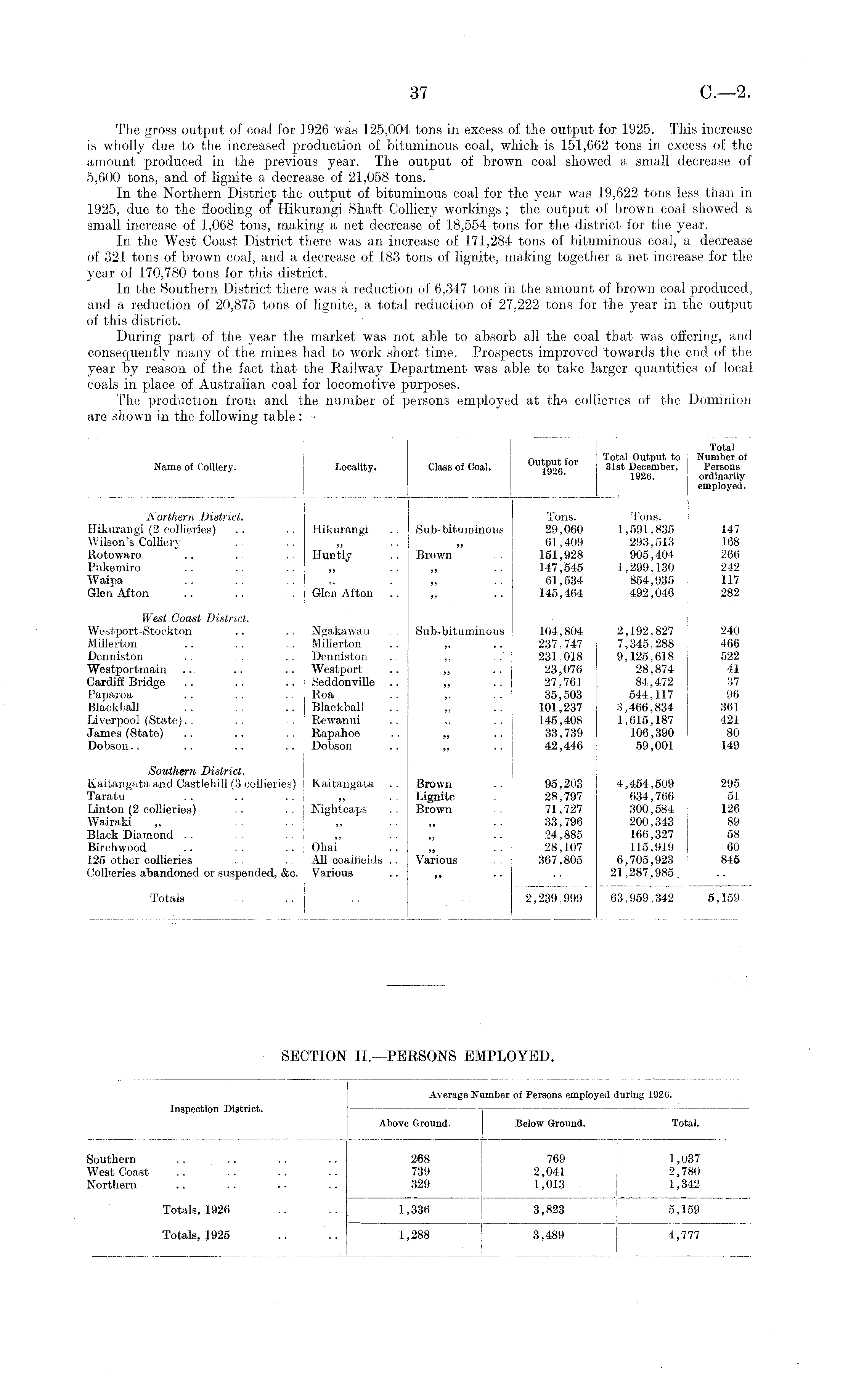 The gross output of coal for 1926 was 125,004 tons in excess of the output for 1925. Tliis increase is wholly due to the increased production of bituminous coal, which is 151,662 tons in excess of the amount produced in the previous year. The output of brown coal showed a small decrease of 5,600 tons, and of lignite a decrease of 21,058 tons. In the Northern District the output of bituminous coal for the year was 19,622 tons less than in 1925, due to the flooding of Hikurangi Shaft Colliery workings ; the output of brown coal showed a small increase of 1,068 tons, making a net decrease of 18,554 tons for the district for the year. In the West Coast District there was an increase of 171,284 tons of bituminous coal, a decrease of 321 tons of brown coal, and a decrease of 183 tons of lignite, making together a net increase for the year of 170,780 tons for this district. In the Southern District there was a reduction of 6,347 tons in the amount of brown coal produced, and a reduction of 20,875 tons of lignite, a total reduction of 27,222 tons for the year in the output of this district. During part of the year the market was not able to absorb all the coal that was offering, and consequently many of the mines had to work short time. Prospects improved towards the end of the year by reason of the fact that the Railway Department was able to take larger quantities of local coals in place of Australian coal for locomotive purposes. The production from and the number of persons employed at the collieries of the Dominion are shown in the following table: —