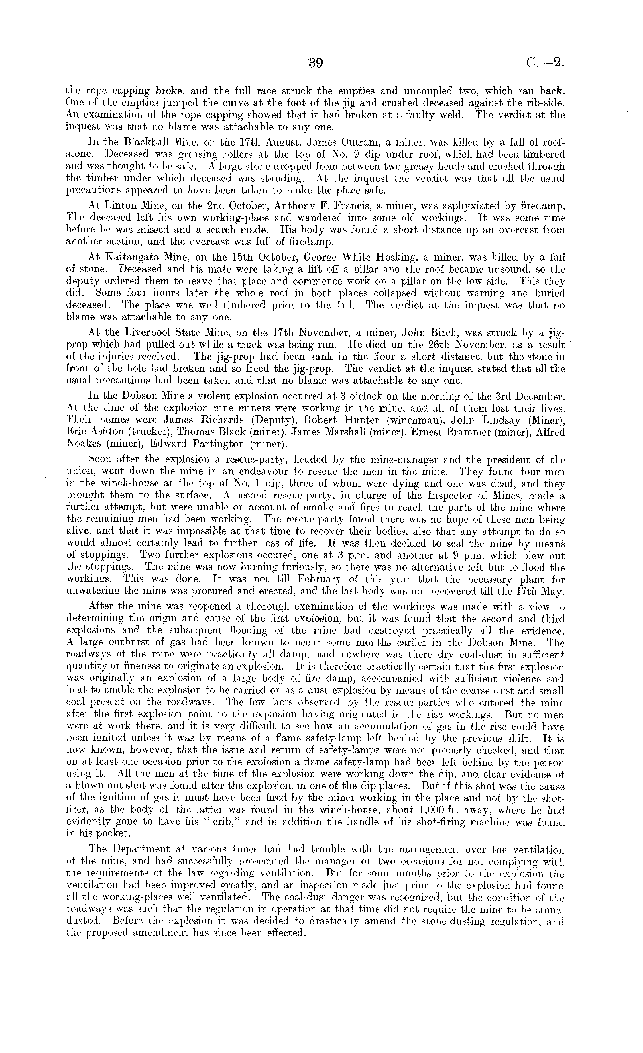 the rope capping broke, and the full race struck the empties and uncoupled two, which ran back. One of the empties jumped the curve at the foot of the jig and crushed deceased against the rib-side. An examination of the rope capping showed that it had broken at a faulty weld. The verdict at the inquest was that no blame was attachable to any one. In the Blackball Mine, on the 17tli August, James Outram, a miner, was killed by a fall of roofstone. Deceased was greasing rollers at the top of No. 9 dip under roof, which had been timbered and was thought to be safe. A large stone dropped from between two greasy heads and crashed through the timber under which deceased was standing. At the inquest the verdict was that all the usual precautions appeared to have been taken to make the place safe. At Linton Mine, on the 2nd October, Anthony F. Francis, a miner, was asphyxiated by firedamp. The deceased left his own working-place and wandered into some old workings. It was some time before he was missed and a search made. His body was found a short distance up an overcast from another section, and the overcast was full of firedamp. At Kaitangata Mine, on the 15th October, George White Hosking, a miner, was killed by a fall of stone. Deceased and his mate were taking a lift off a pillar and the roof became unsound, so the deputy ordered them to leave that place and commence work on a pillar on the low side. This they did. Some four hours later the whole roof in both places collapsed without warning and buried deceased. The place was well timbered prior to the fall. The verdict at the inquest was that no blame was attachable to any one. At the Liverpool State Mine, on the 17th November, a miner, John Birch, was struck by a jigprop which had pulled out while a truck was being run. He died on the 26th November, as a result of the injuries received. The jig-prop had been sunk in the floor a short distance, but the stone in front of the hole had broken and so freed the jig-prop. The verdict at the inquest stated that all the usual precautions had been taken and that no blame was attachable to any one. In the Dobson Mine a violent explosion occurred at 3 o'clock on the morning of the 3rd December. At the time of the explosion nine miners were working in the mine, and all of them lost their lives. Their names were James Richards (Deputy), Robert Hunter (winchman), John Lindsay (Miner), Eric Ashton (trucker), Thomas Black (miner), James Marshall (miner), Ernest Brammer (miner), Alfred Noakes (miner), Edward Partington (miner). Soon after the explosion a rescue-party, headed by the mine-manager and the president of the union, went down the mine in an endeavour to rescue the men in the mine. They found four men in the winch-house at the top of No. 1 dip, three of whom were dying and one was dead, and they brought them to the surface. A second rescue-party, in charge of the Inspector of Mines, made a further attempt, but were unable on account of smoke and fires to reach the parts of the mine where the remaining men had been working. The rescue-party found there was no hope of these men being alive, and that it was impossible at that time to recover their bodies, also that any attempt to do so would almost certainly lead to further loss of life. It was then decided to seal the mine by means of stoppings. Two further explosions occured, one at 3 p.m. and another at 9 p.m. which blew out the stoppings. The mine was now burning furiously, so there was no alternative left but to flood the workings. This was done. It was not till February of this year that the necessary plant for unwatering the mine was procured and erected, and the last body was not recovered till the 17th May. After the mine was reopened a thorough examination of the workings was made with a view to determining the origin and cause of the first explosion, but it was found that the second and third explosions and the subsequent flooding of the mine had destroyed practically all the evidence. A large outburst of gas had been known to occur some months earlier in the Dobson Mine. The roadways of the mine were practically all damp, and nowhere was there dry coal-dust in sufficient quantity or fineness to originate an explosion. It is therefore practically certain that the first explosion was originally an explosion of a large body of fire damp, accompanied with sufficient violence and heat to enable the explosion to be carried on as a dust-explosion by means of the coarse dust and small coal present on the roadways. The few facts observed by the rescue-parties who entered the mine after the first explosion point to the explosion having originated in the rise workings. But no men were at work there, and it is very difficult to see how an accumulation of gas in the rise could have been ignited unless it was by means of a flame safety-lamp left behind by the previous shift. It is now known, however, that the issue and return of safety-lamps were not properly checked, and that on at least one occasion prior to the explosion a flame safety-lamp had been left behind by the person using it. All the men at the time of the explosion were working down the dip, and clear evidence of a blown-out shot was found after the explosion, in one of the dip places. But if this shot was the cause of the ignition of gas it must have been fired by the miner working in the place and not by the shotfirer, as the body of the latter was found in the winch-house, about 1,000 ft. away, where he had evidently gone to have his " crib," and in addition the handle of Ms shot-firing machine was found in his pocket. The Department at various times had had trouble with the management over the ventilation of the mine, and had successfully prosecuted the manager on two occasions for not complying with the requirements of the law regarding ventilation. But for some months prior to the explosion the ventilation had been improved greatly, and an inspection made just prior to the explosion 
