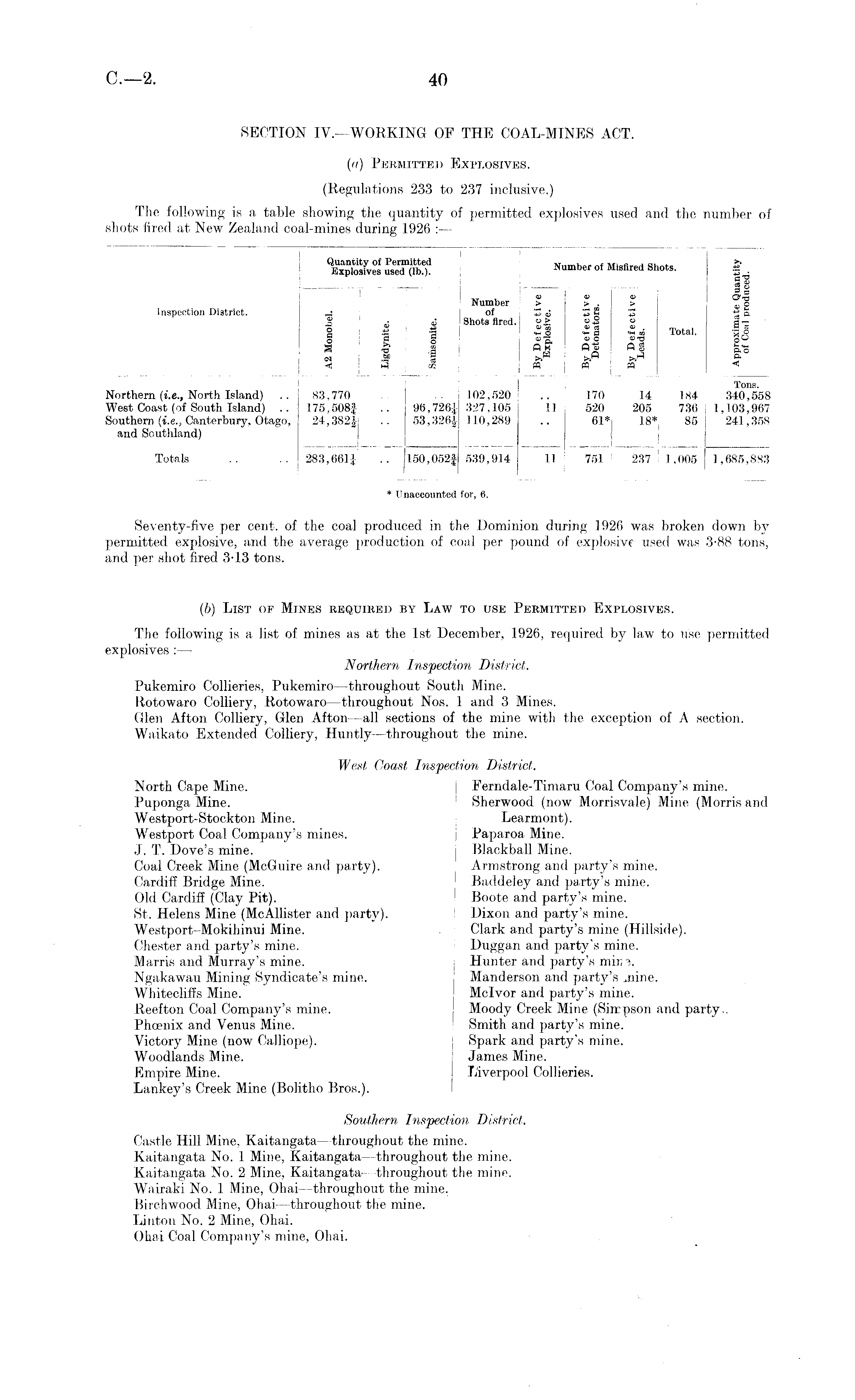 SECTION IV. —WORKING OF THE COAL-MINES ACT. (a) Permitted Explosives. (Regulations 233 to 237 inclusive.) The following is a table showing the quantity of permitted explosives used and the number of shots fired at New Zealand coal-mines during 1926 : —